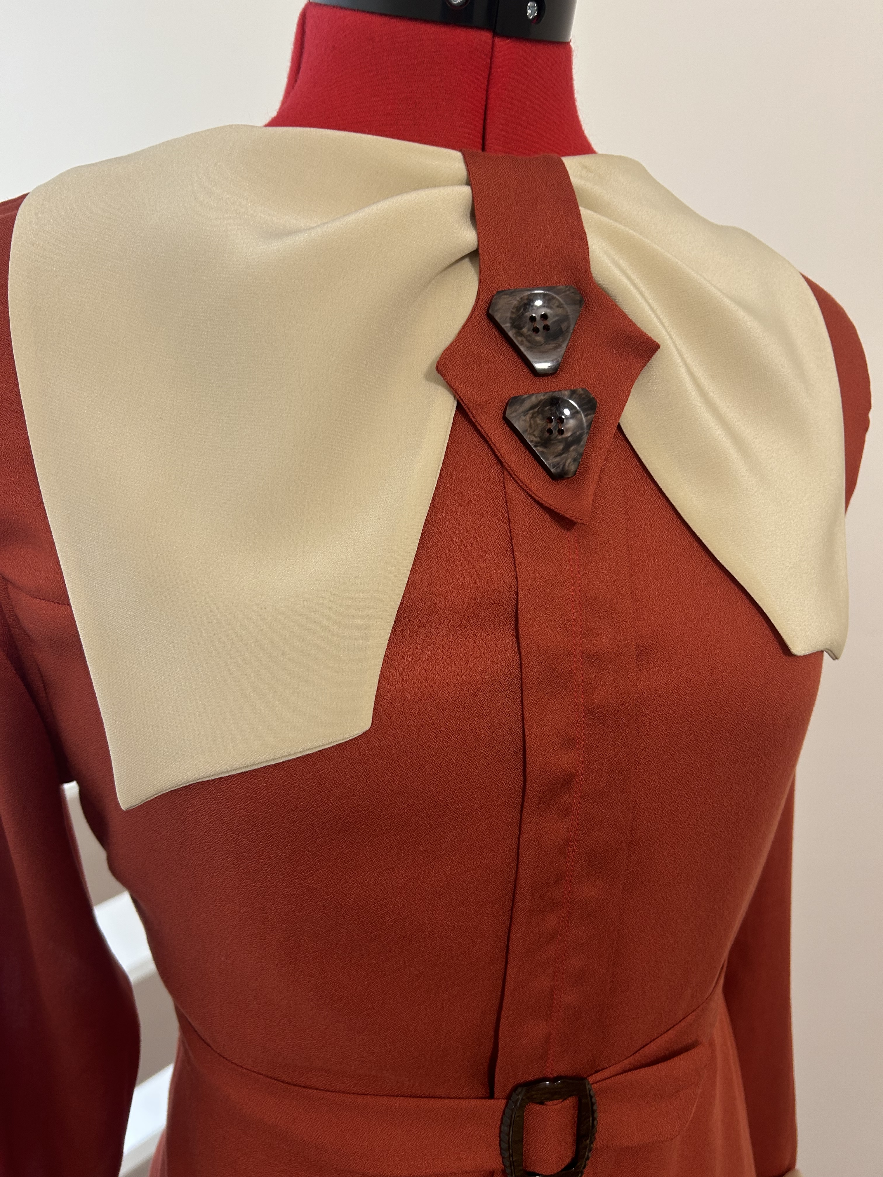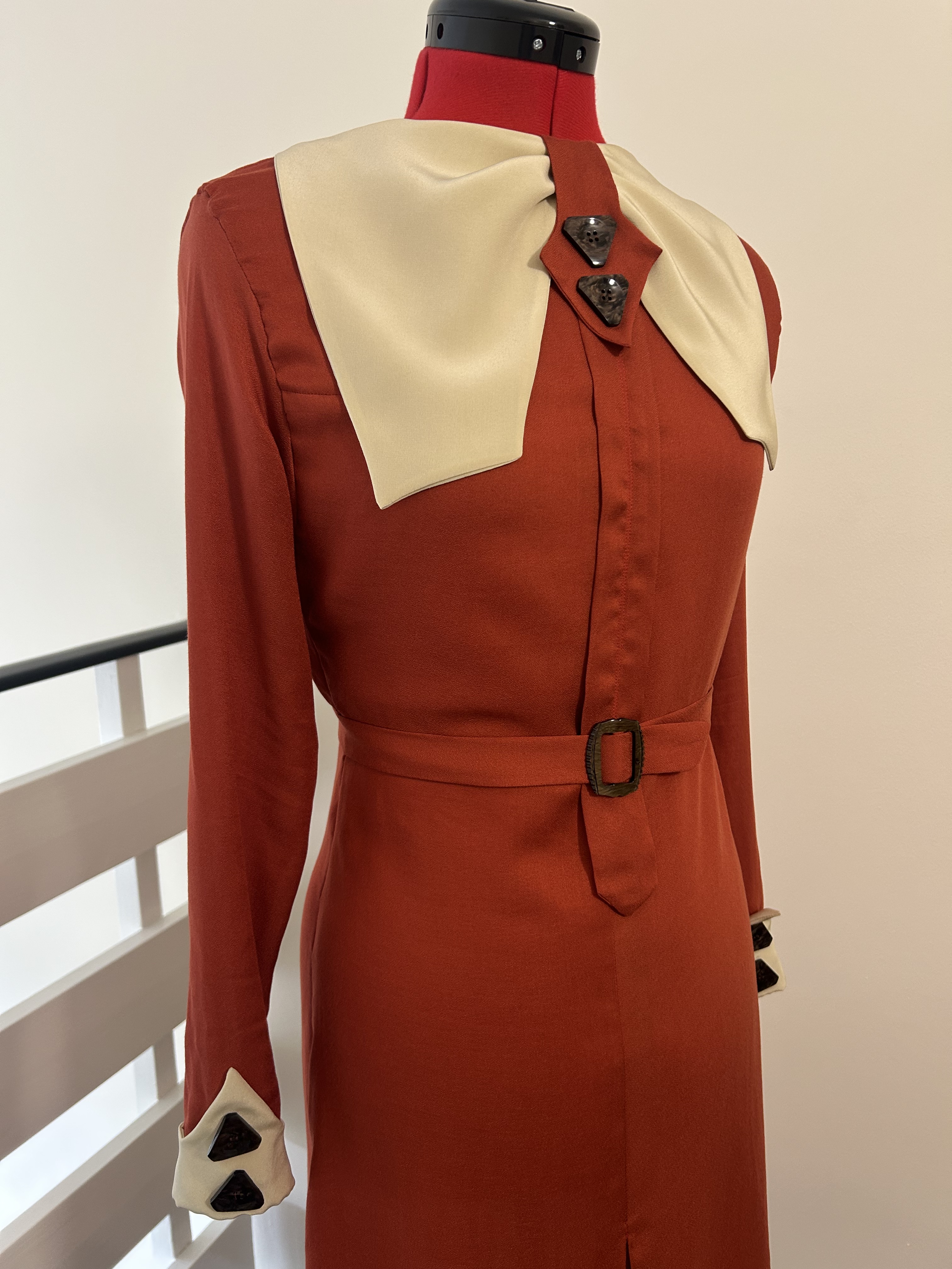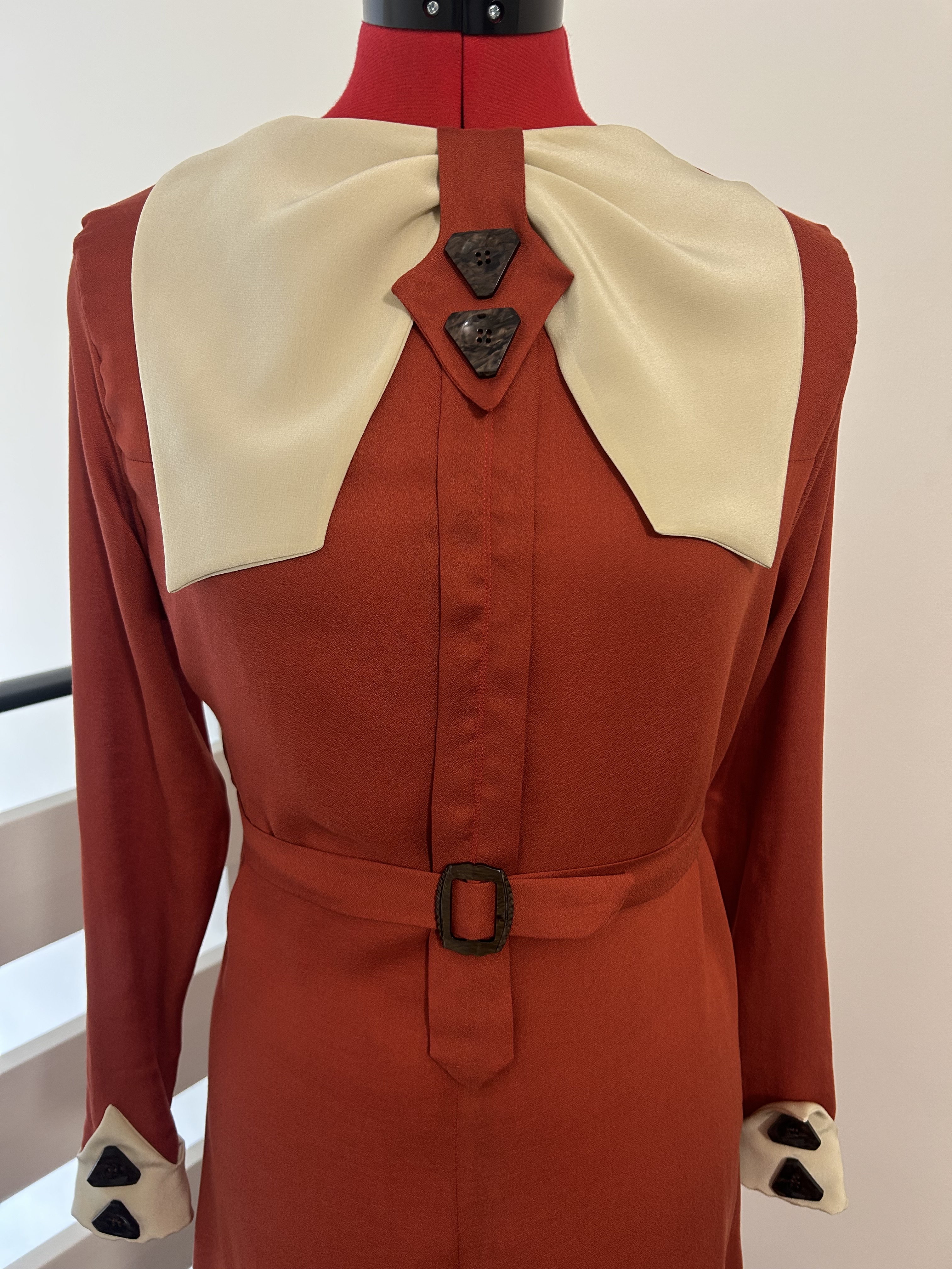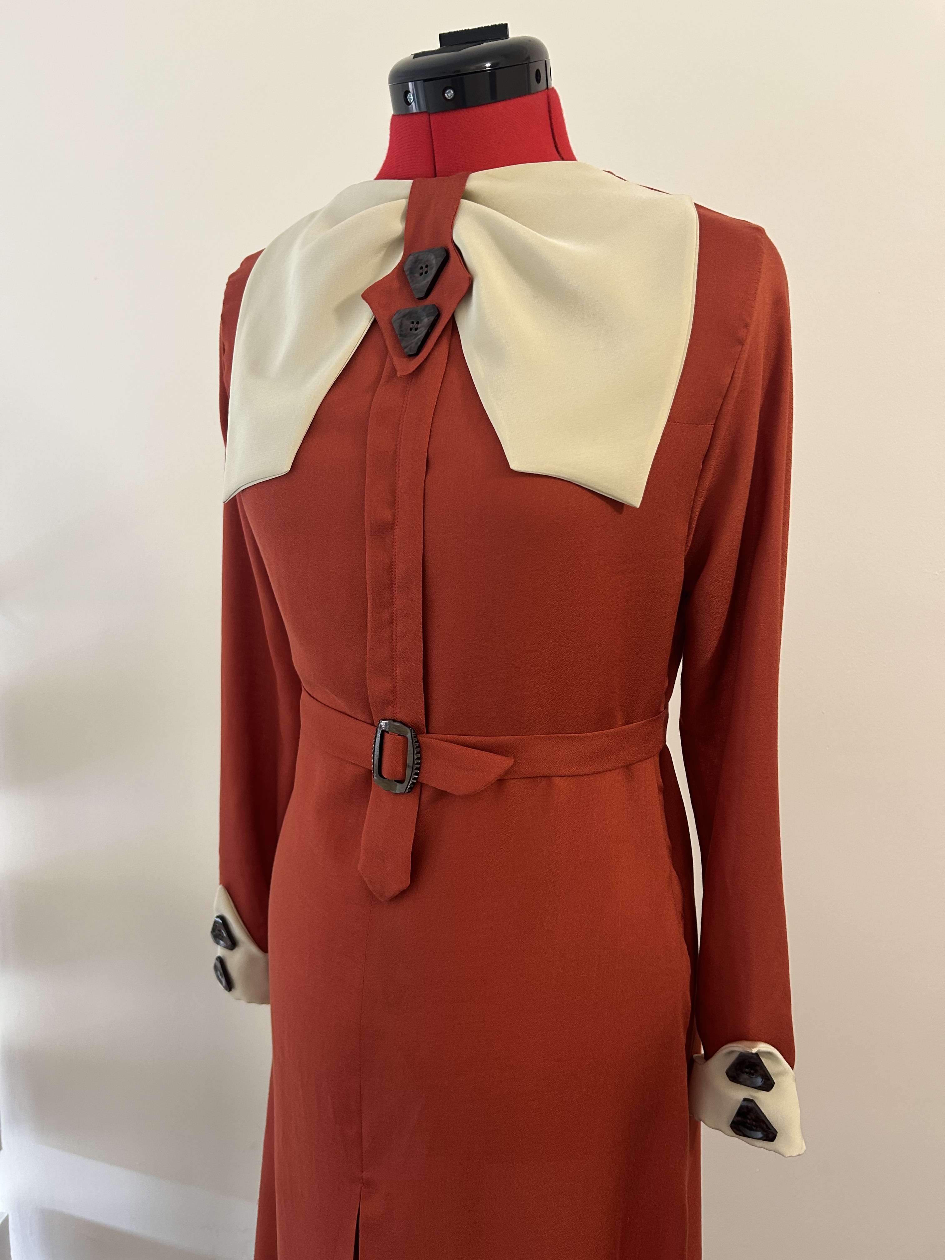 This early 1930s inspired burnt orange viscose rayon crepe beauty has all the elements of a dress of the era, with its long narrow sleeves that feature cream silk crepe de chine cuffs adorned with two triangle vintage bakelite buttons, also emphasising the triangle shape of the cuffs. Another set of buttons can be seen on the triangle shape flap on top of the collar holding together an impressive crepe de chine large bow which is attached to the shoulder seams of the bodice. Another noteworthy detail is the tie sewn on the central seam. The skirt features a long kick pleat. The collar fastens with hook and eye at the back. The belt features a bakelite buckle. The dress fastens with snap fasterners at the side seam.