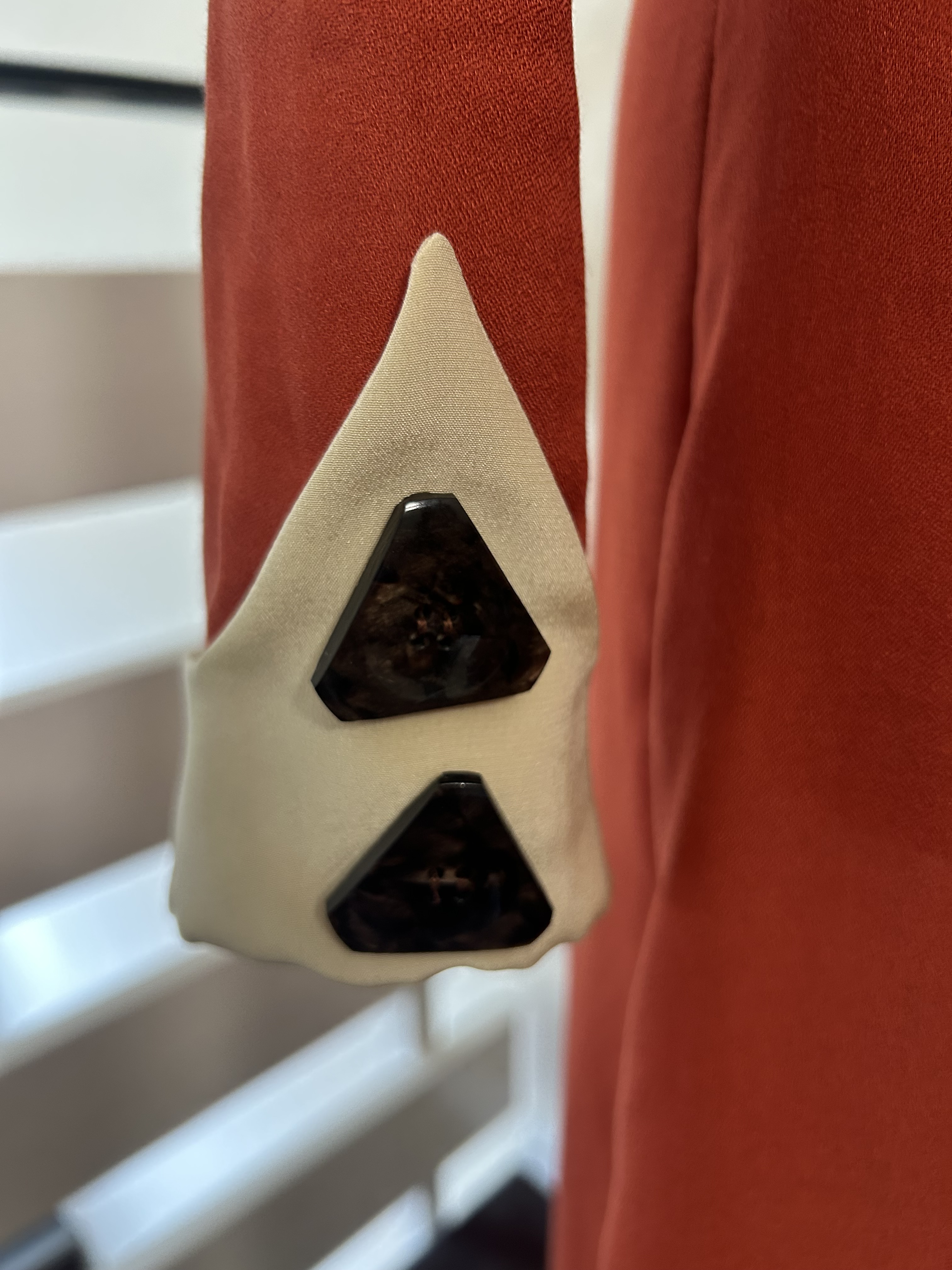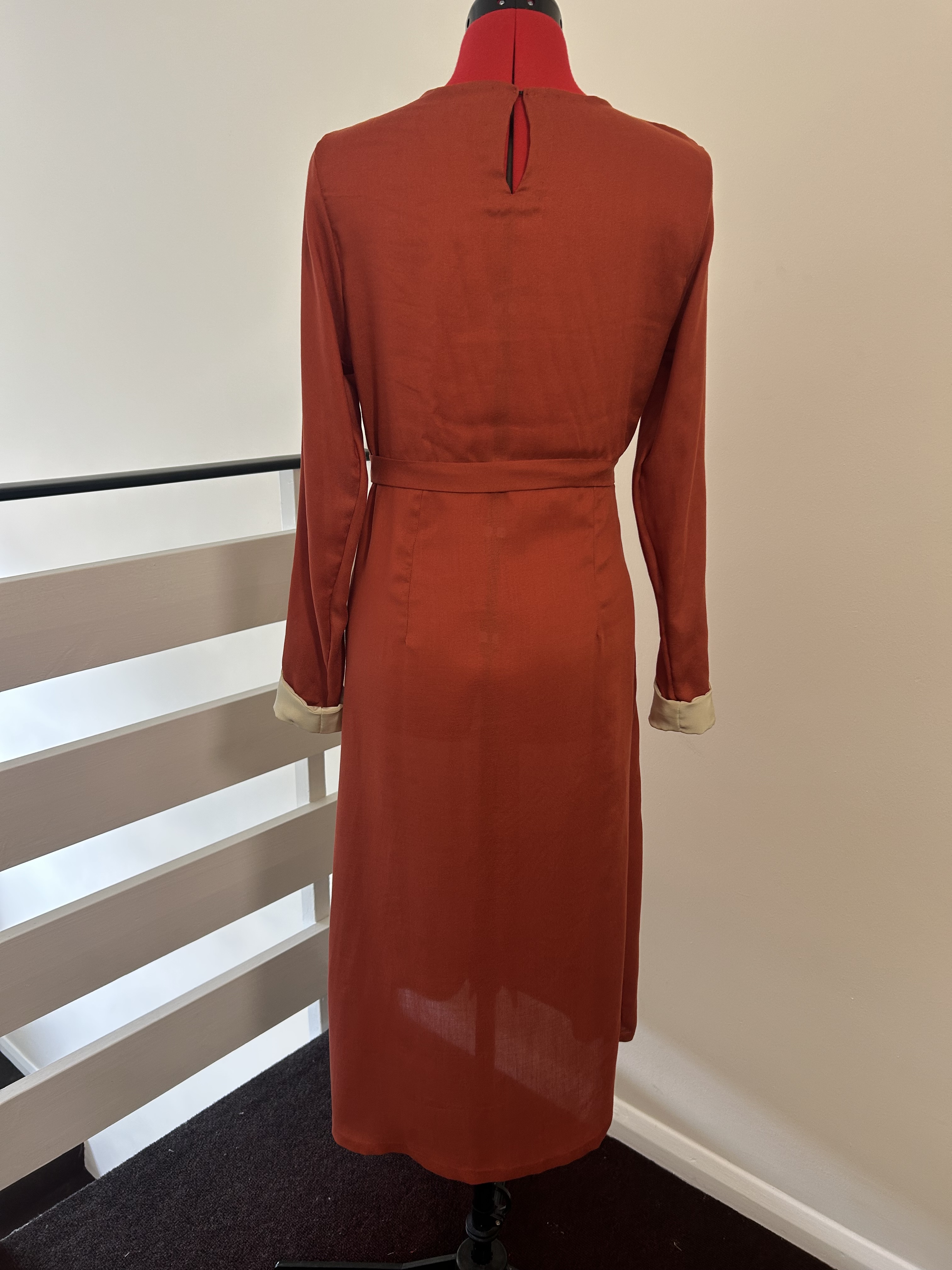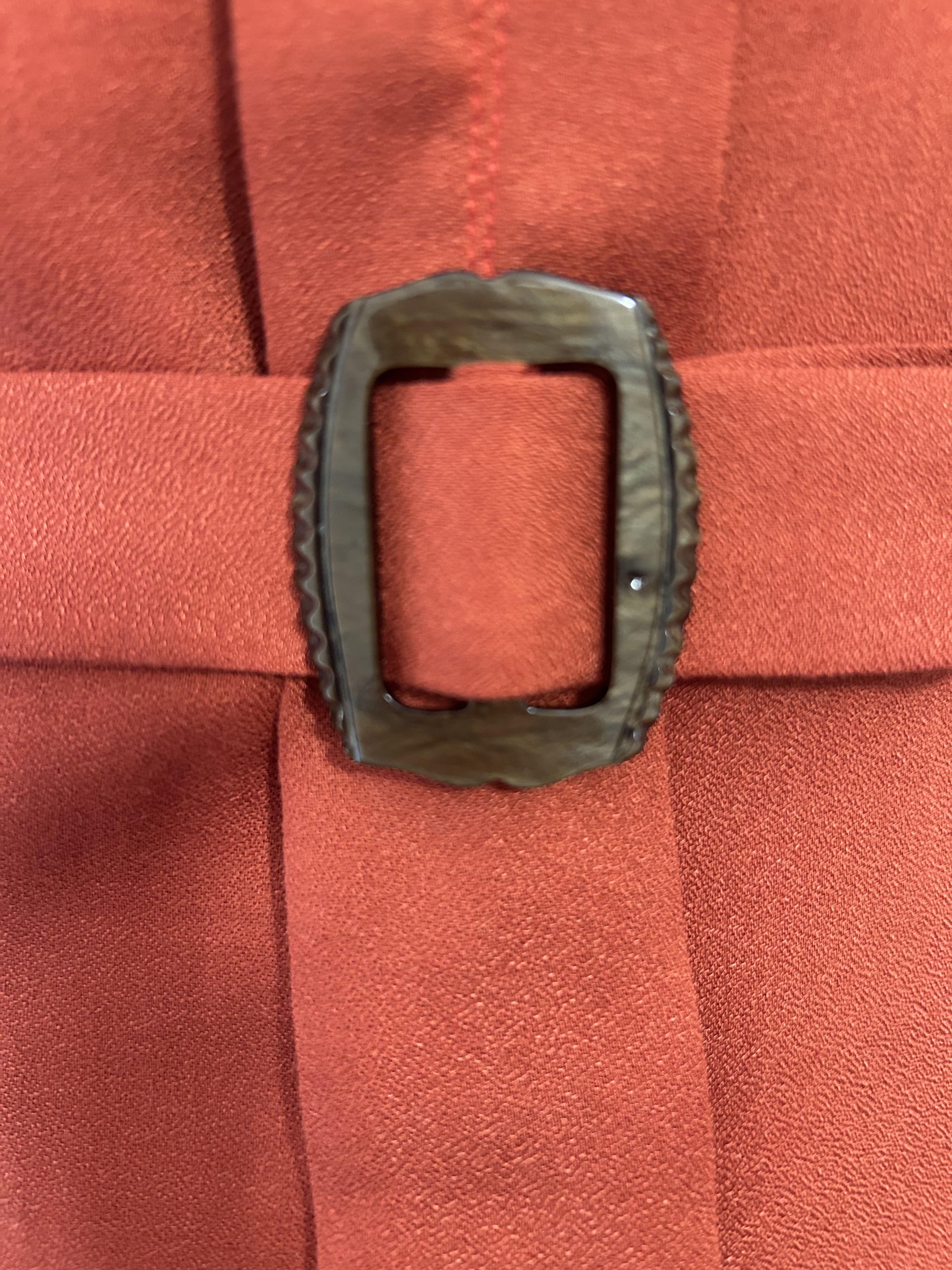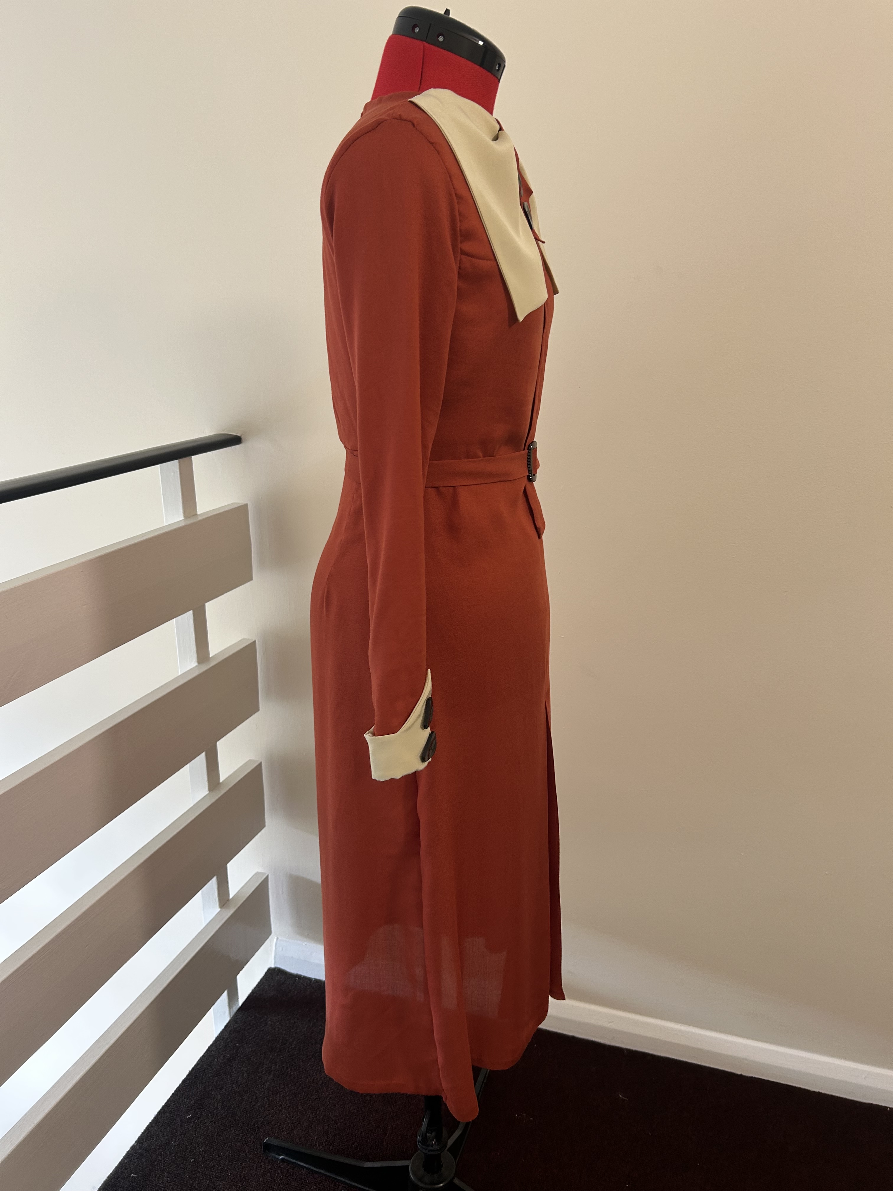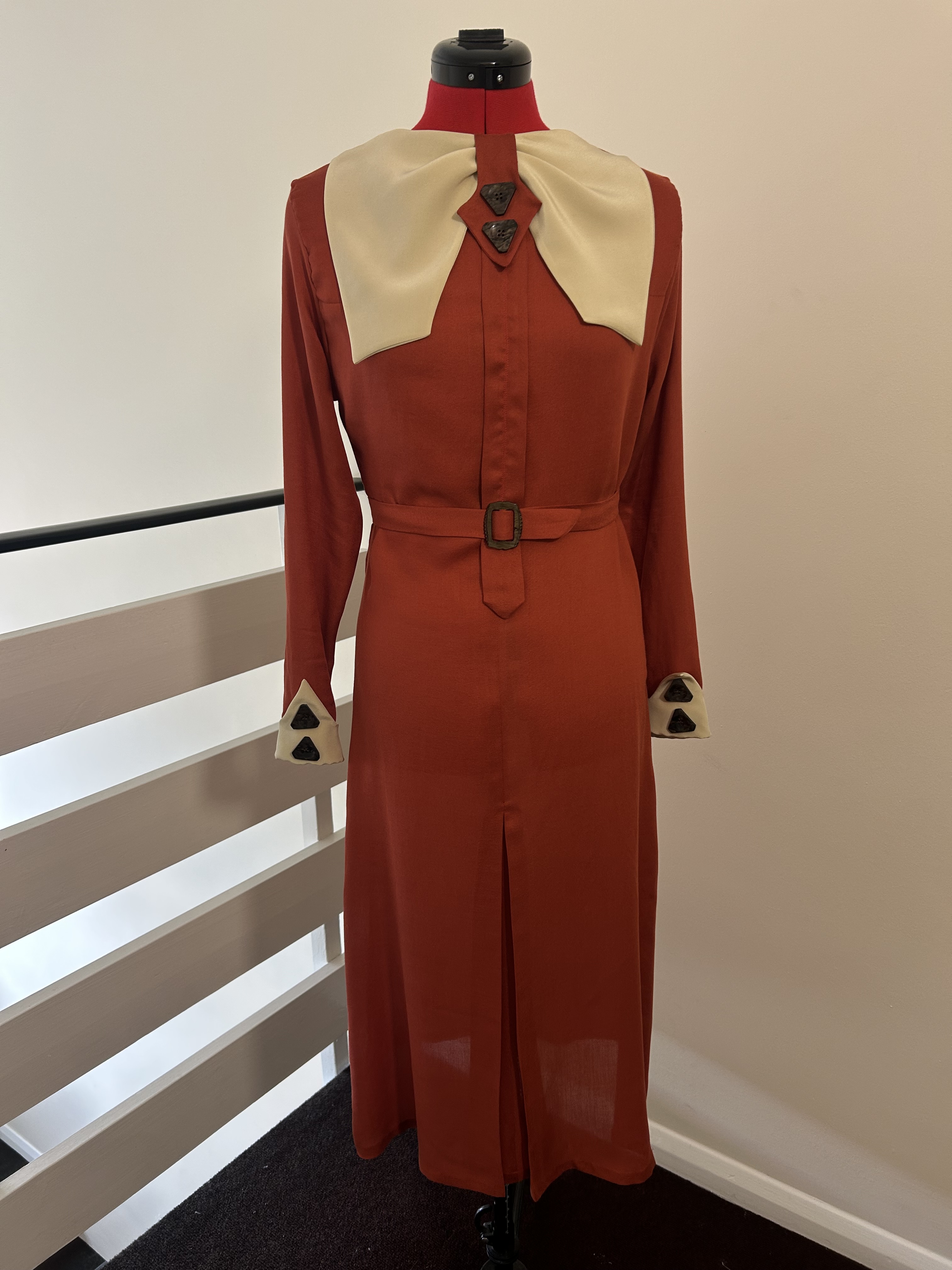 This early 1930s inspired burnt orange viscose rayon crepe beauty has all the elements of a dress of the era, with its long narrow sleeves that feature cream silk crepe de chine cuffs adorned with two triangle vintage bakelite buttons, also emphasising the triangle shape of the cuffs. Another set of buttons can be seen on the triangle shape flap on top of the collar holding together an impressive crepe de chine large bow which is attached to the shoulder seams of the bodice. Another noteworthy detail is the tie sewn on the central seam. The skirt features a long kick pleat. The collar fastens with hook and eye at the back. The belt features a bakelite buckle. The dress fastens with snap fasterners at the side seam.