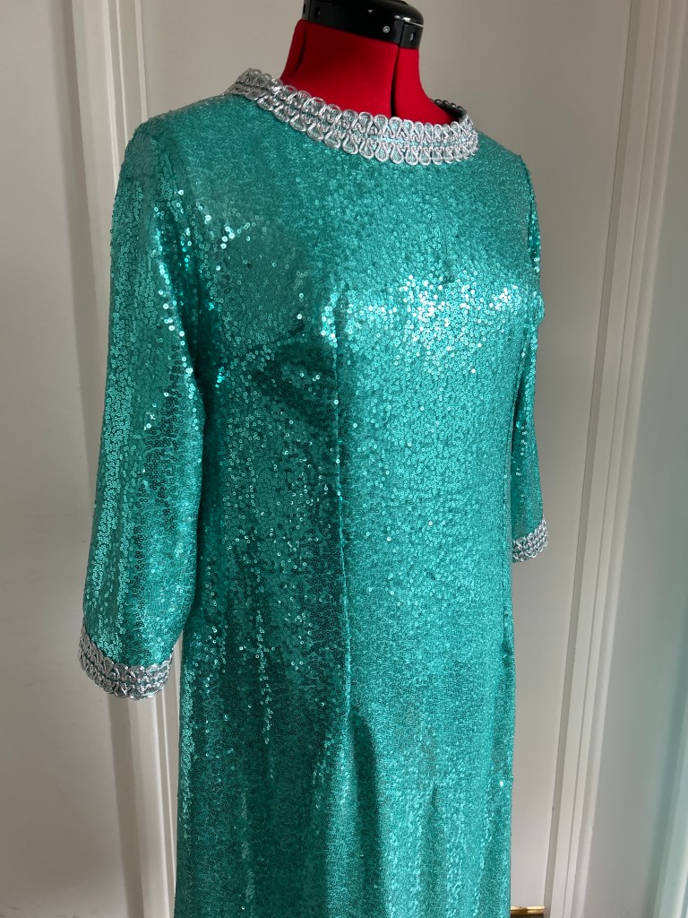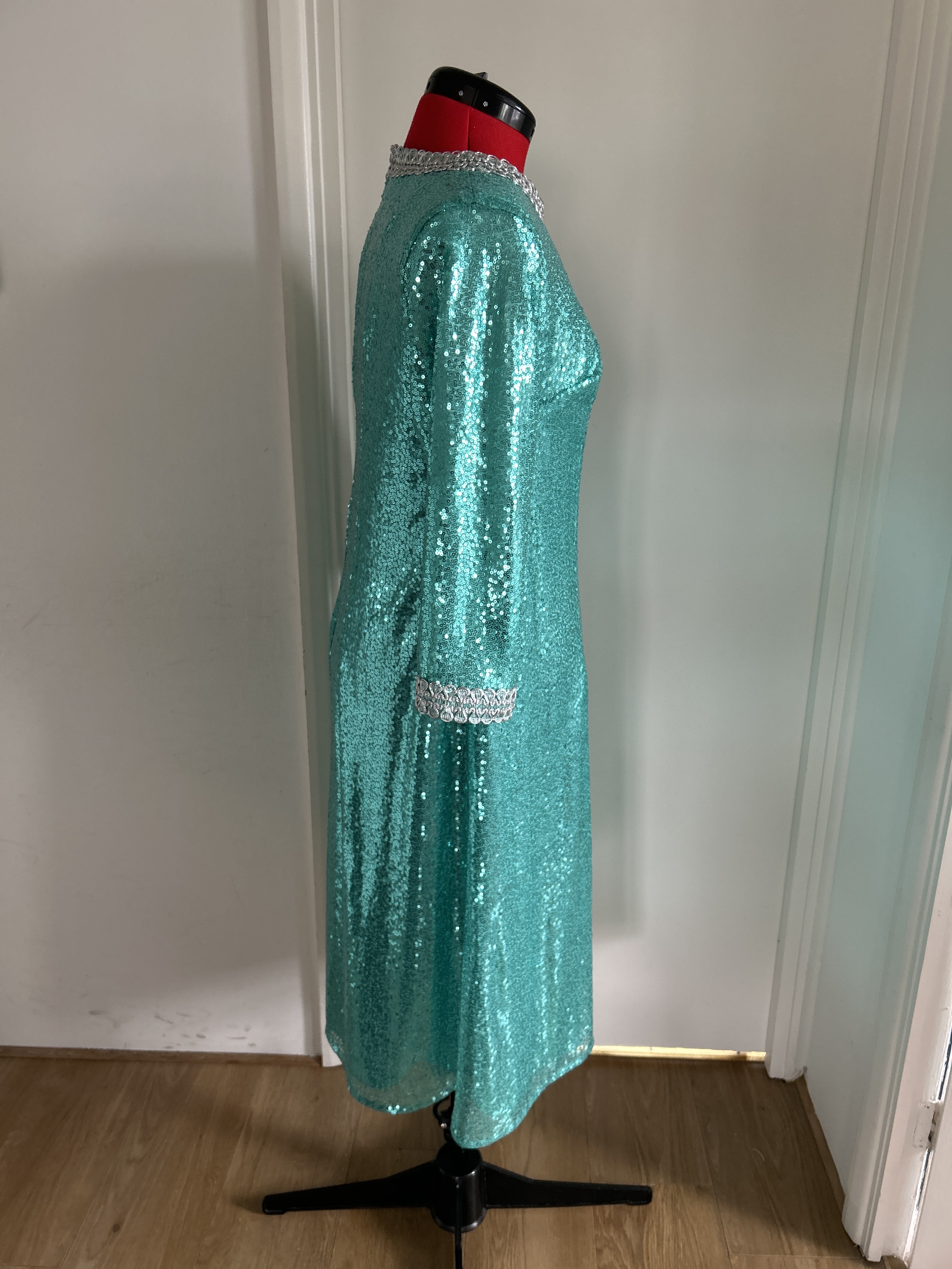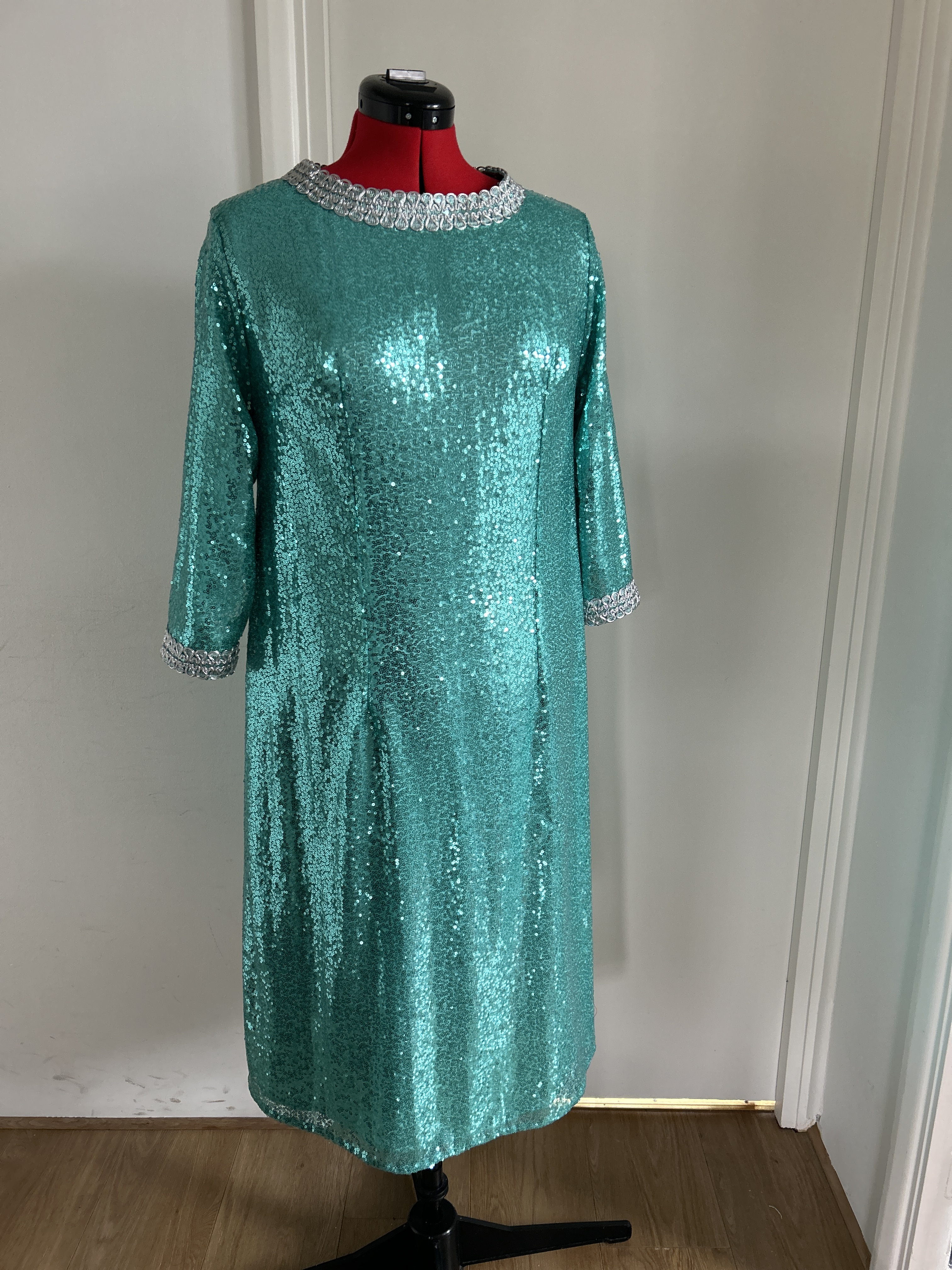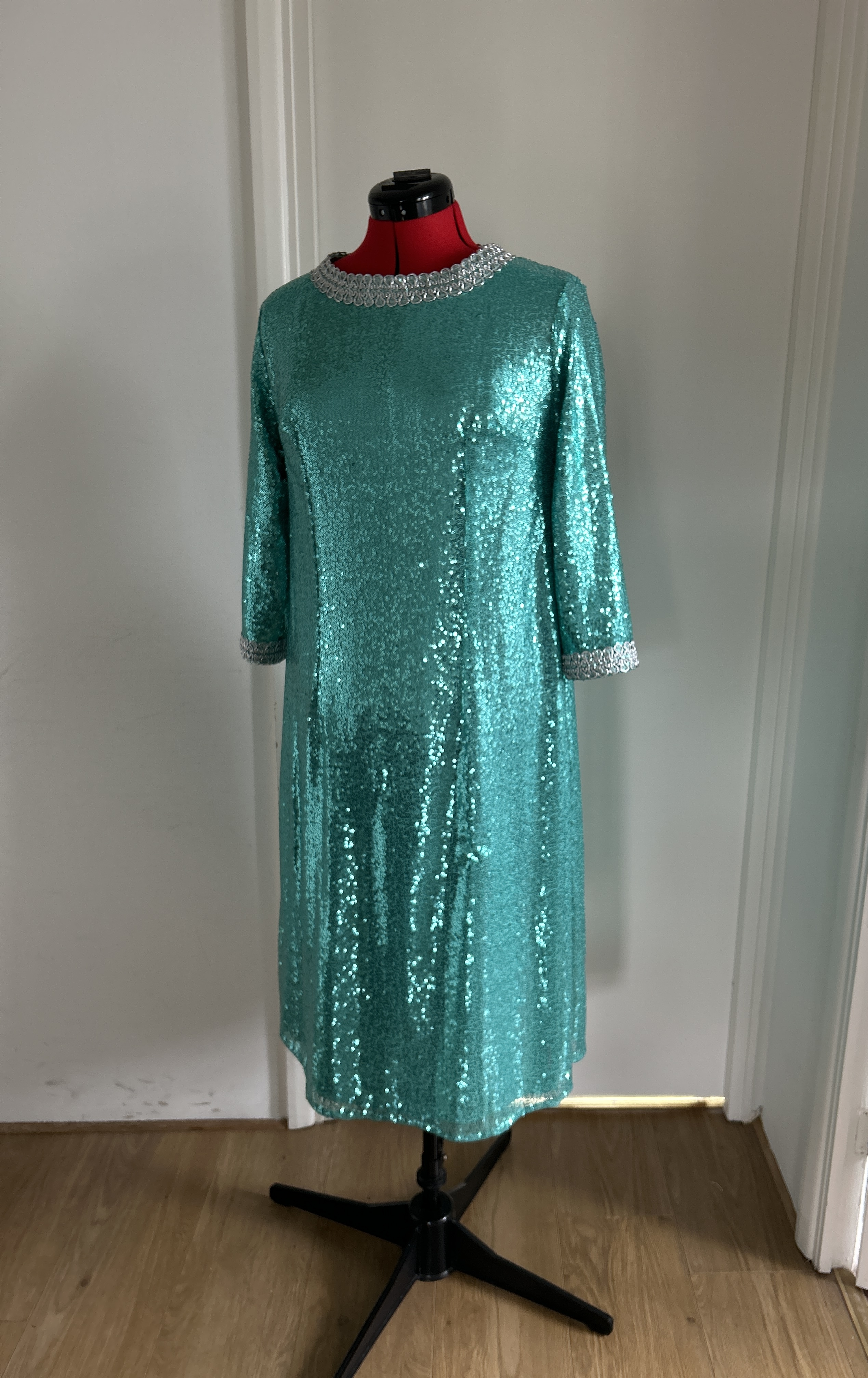Here I present a darling late 1960s inspired shift dress in aqua sequin and silk satin fabric. With darts both on the front and back to create a more A-line silhouette.The wide metallic silver braid trimming adorns the typically 1960s round collar and the hems of the 3/4 length sleeves. It fastens with a zip at the back.