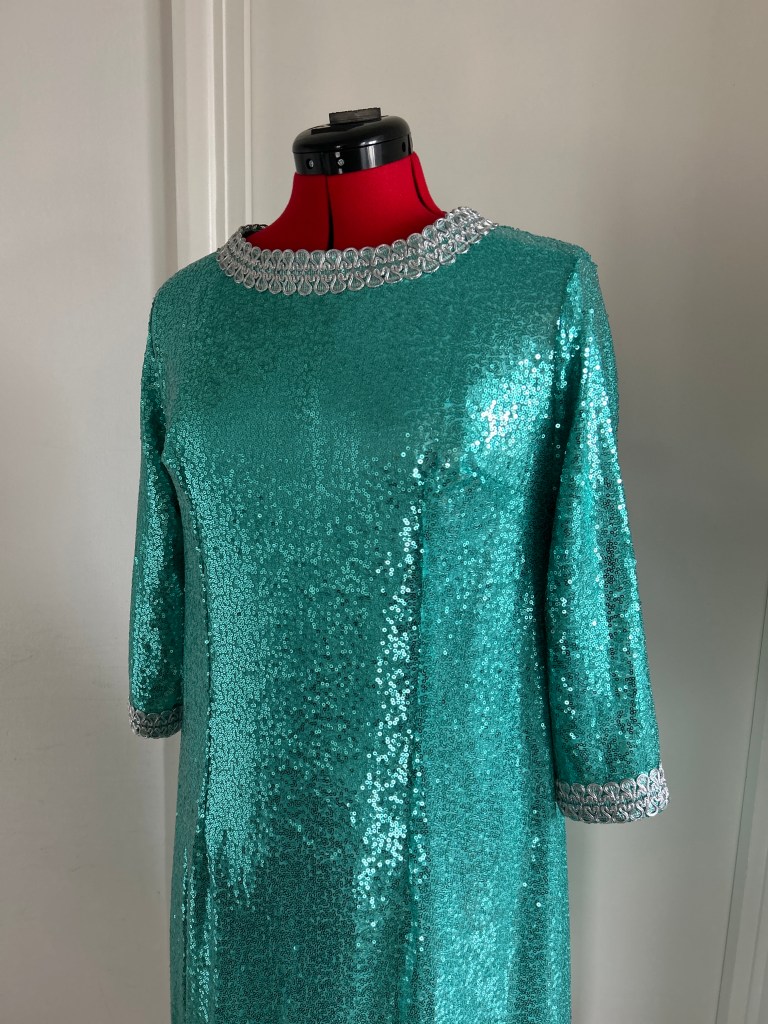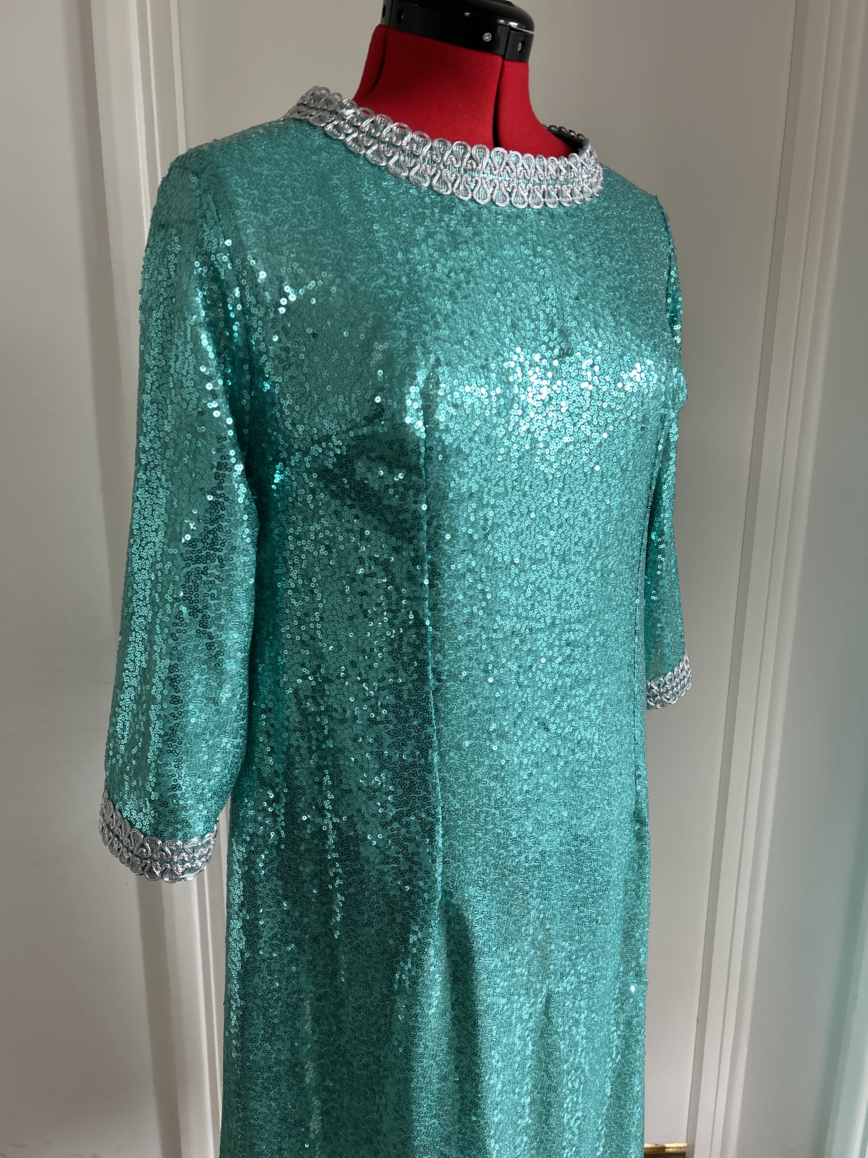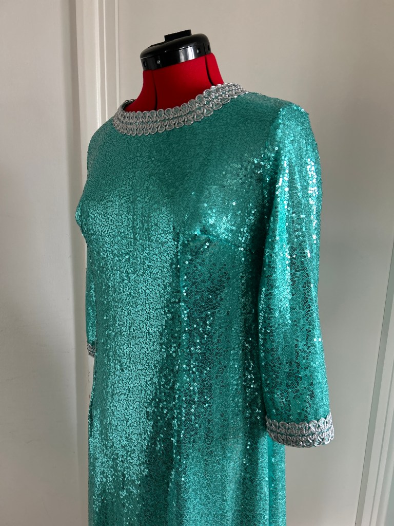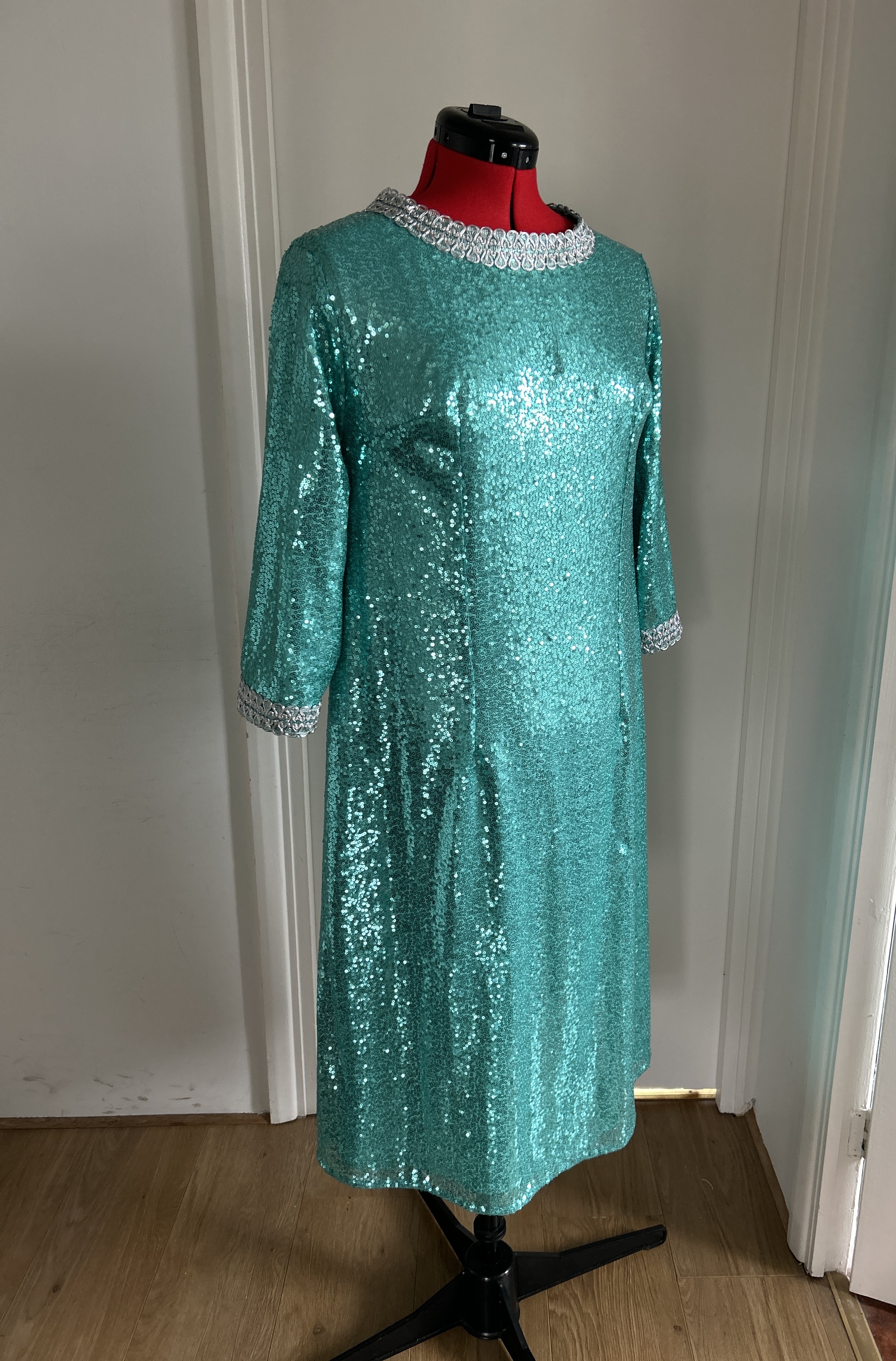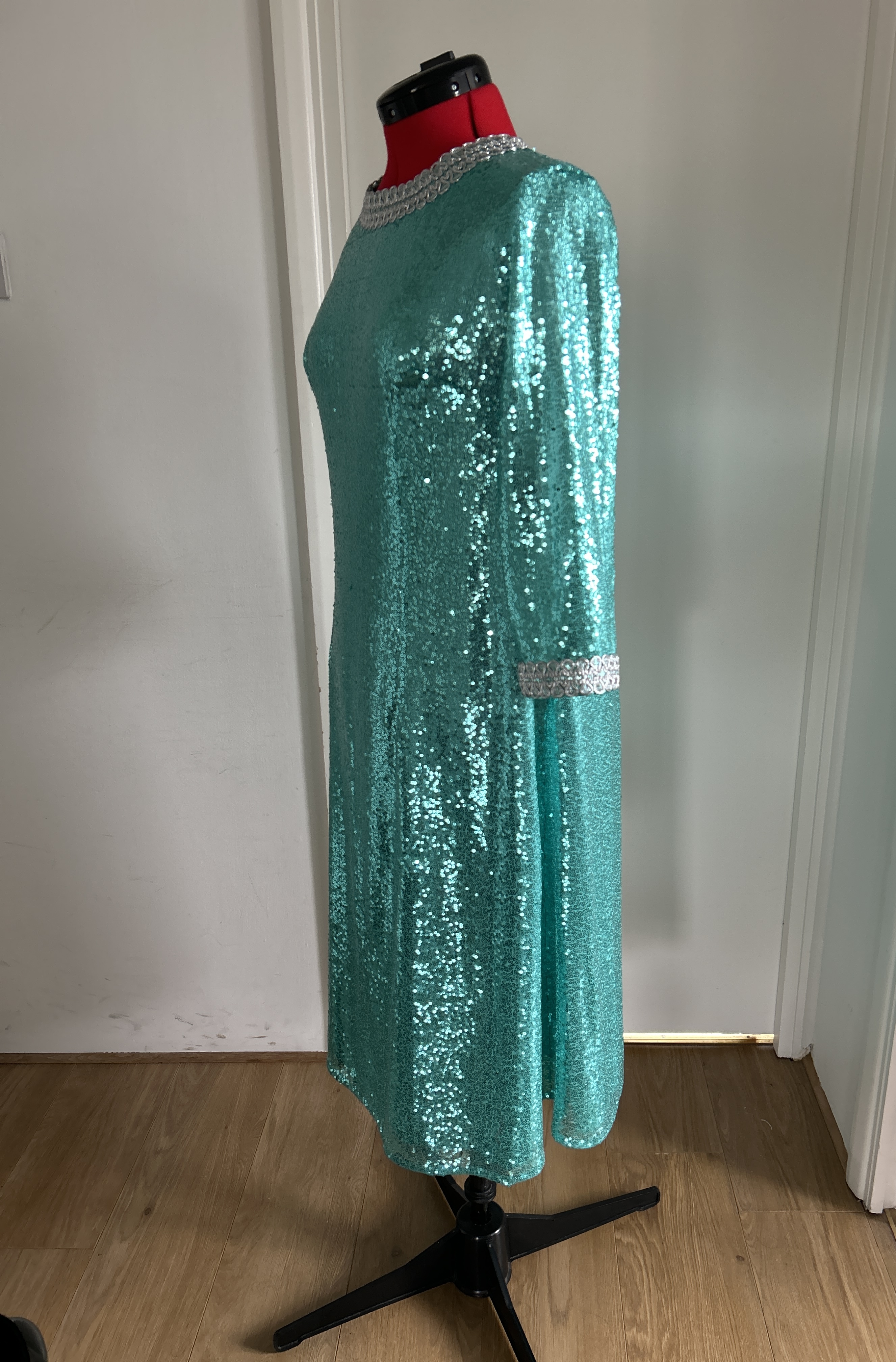Here I present a darling late 1960s inspired shift dress in aqua sequin and silk satin fabric. With darts both on the front and back to create a more A-line silhouette.The wide metallic silver braid trimming adorns the typically 1960s round collar and the hems of the 3/4 length sleeves. It fastens with a zip at the back.