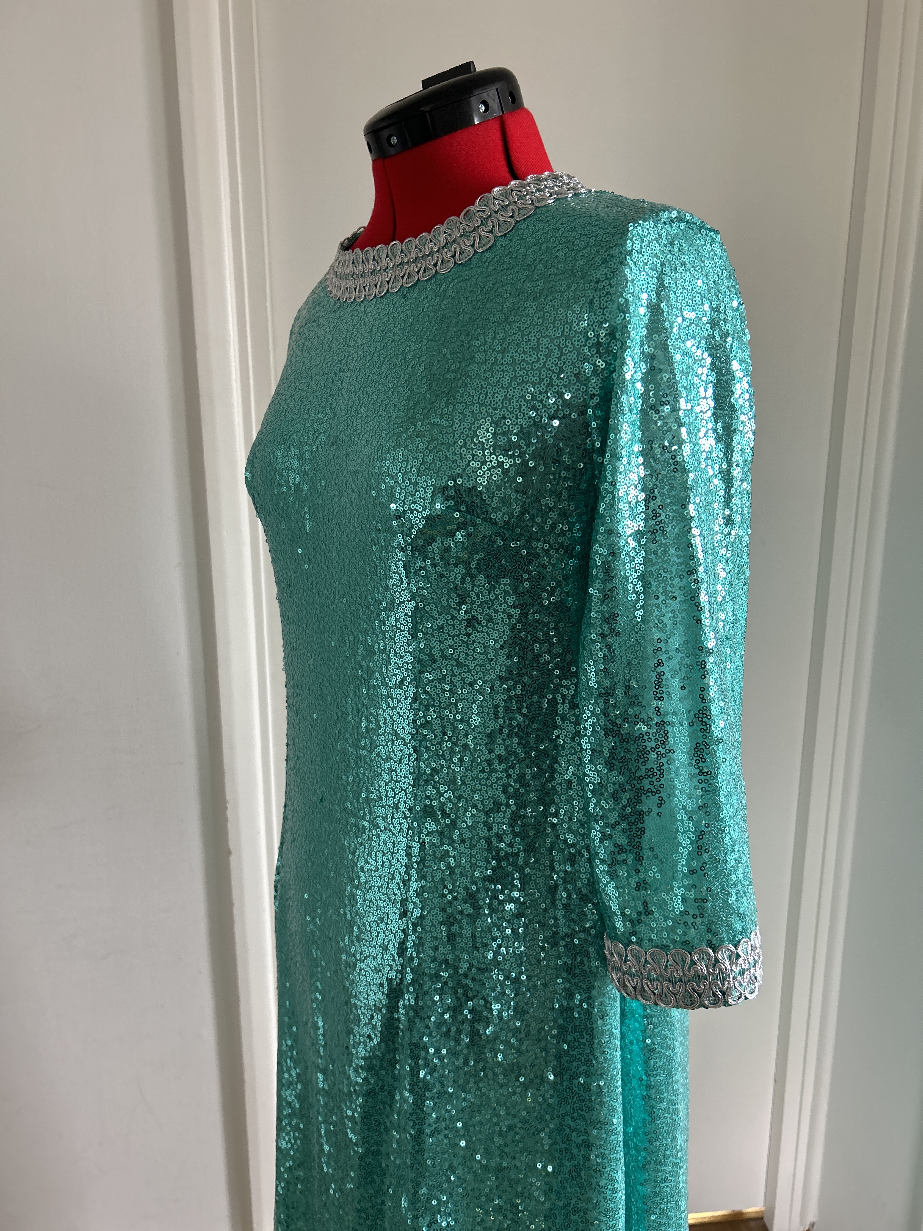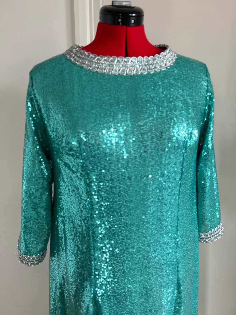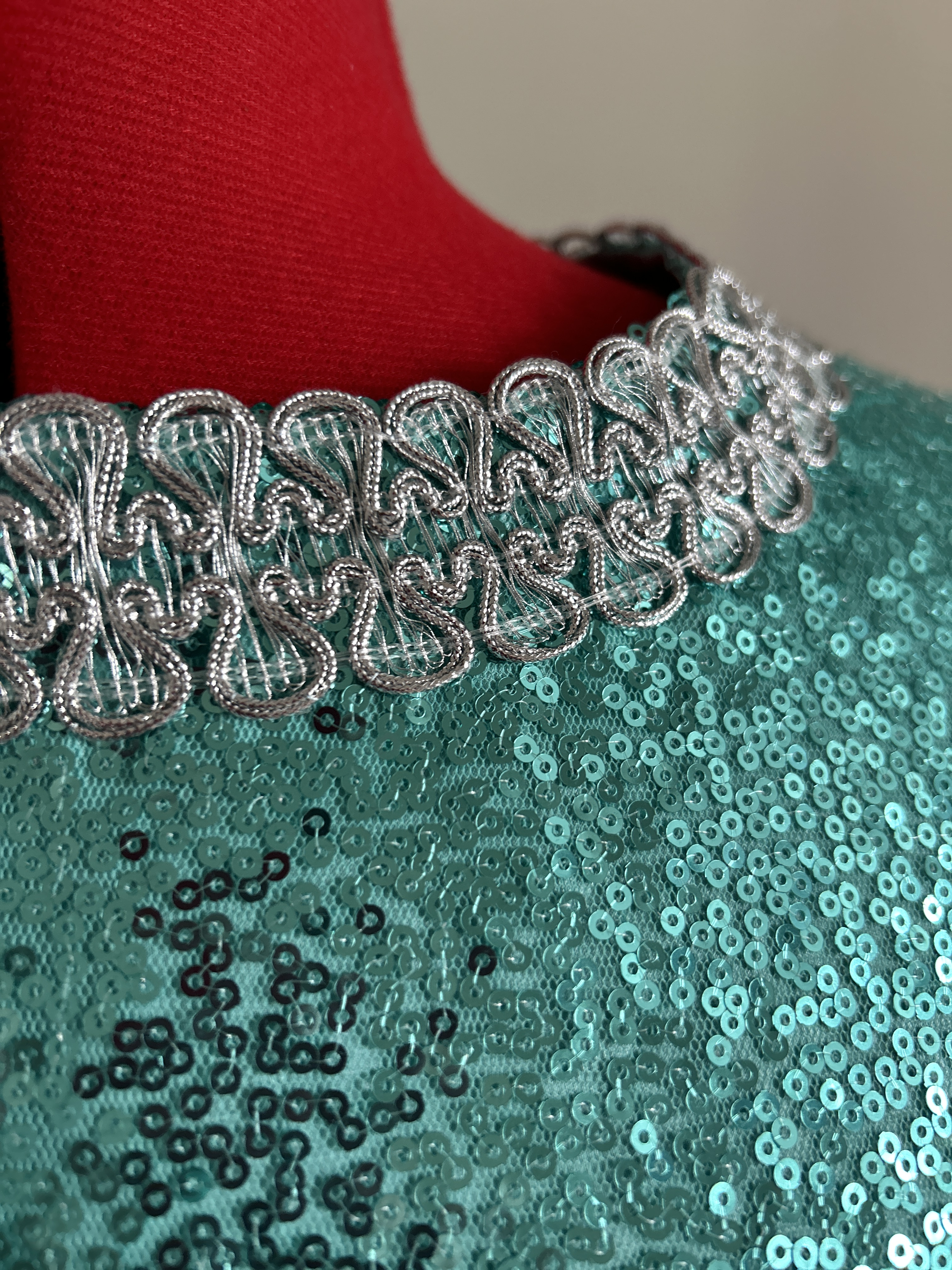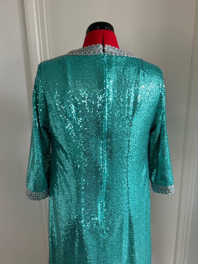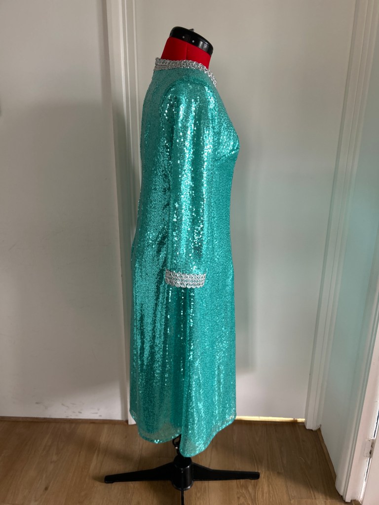 Here I present a darling late 1960s inspired shift dress in aqua sequin and silk satin fabric. With darts both on the front and back to create a more A-line silhouette.The wide metallic silver braid trimming adorns the typically 1960s round collar and the hems of the 3/4 length sleeves. It fastens with a zip at the back.