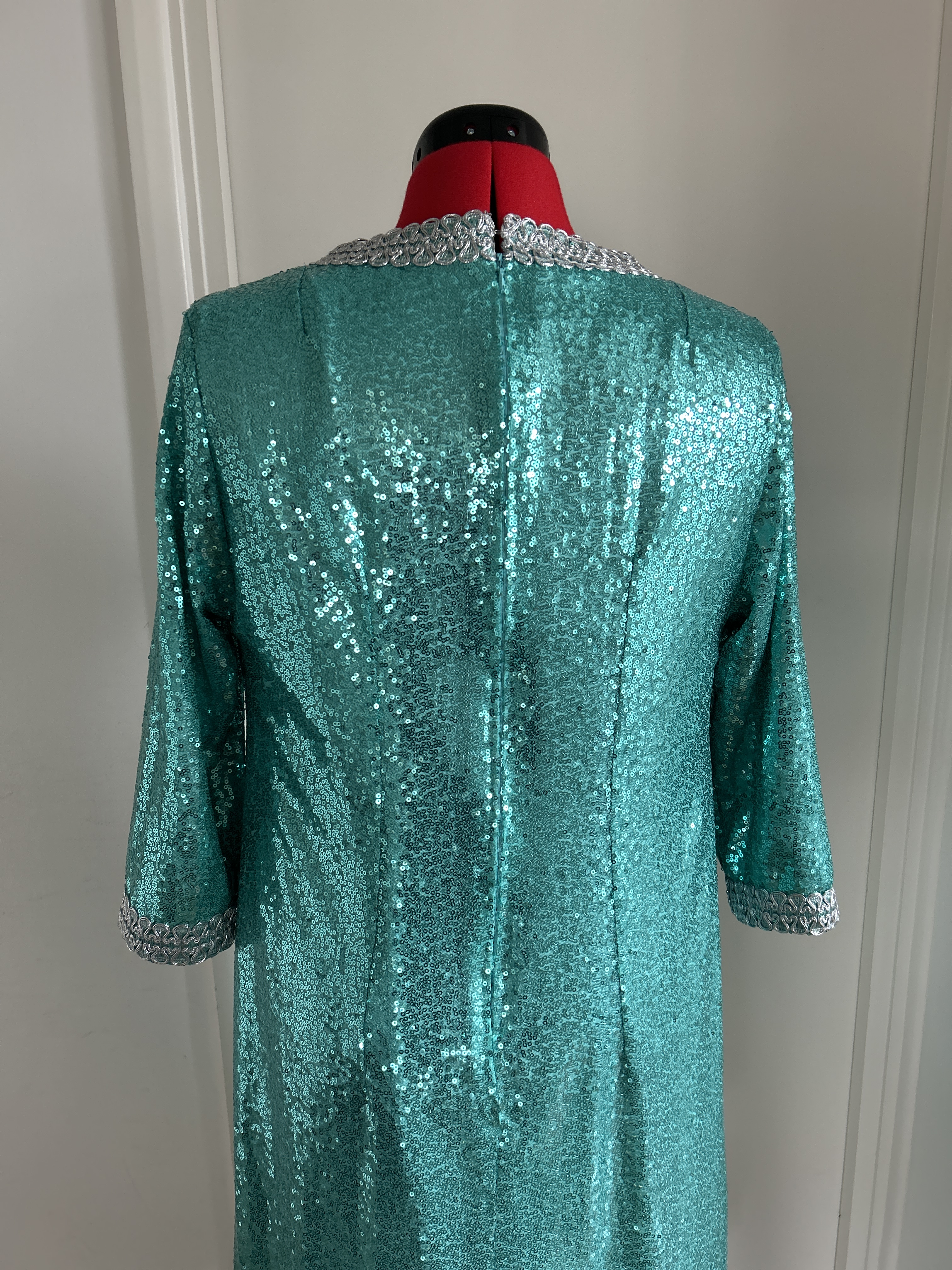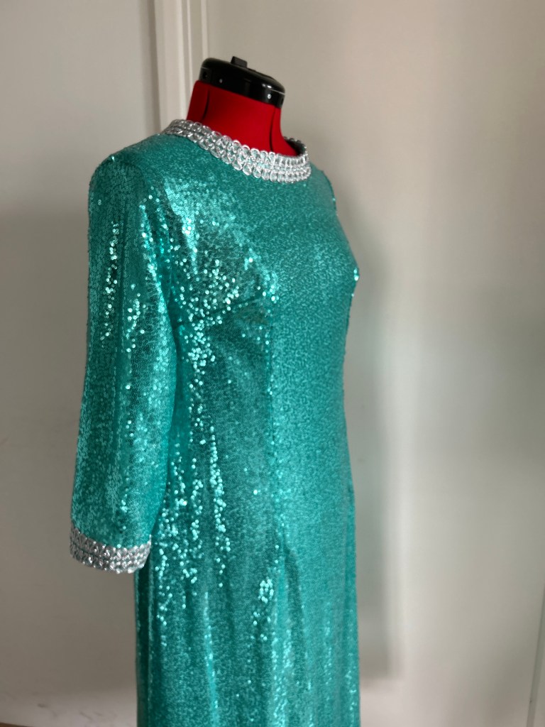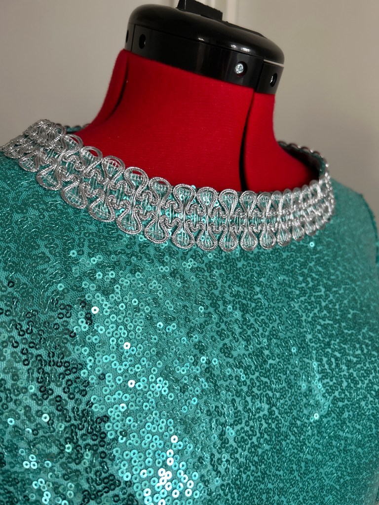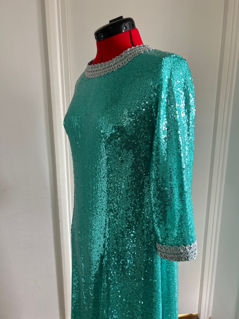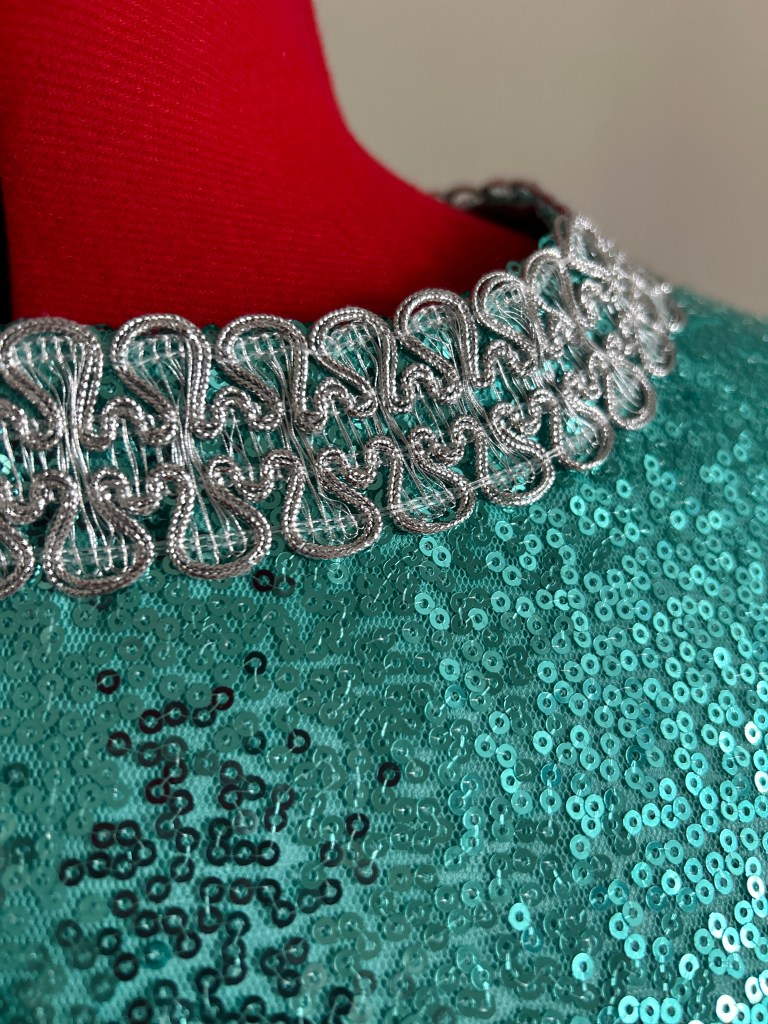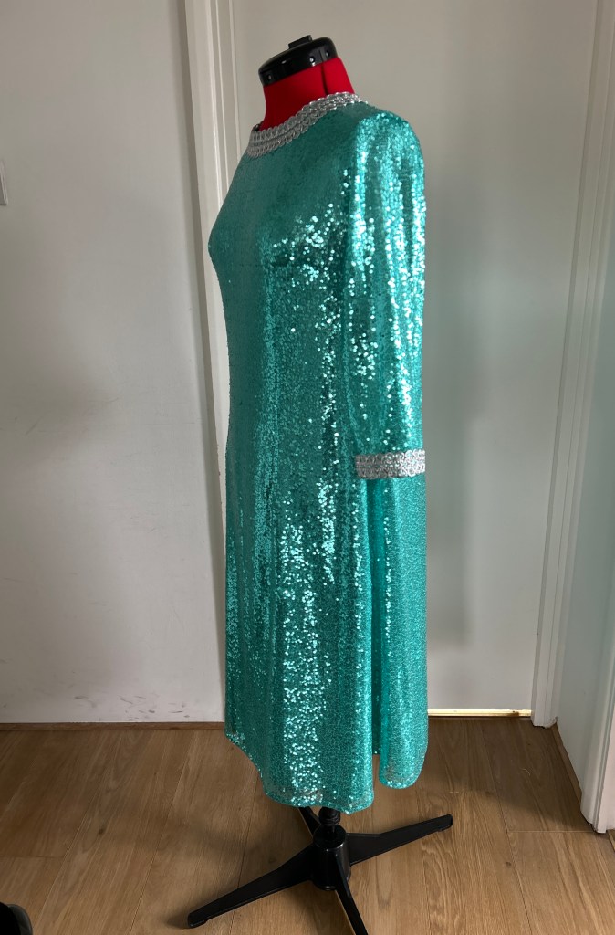 Here I present a darling late 1960s inspired shift dress in aqua sequin and silk satin fabric. With darts both on the front and back to create a more A-line silhouette.The wide metallic silver braid trimming adorns the typically 1960s round collar and the hems of the 3/4 length sleeves. It fastens with a zip at the back.