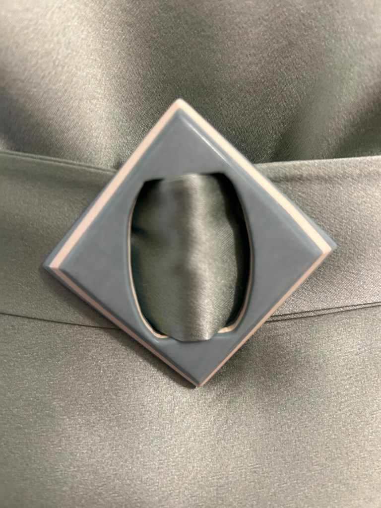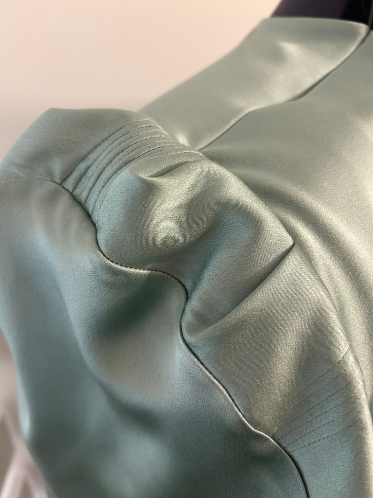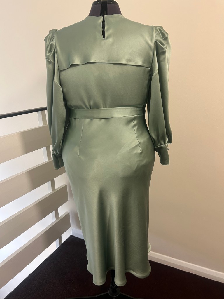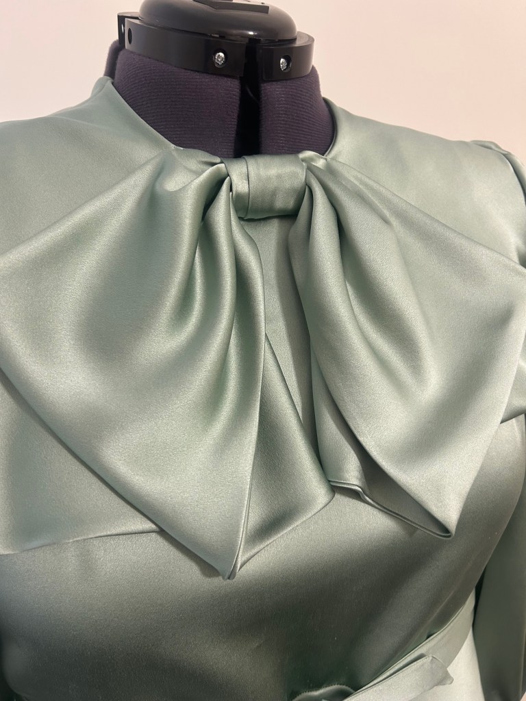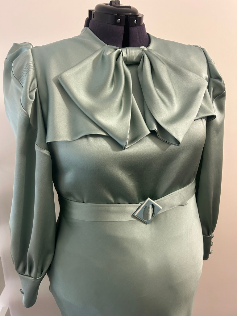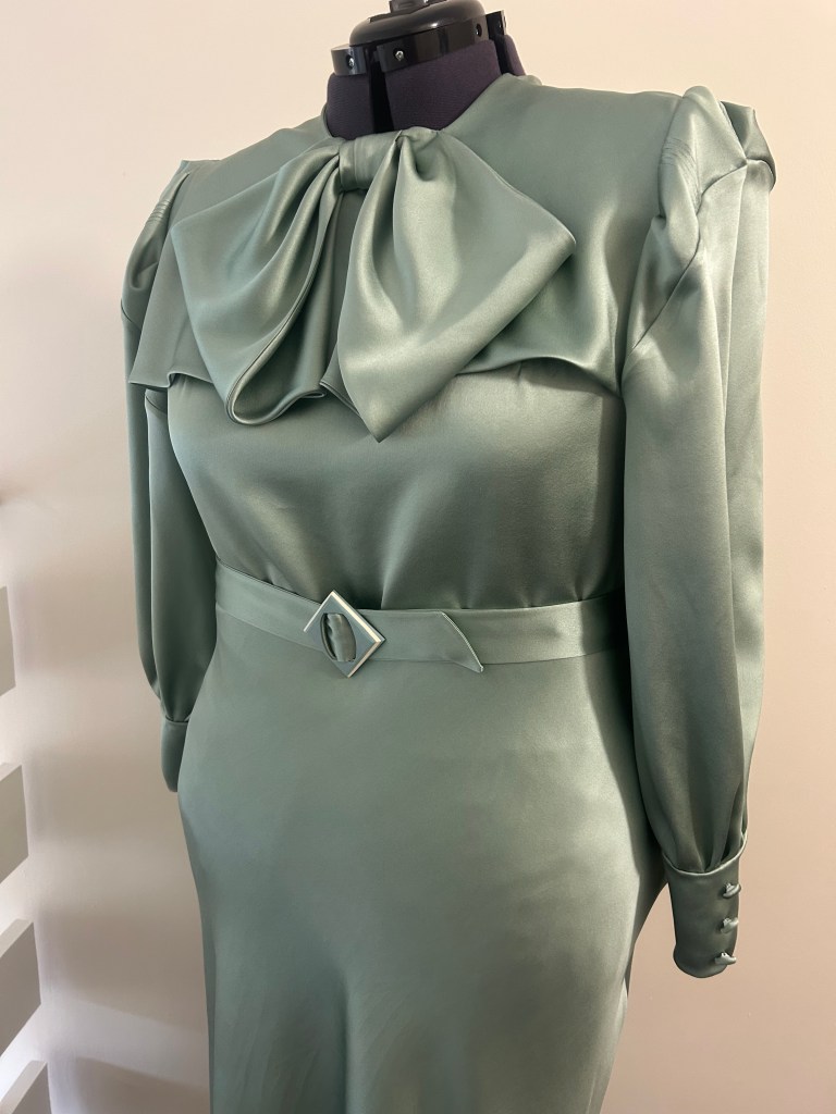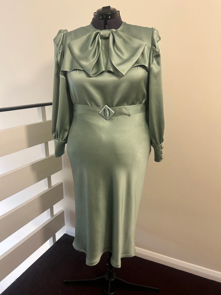 Here’s a lovely early 1930s style sage green silk crepe satin bow dress that is another version of a one I made previously in brick coloured textured viscose tencel. This time the skirt of the dress is cut on the bias.