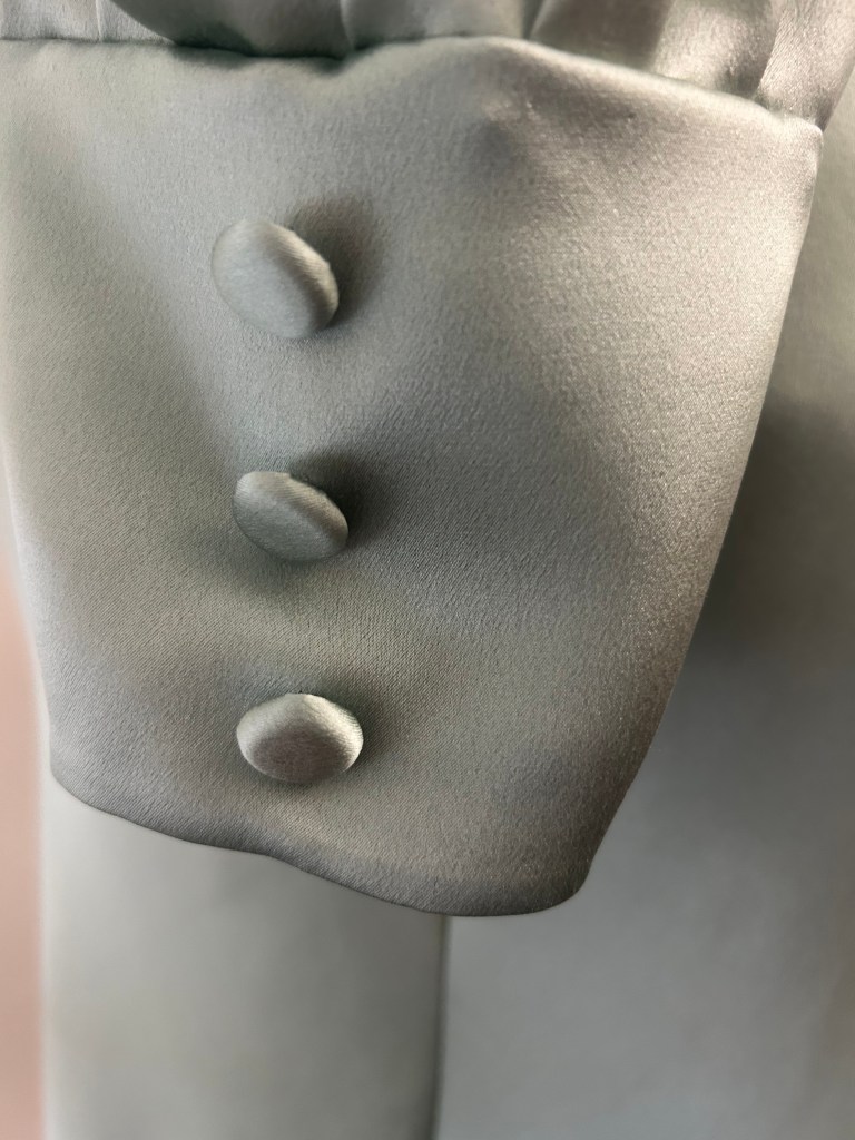 The long bishop style sleeves with puffy shoulders feature a series of narrow tucks, which were yet another distinguished feature in those times and with wide cuffs adorned with decorative fabric covered buttons. The dress fastens with snap fasteners at the side. The belt features a lovely square bakelite buckle.