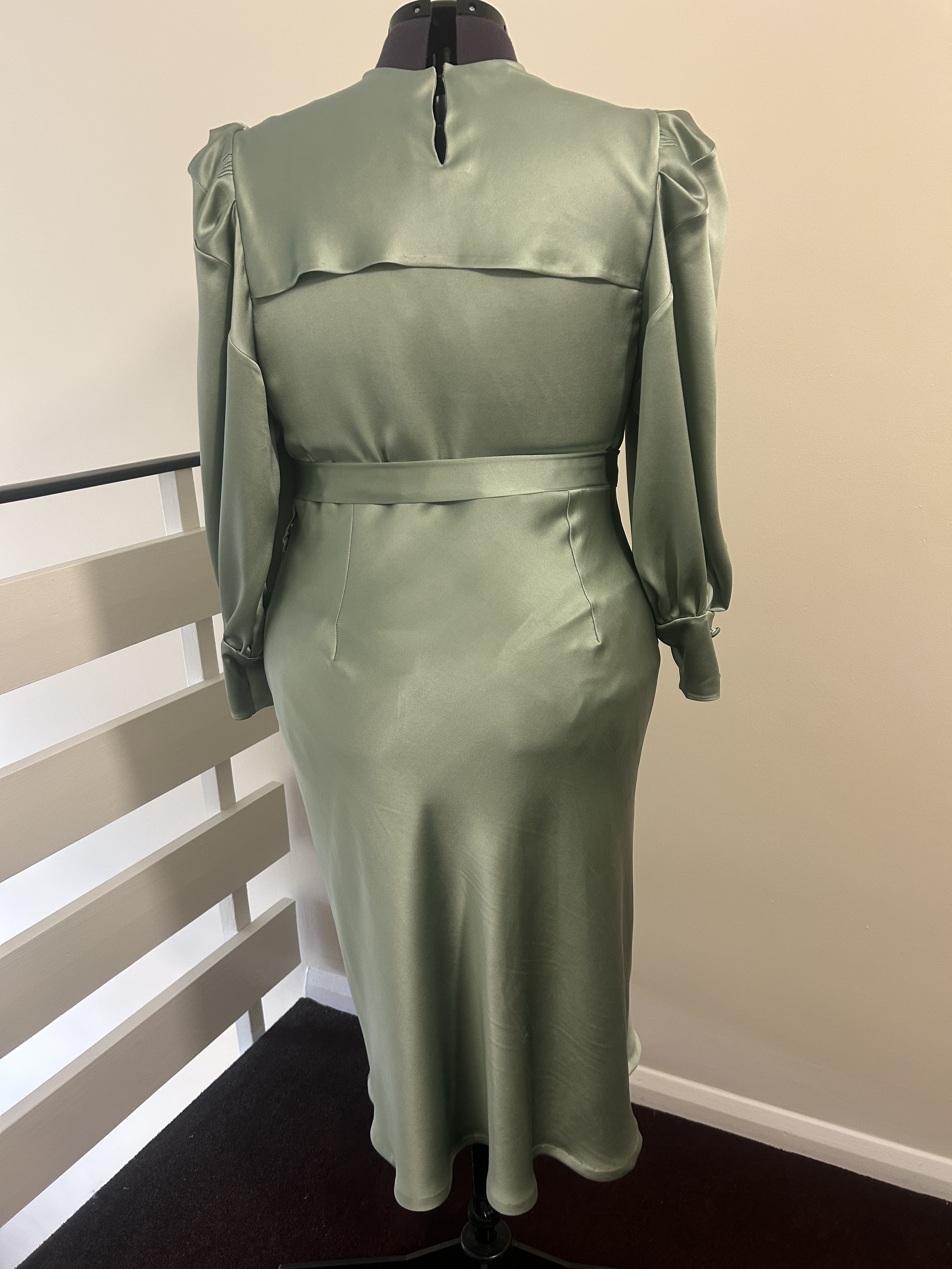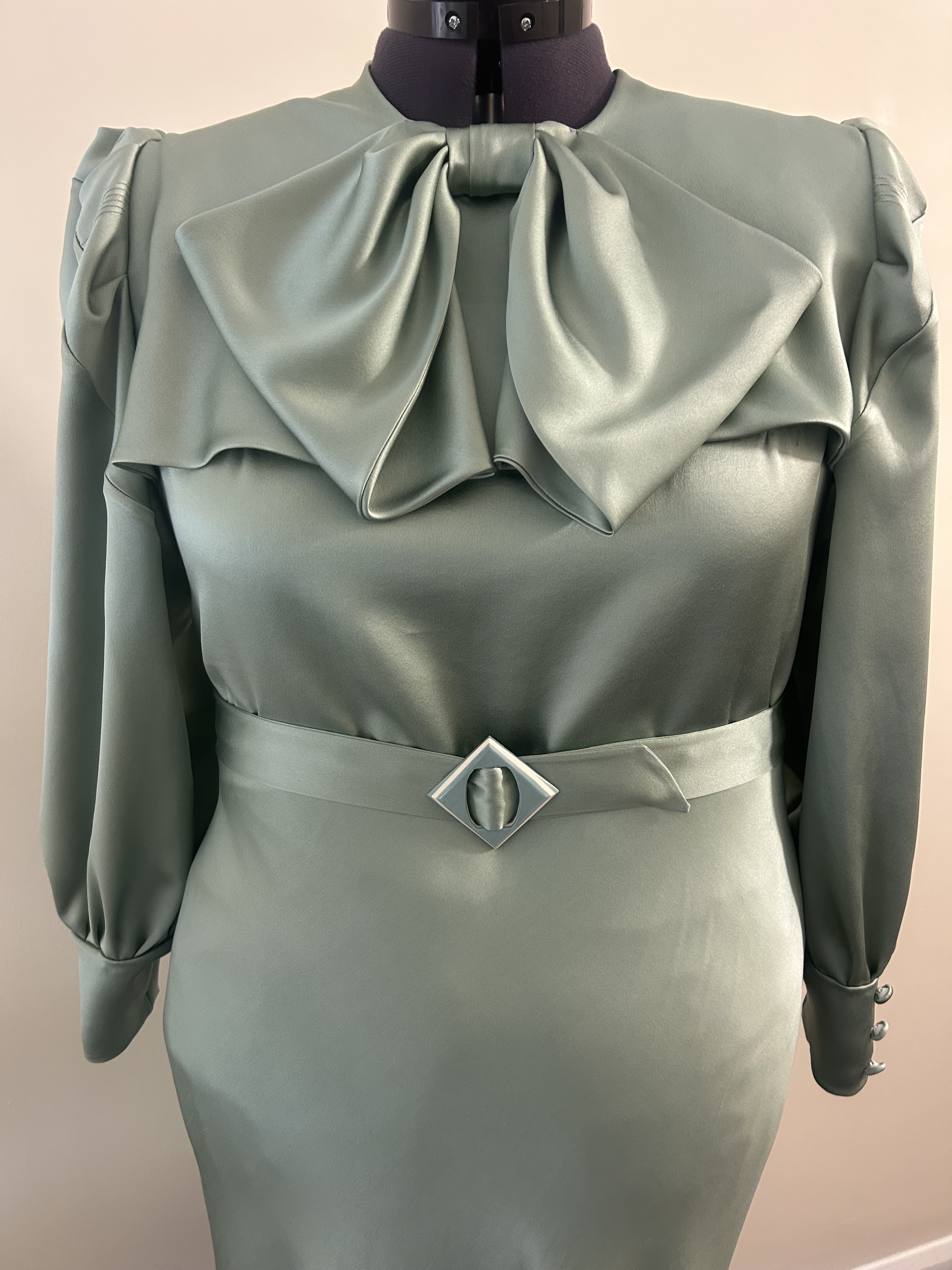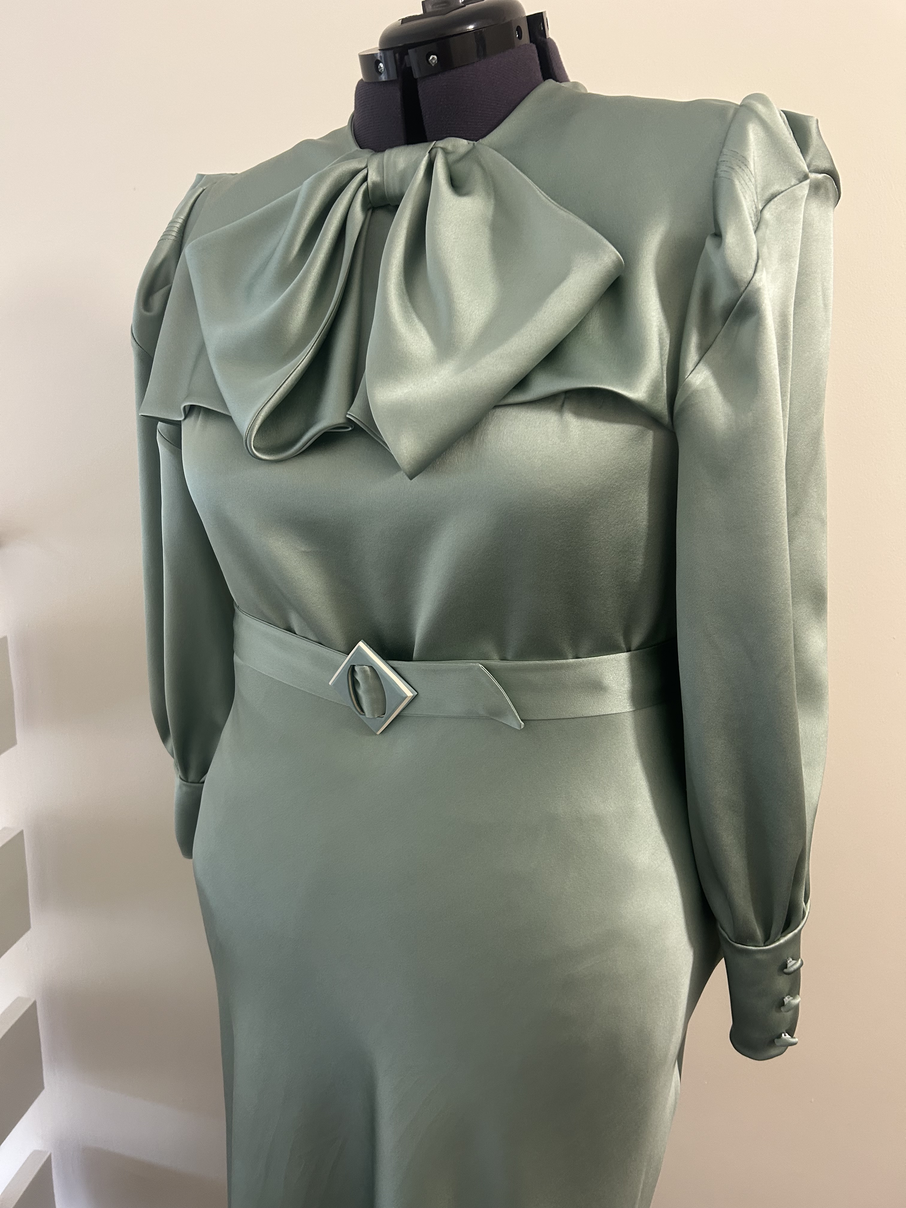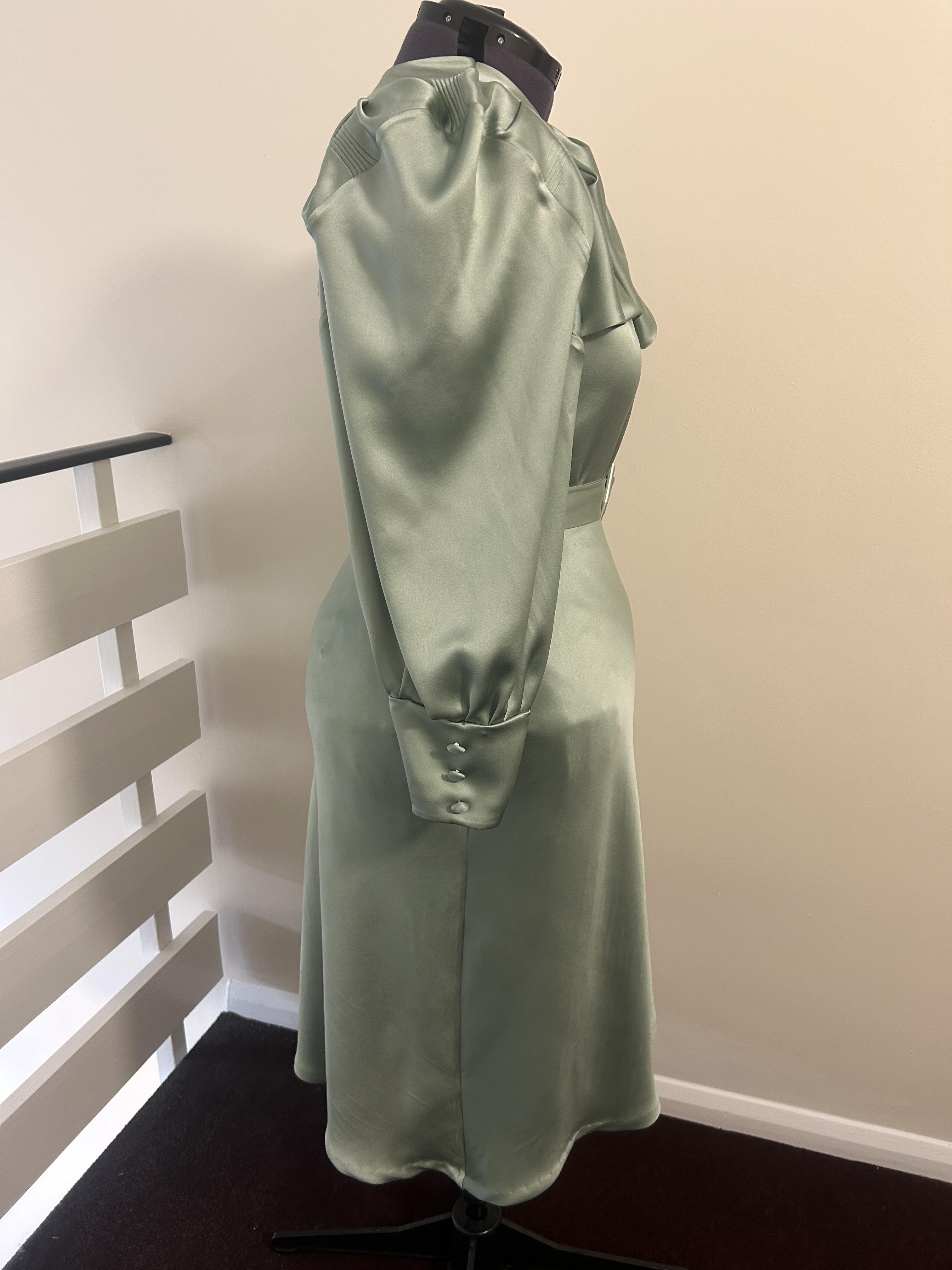 The long bishop style sleeves with puffy shoulders feature a series of narrow tucks, which were yet another distinguished feature in those times and with wide cuffs adorned with decorative fabric covered buttons. The dress fastens with snap fasteners at the side. The belt features a lovely square bakelite buckle.