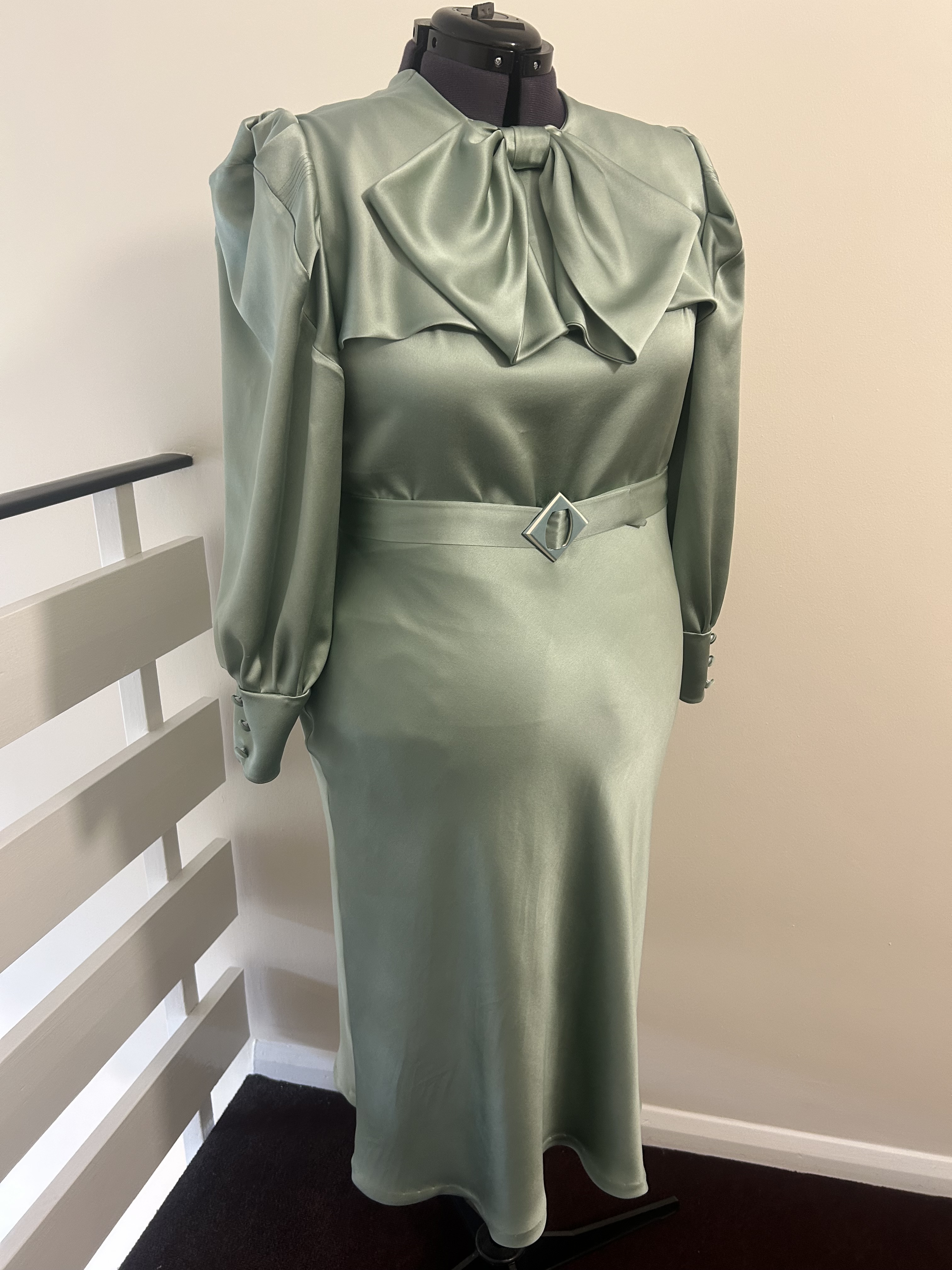 Here’s a lovely early 1930s style sage green silk crepe satin bow dress that is another version of a one I made previously in brick coloured textured viscose tencel. This time the skirt of the dress is cut on the bias.