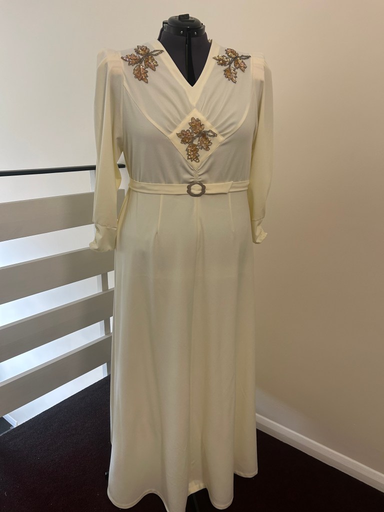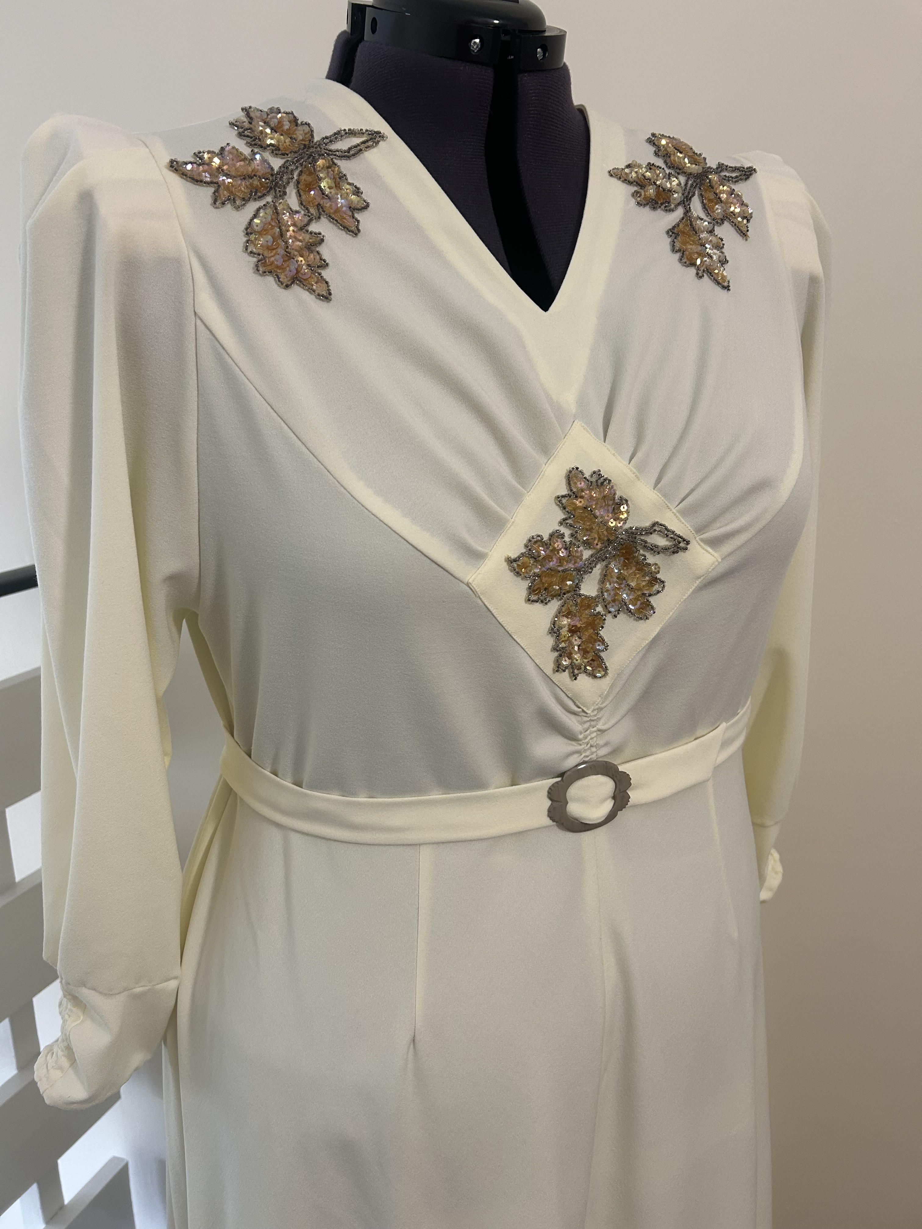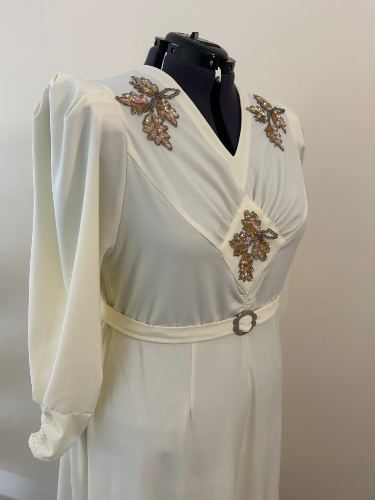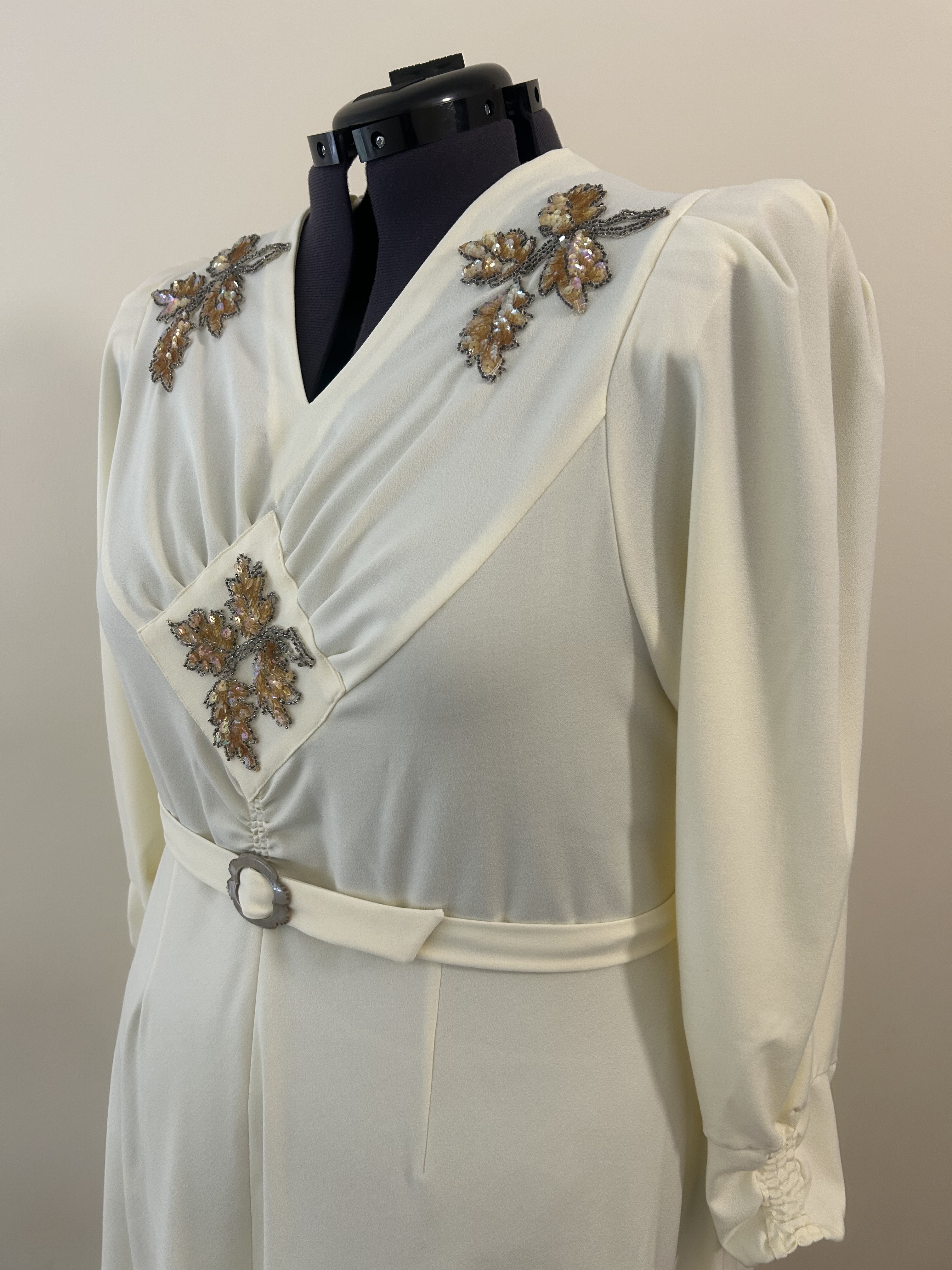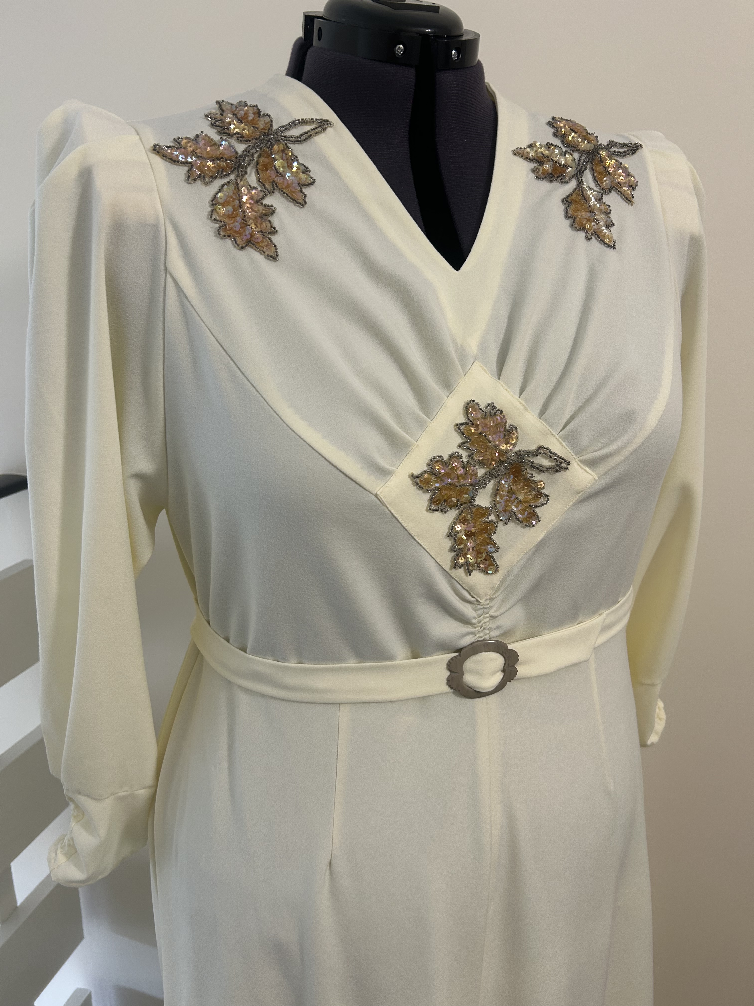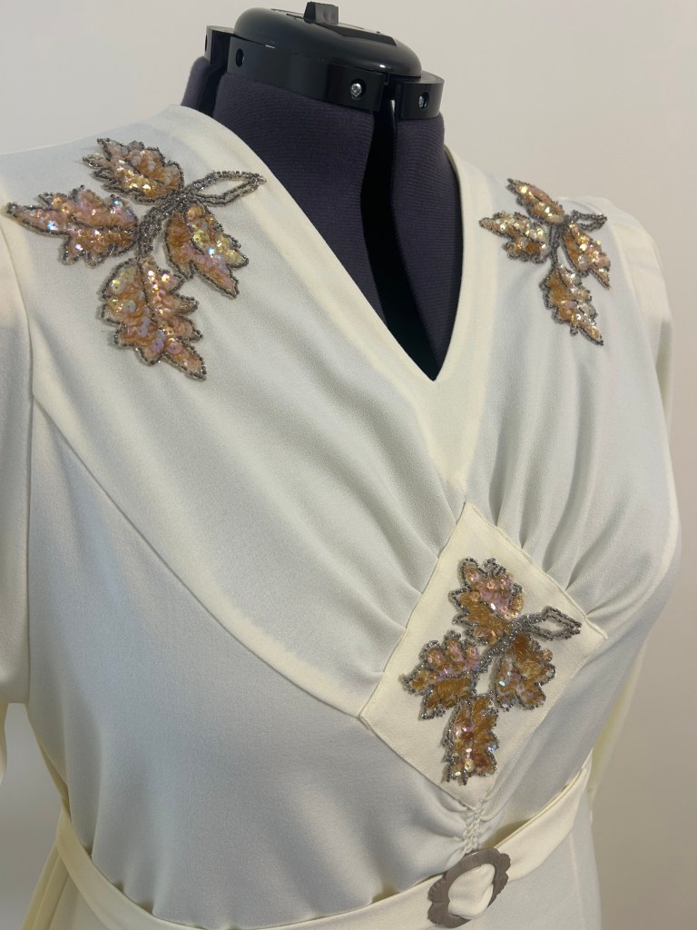 This beautiful early 1930s style dress in navy viscose rayon crepe with lovely burnt orange silk crepe back satin shawl scarf style collar and wing details in sleeves scream all things 1930s in their art deco glory. The light brick coloured square bakelite buttons featured down the front of the bodice , the back of the gathered collar with a flap, and the sleeves with wing detailing in burnt orange silk create a fantastic contrast to the dark navy of the mid-calf length dress with a pleat down the centre seam and narrow long sleeves, creating a typical of silhouette of the era. The belt has a small vintage bakelite buckle. Fastening at the side seam with snap fasteners.