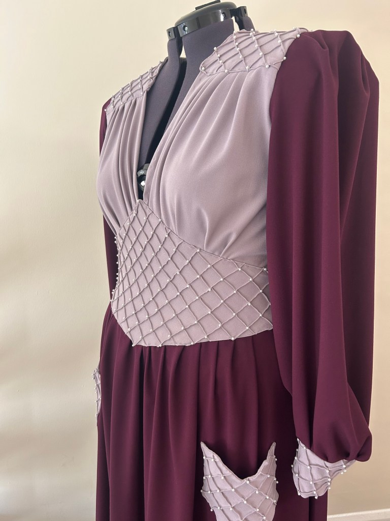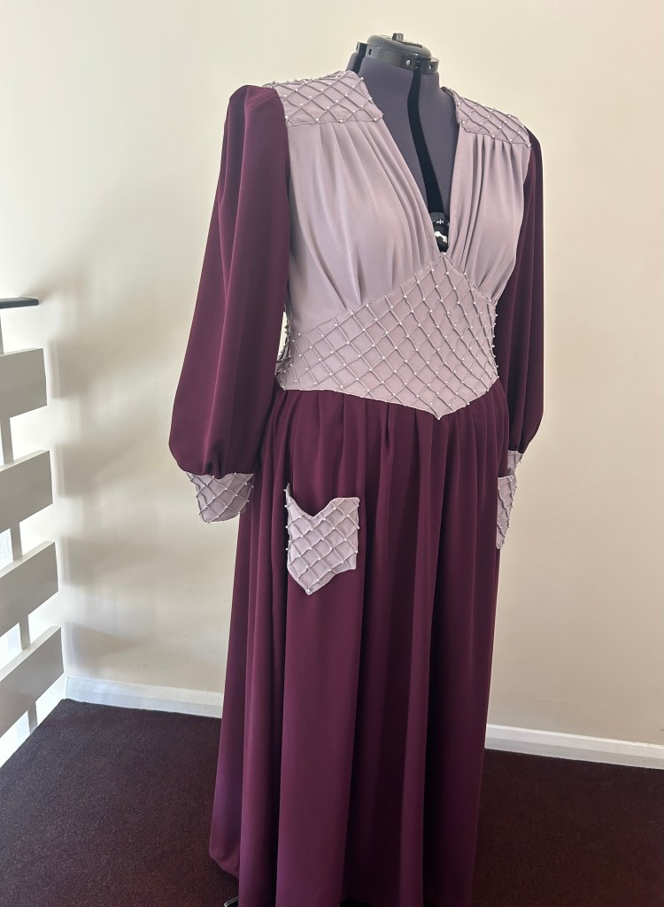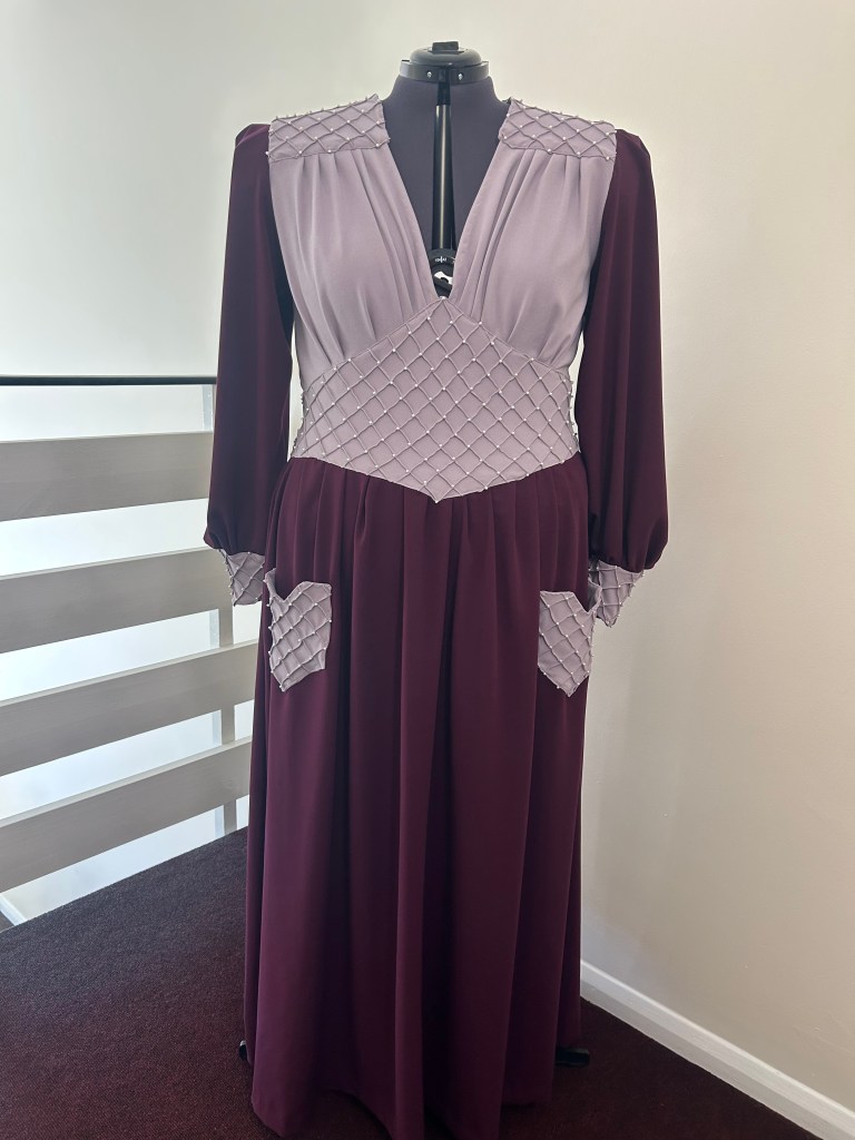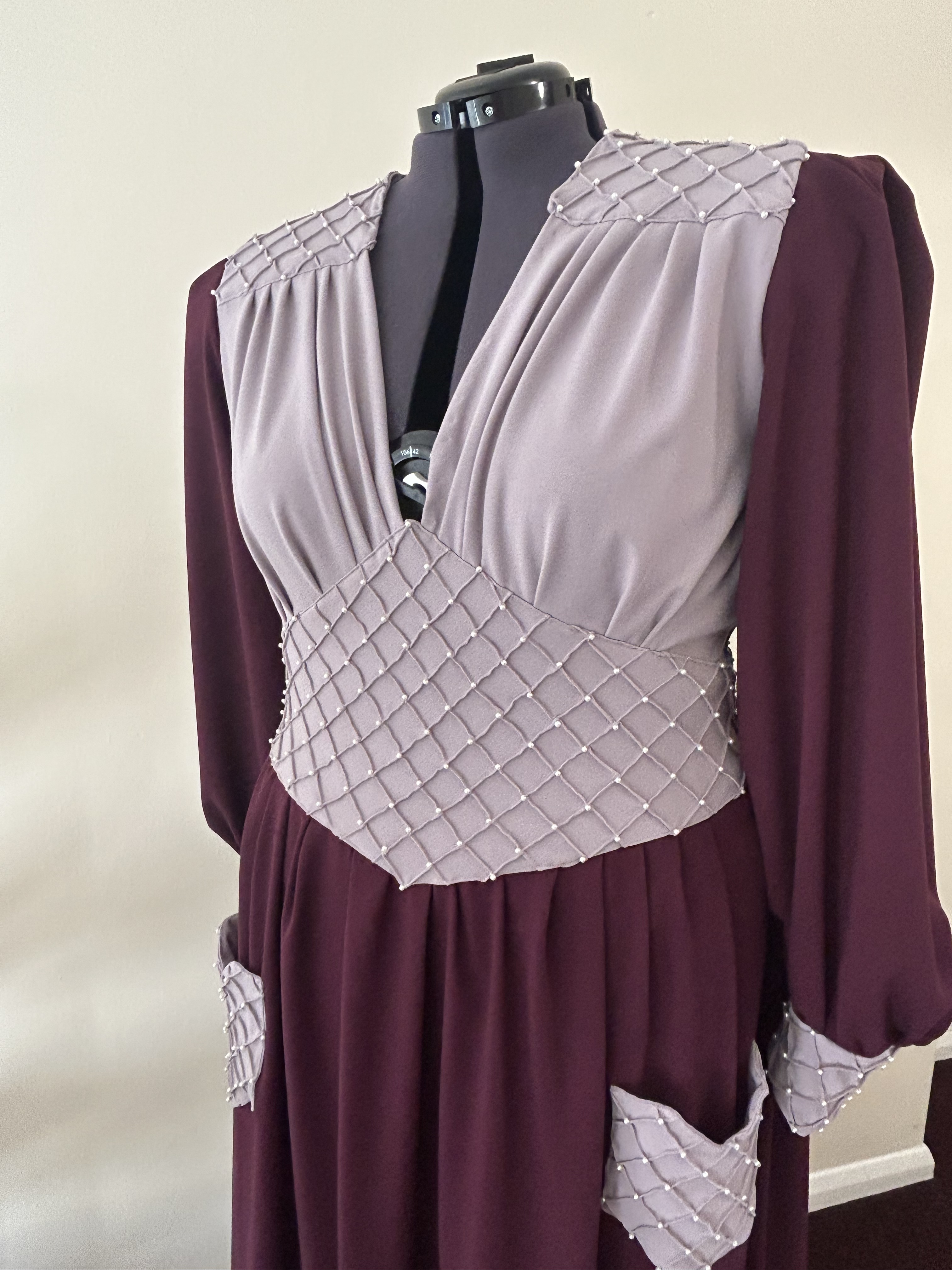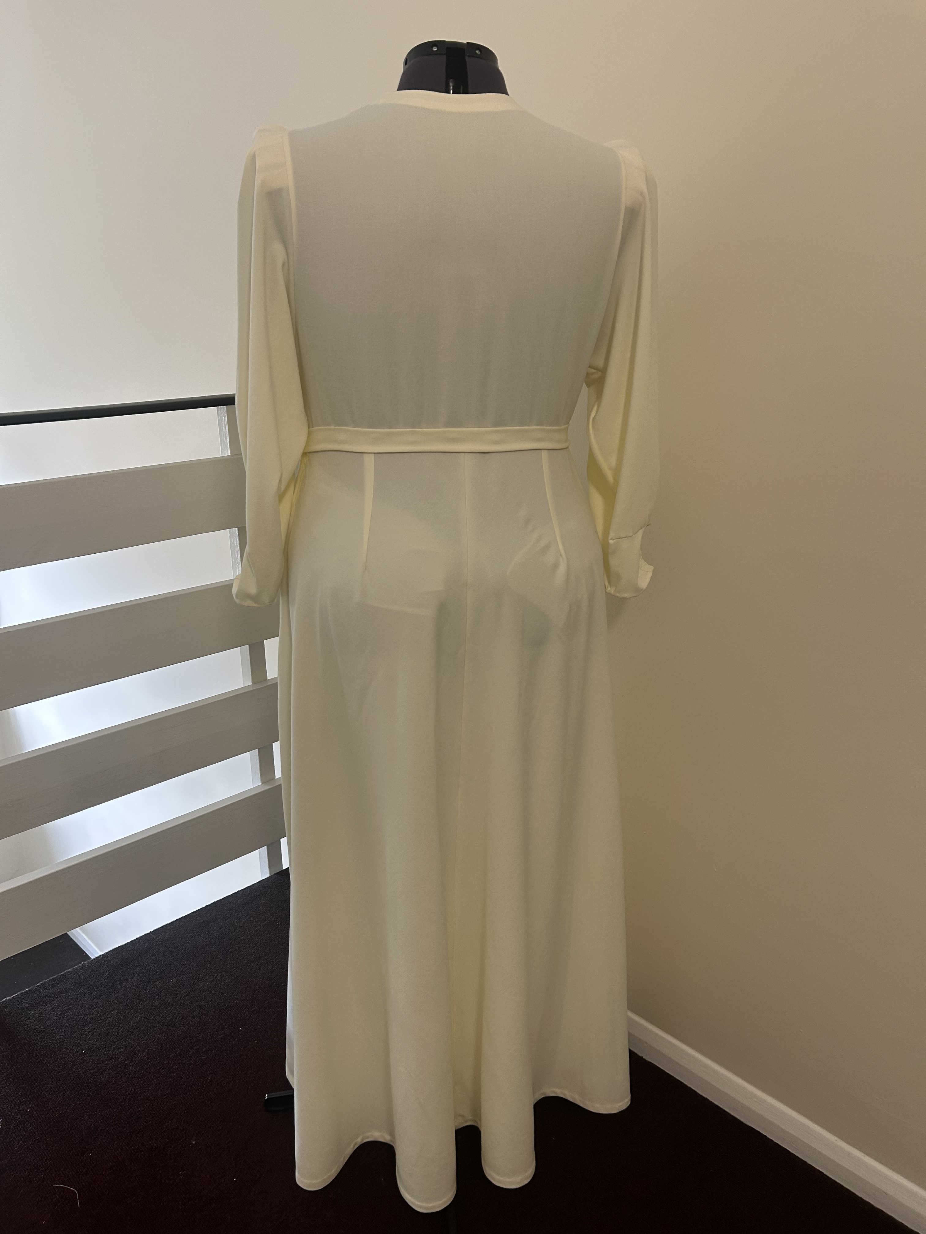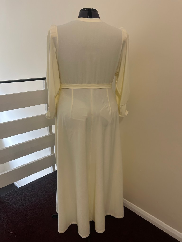 This beautiful early 1930s style dress in navy viscose rayon crepe with lovely burnt orange silk crepe back satin shawl scarf style collar and wing details in sleeves scream all things 1930s in their art deco glory. The light brick coloured square bakelite buttons featured down the front of the bodice , the back of the gathered collar with a flap, and the sleeves with wing detailing in burnt orange silk create a fantastic contrast to the dark navy of the mid-calf length dress with a pleat down the centre seam and narrow long sleeves, creating a typical of silhouette of the era. The belt has a small vintage bakelite buckle. Fastening at the side seam with snap fasteners.
