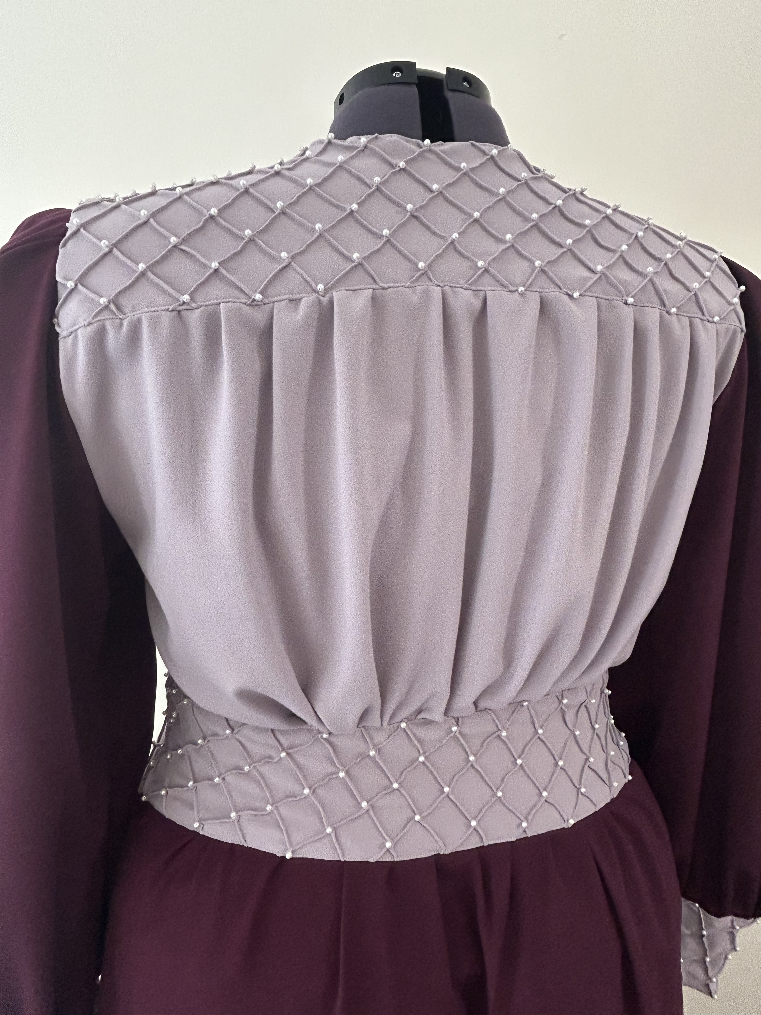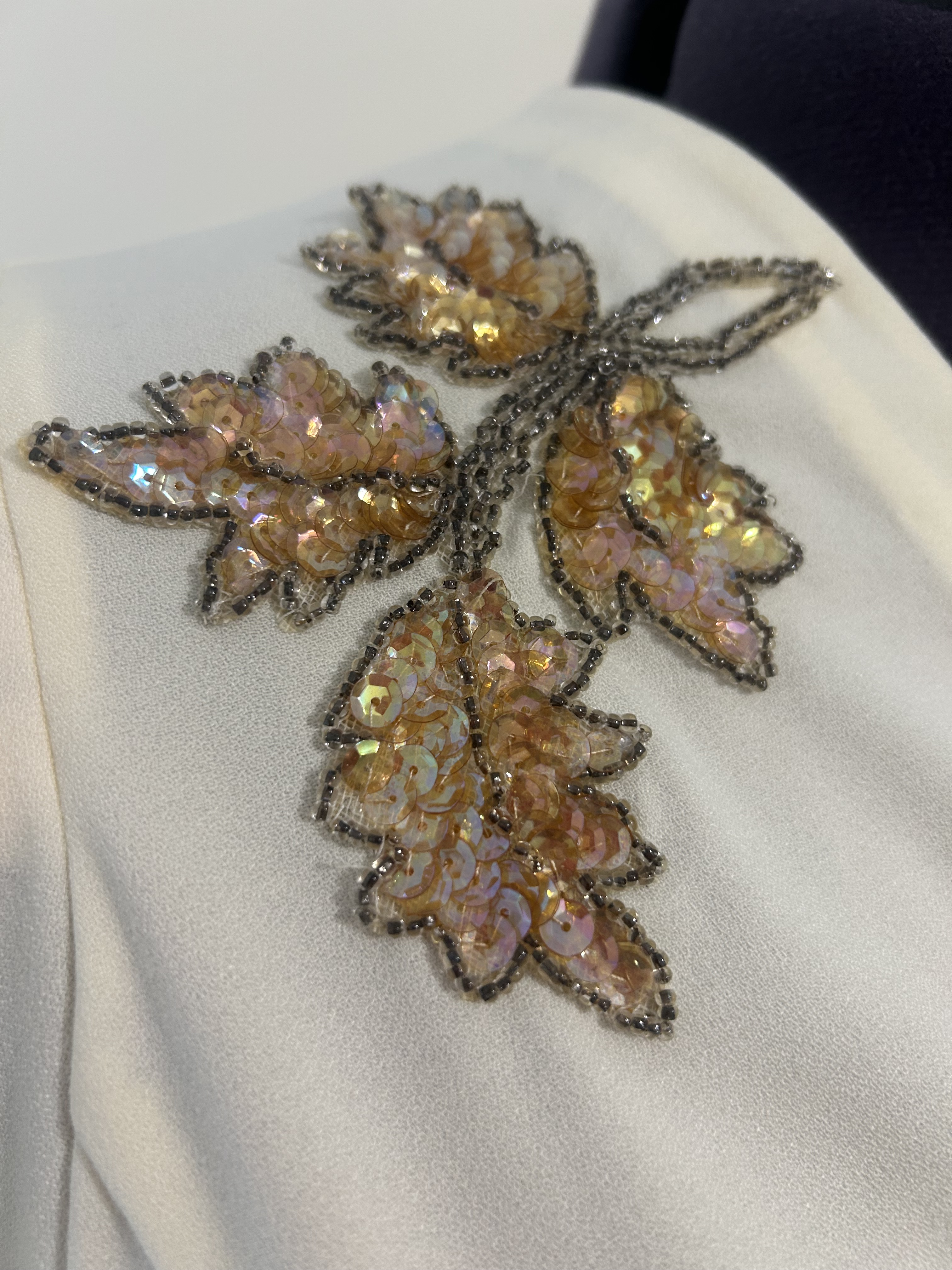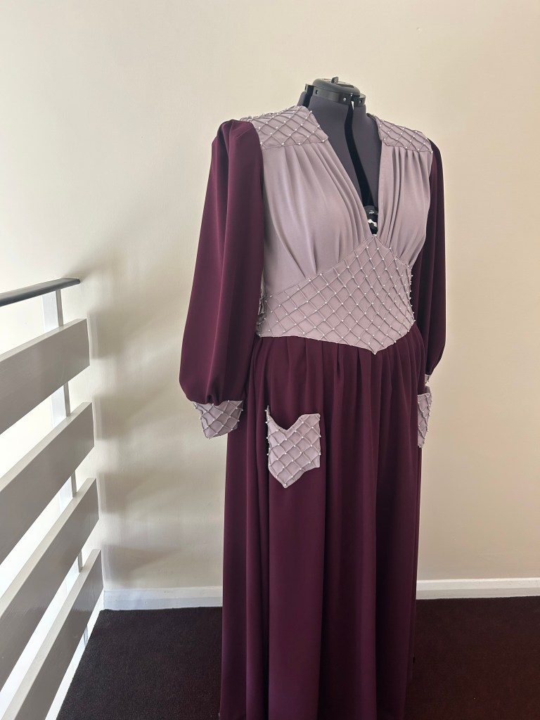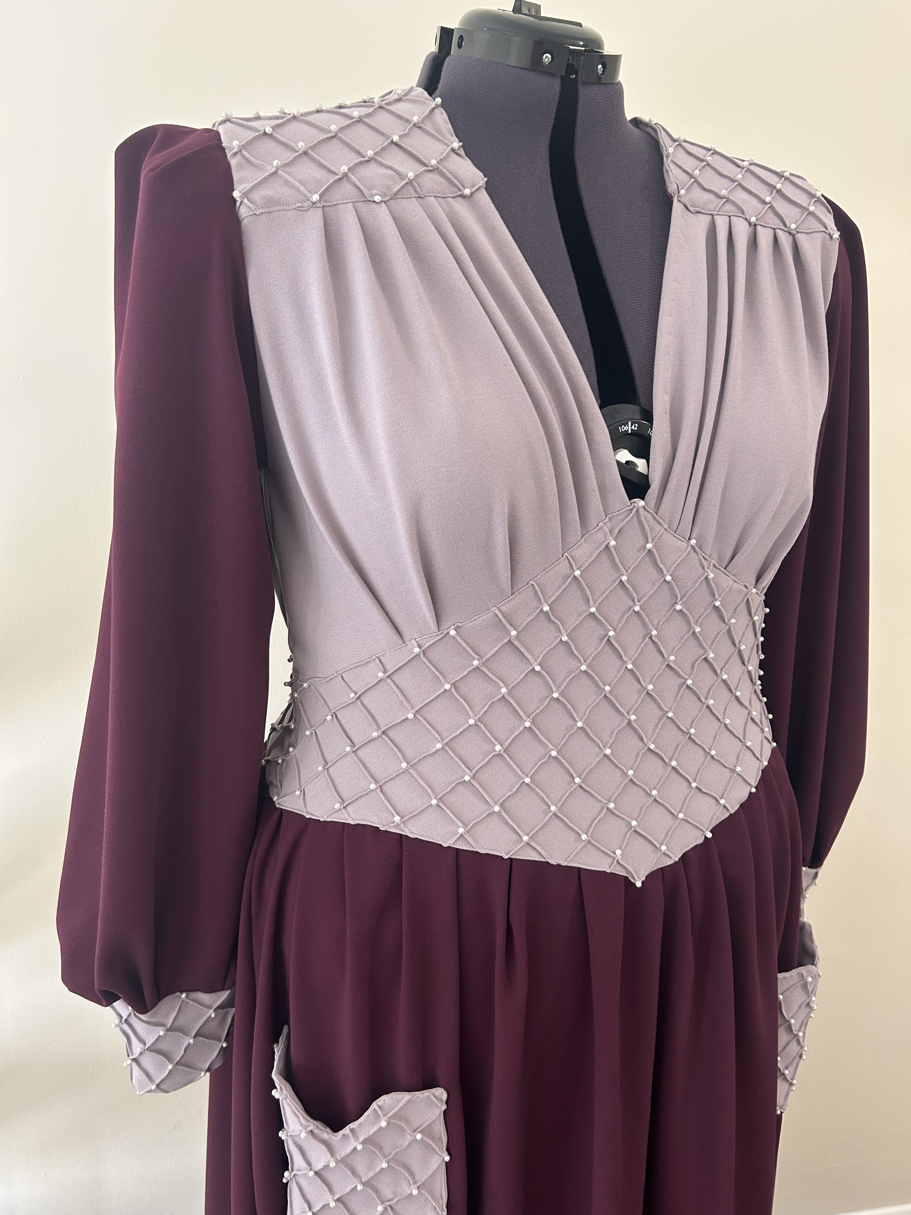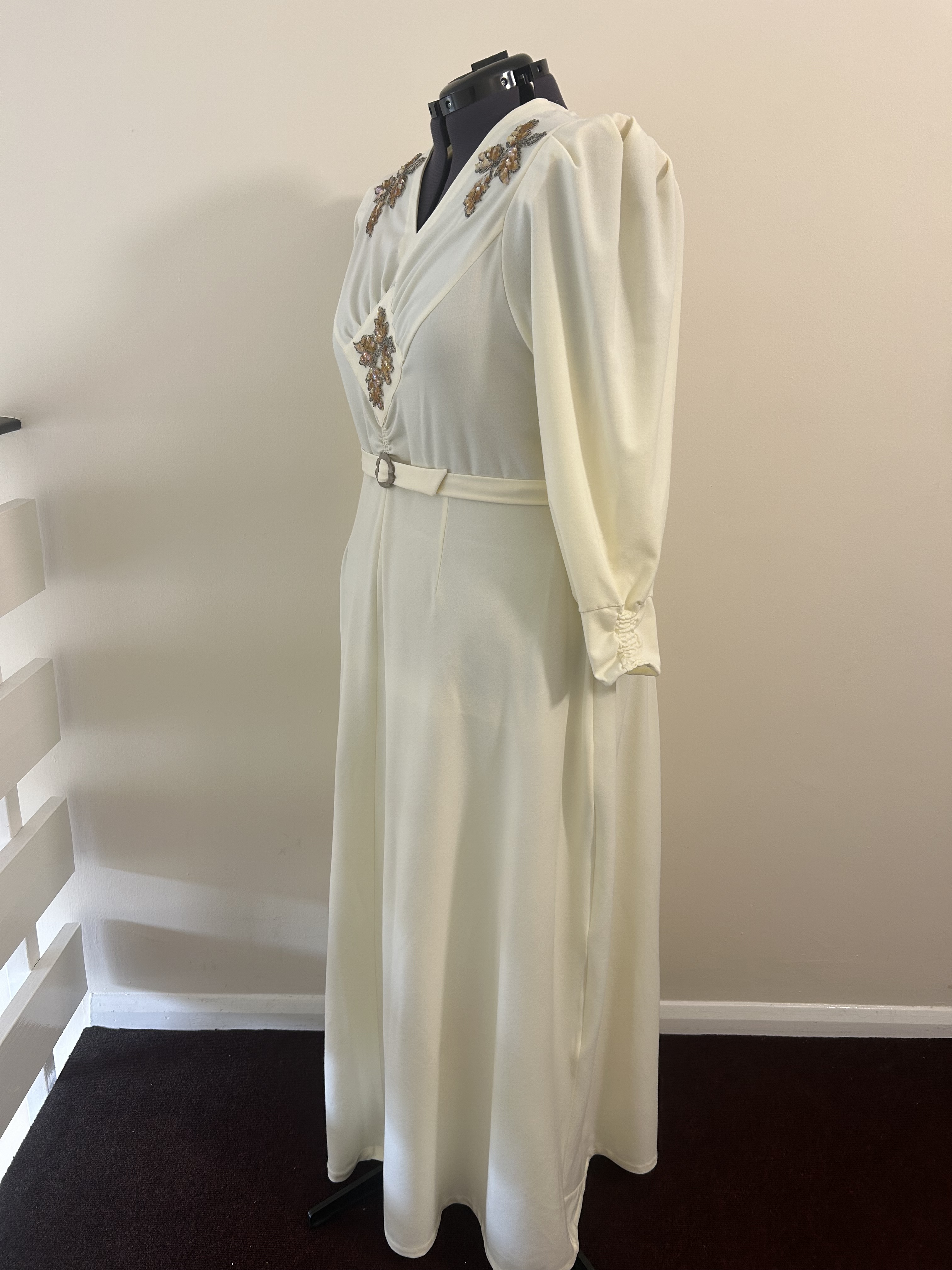 This beautiful early 1930s style dress in navy viscose rayon crepe with lovely burnt orange silk crepe back satin shawl scarf style collar and wing details in sleeves scream all things 1930s in their art deco glory. The light brick coloured square bakelite buttons featured down the front of the bodice , the back of the gathered collar with a flap, and the sleeves with wing detailing in burnt orange silk create a fantastic contrast to the dark navy of the mid-calf length dress with a pleat down the centre seam and narrow long sleeves, creating a typical of silhouette of the era. The belt has a small vintage bakelite buckle. Fastening at the side seam with snap fasteners.