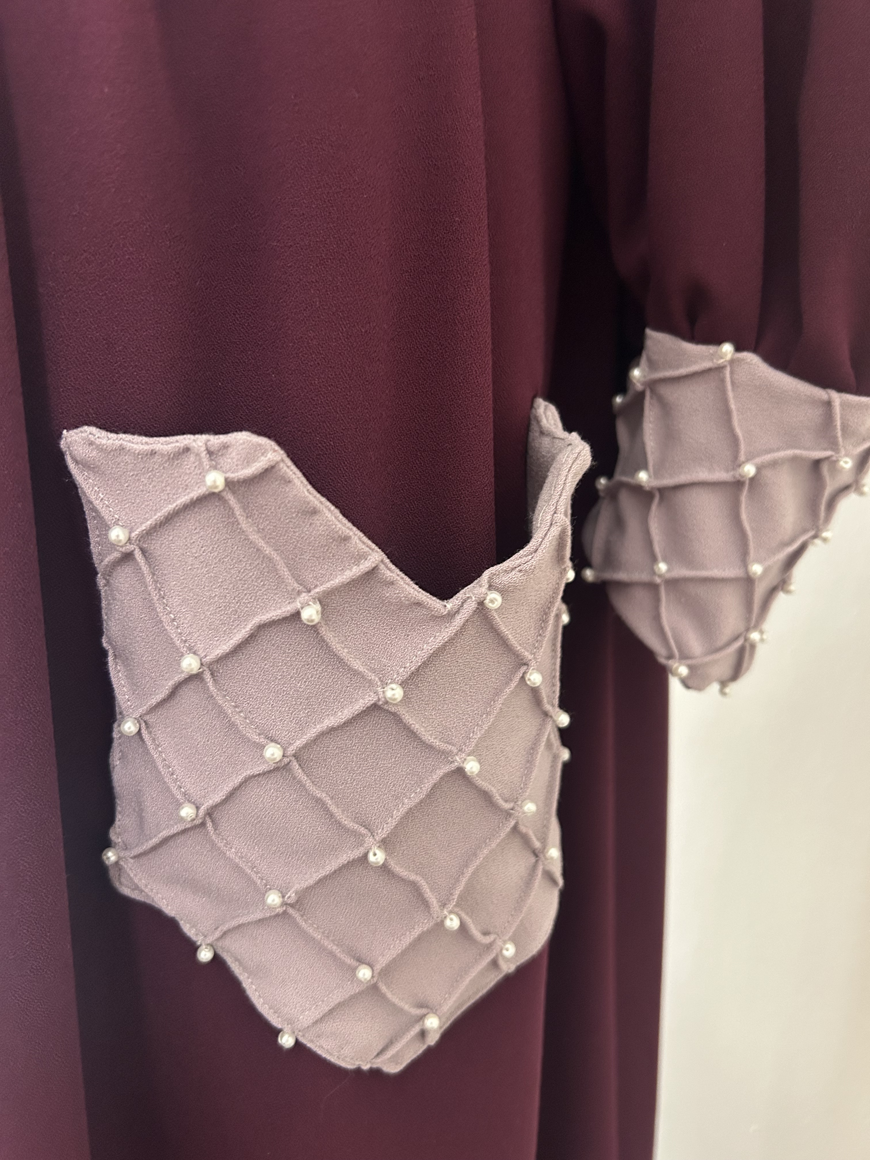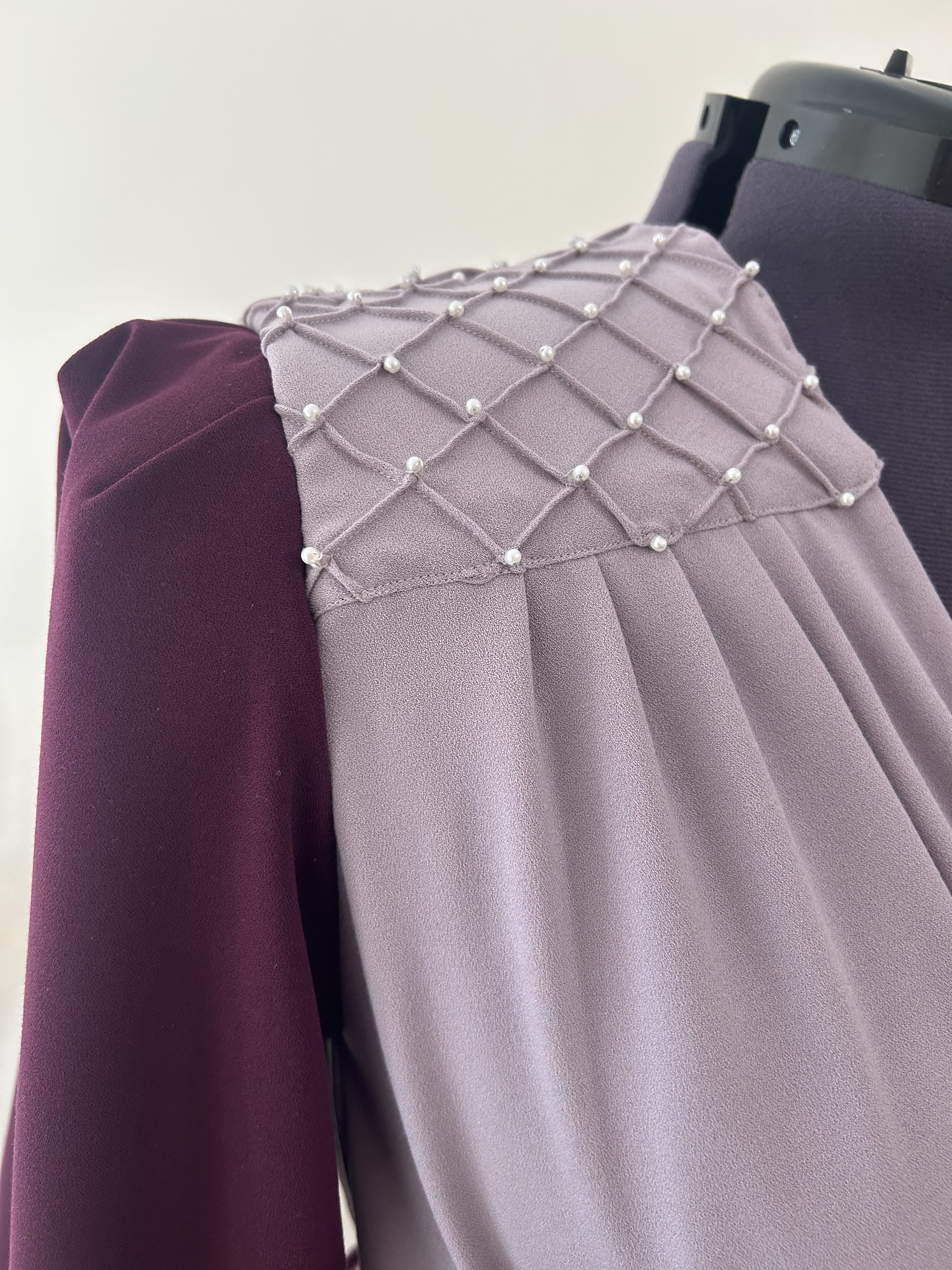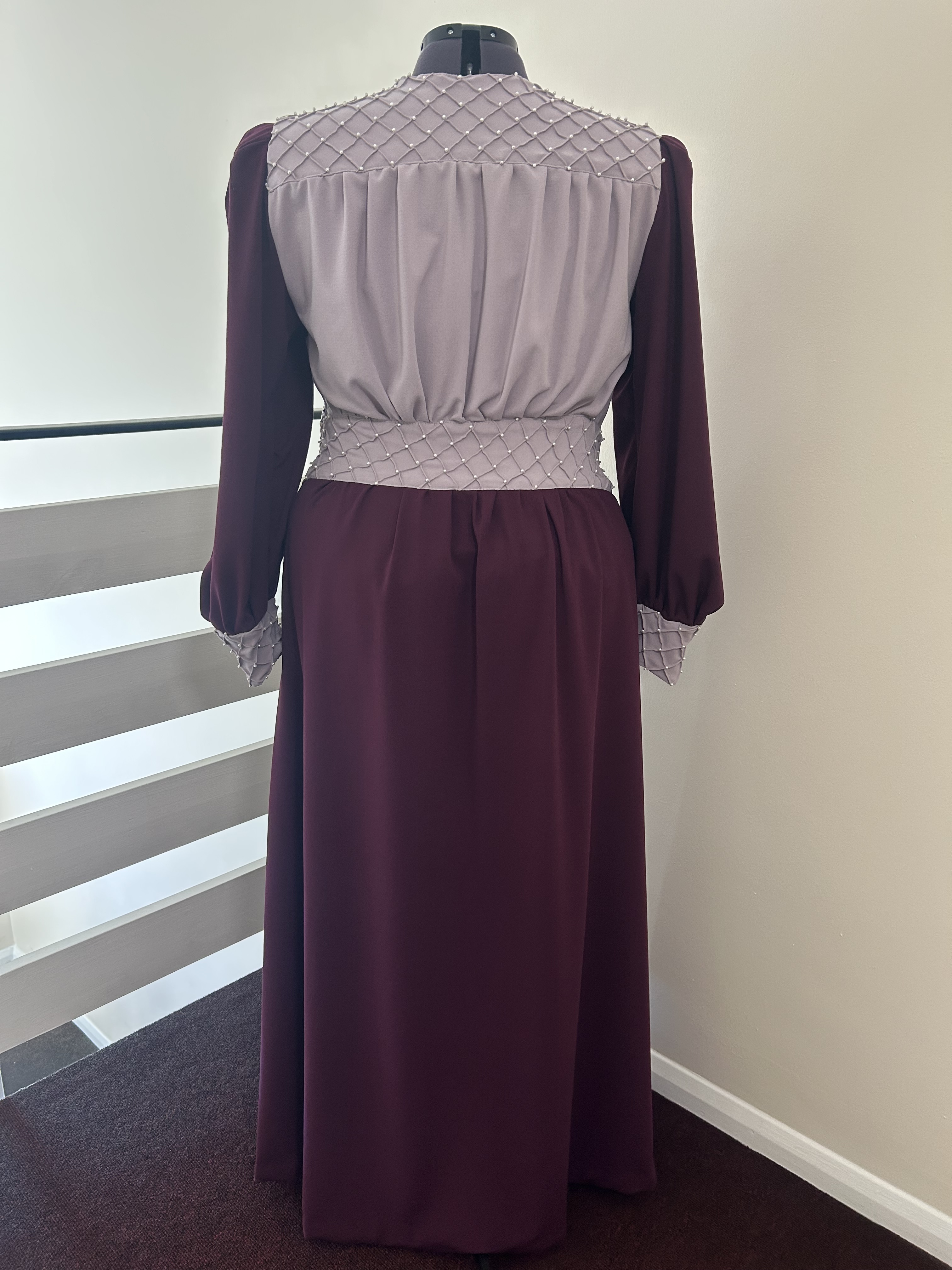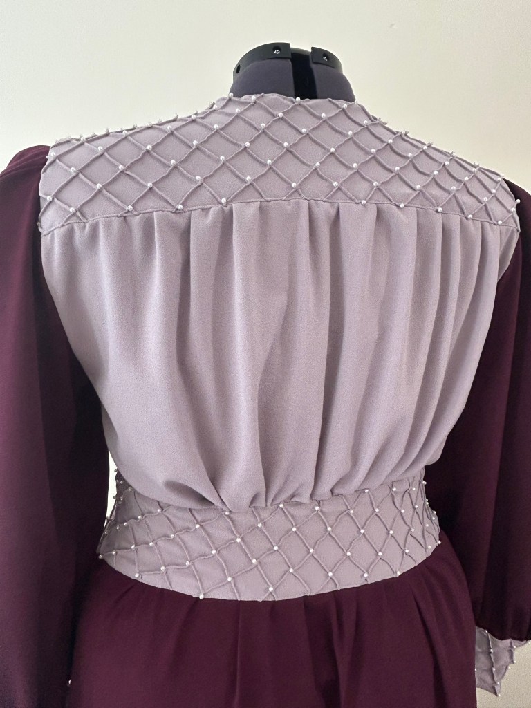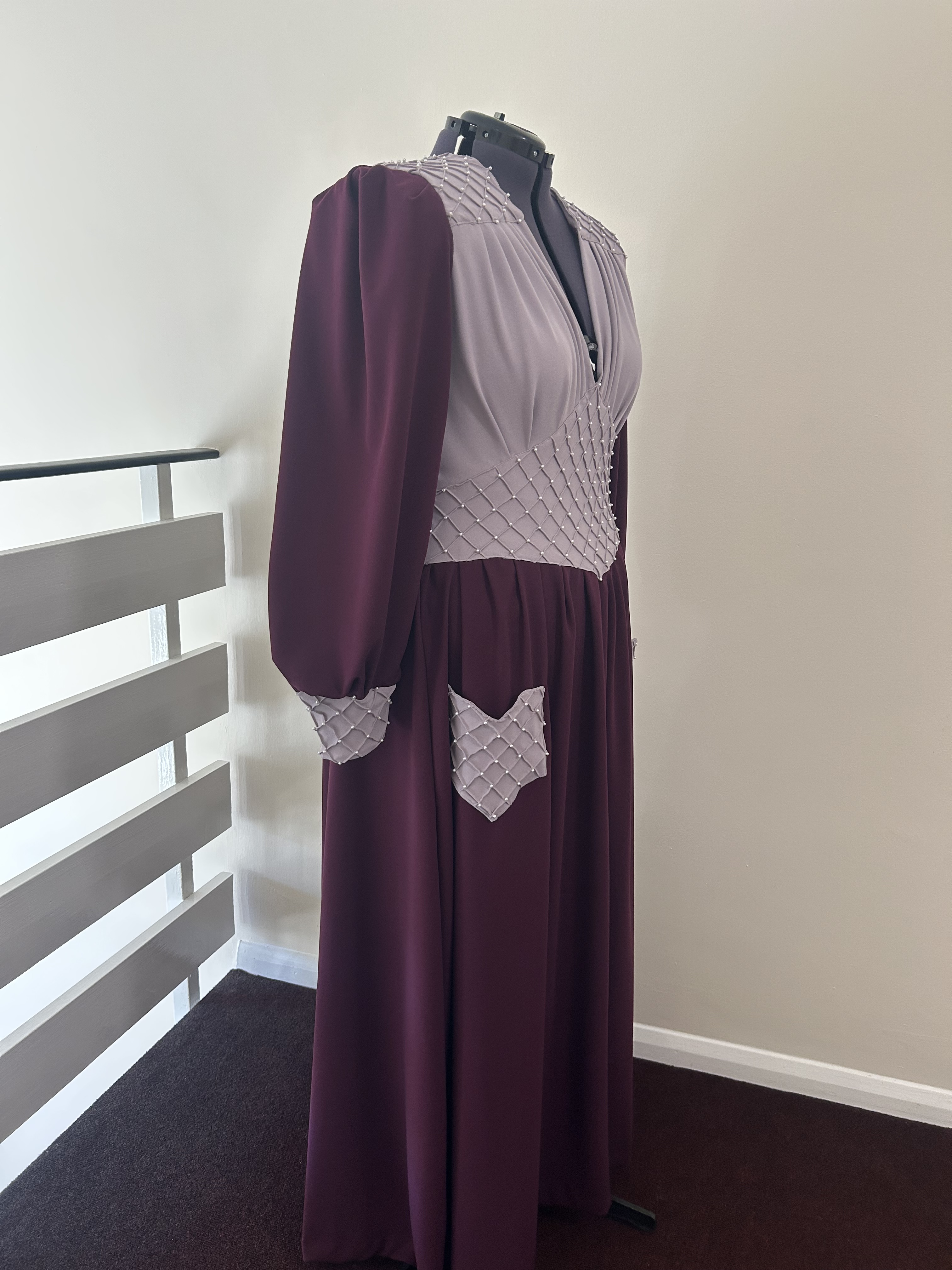 This beautiful early 1930s style dress in navy viscose rayon crepe with lovely burnt orange silk crepe back satin shawl scarf style collar and wing details in sleeves scream all things 1930s in their art deco glory. The light brick coloured square bakelite buttons featured down the front of the bodice , the back of the gathered collar with a flap, and the sleeves with wing detailing in burnt orange silk create a fantastic contrast to the dark navy of the mid-calf length dress with a pleat down the centre seam and narrow long sleeves, creating a typical of silhouette of the era. The belt has a small vintage bakelite buckle. Fastening at the side seam with snap fasteners.