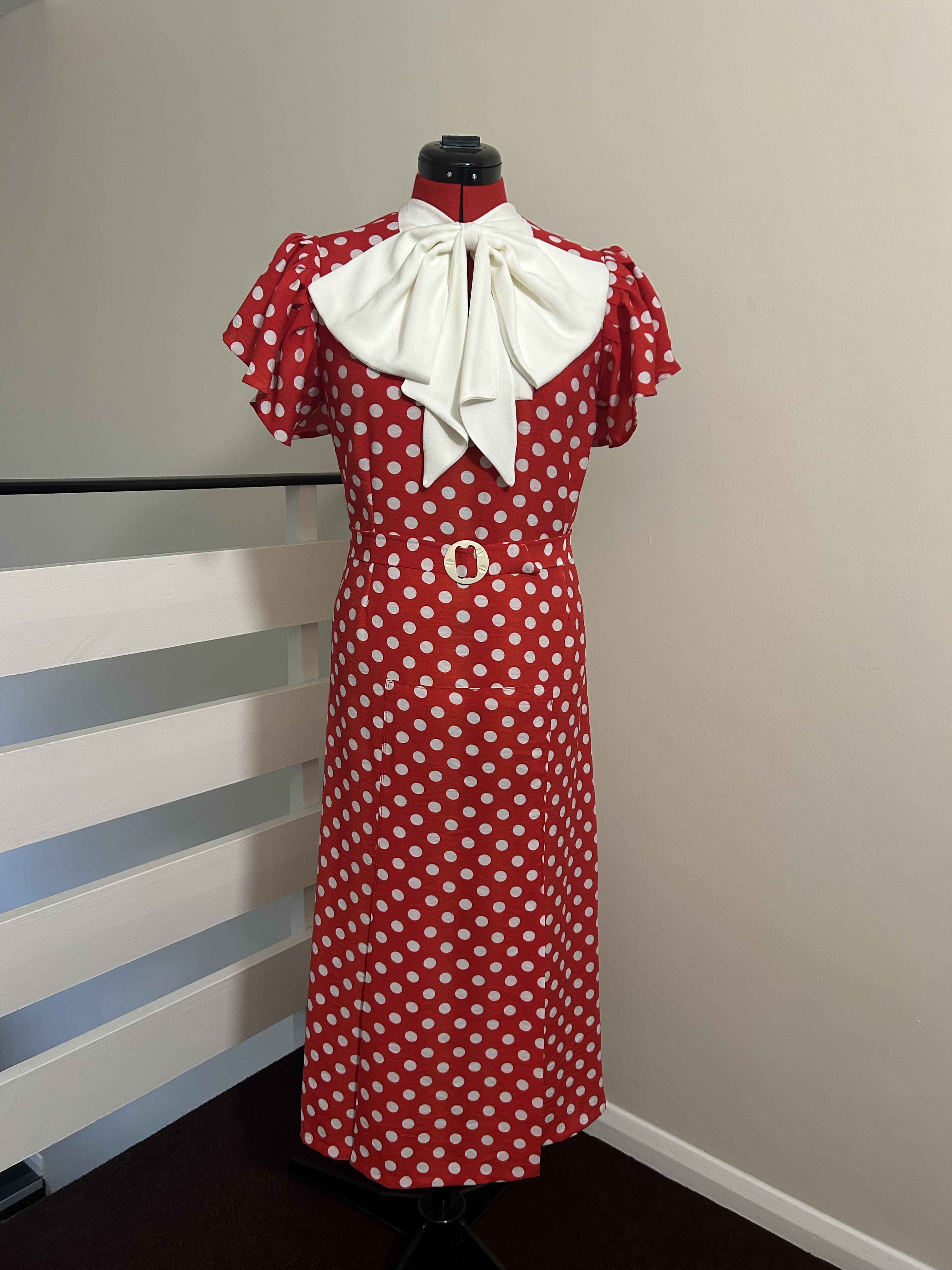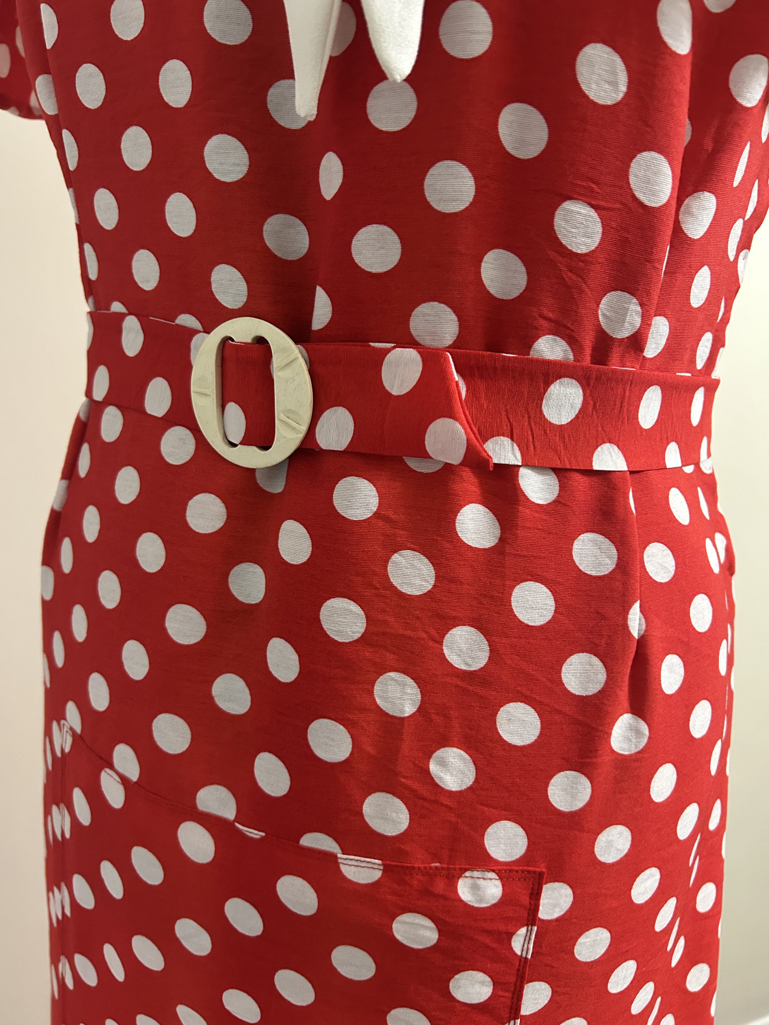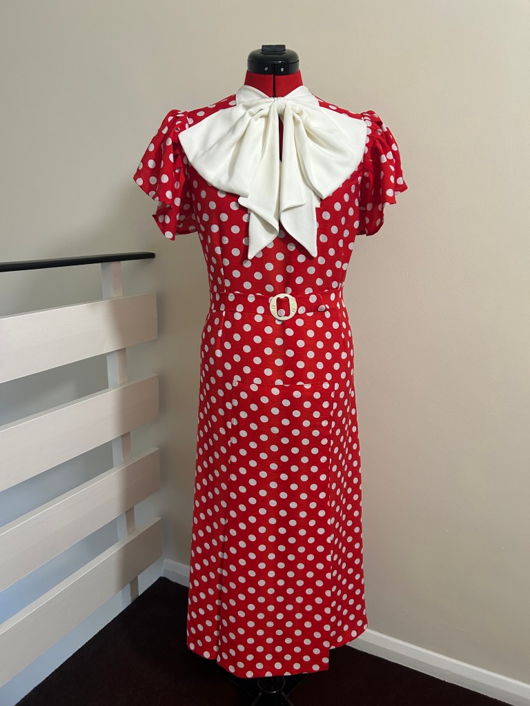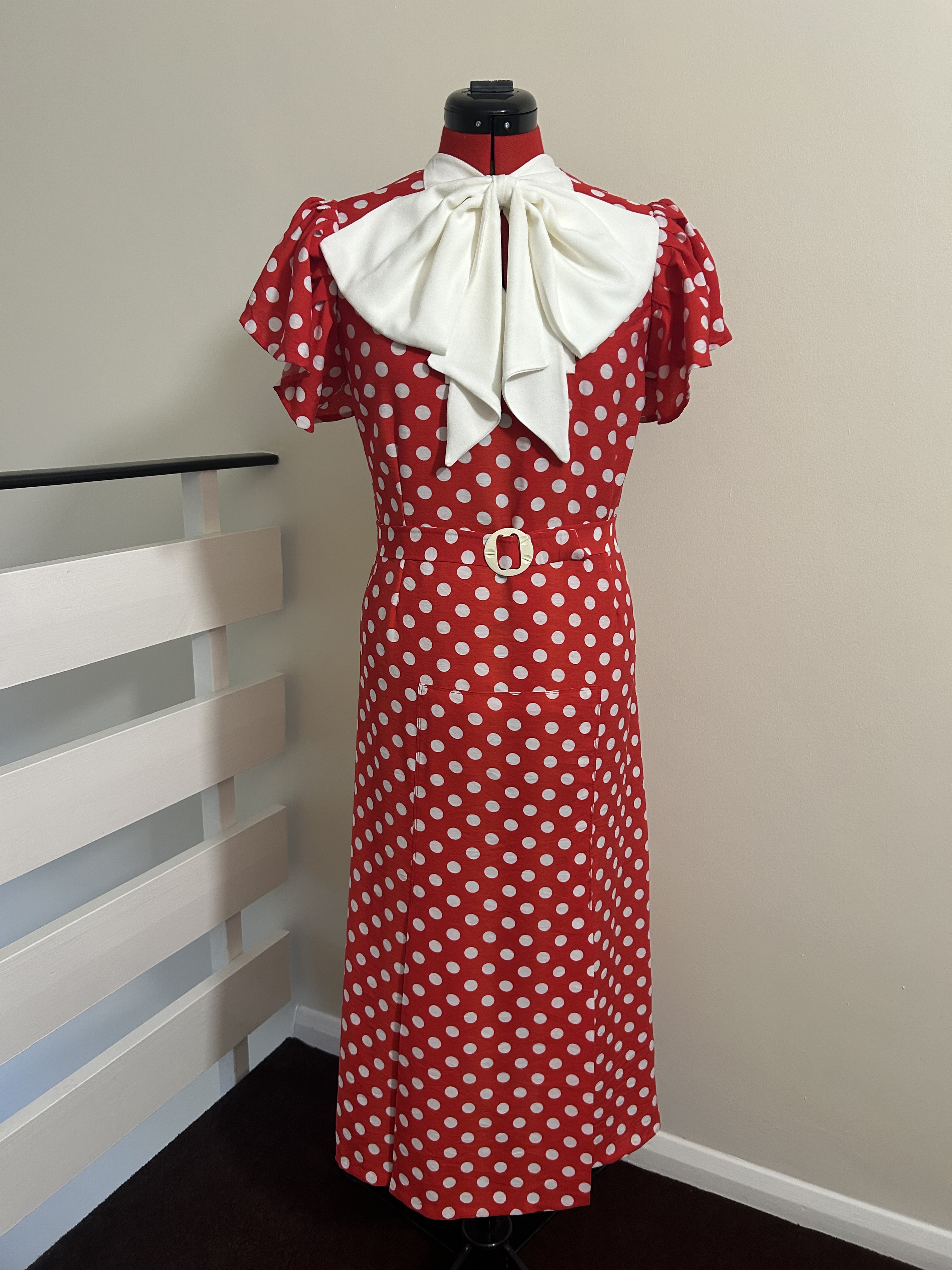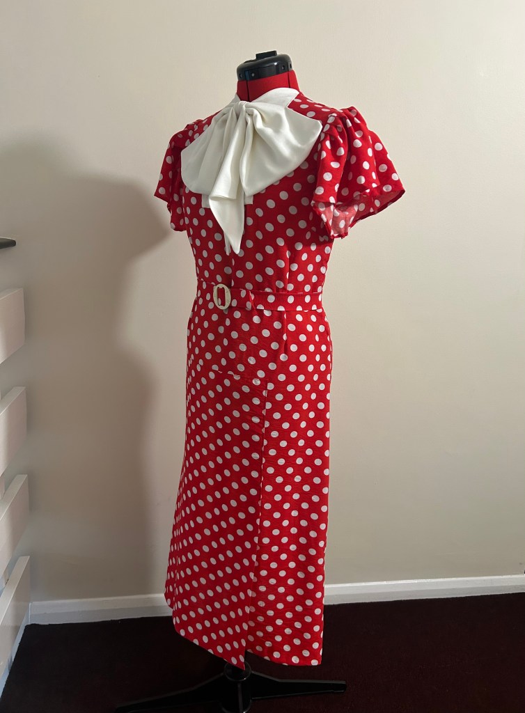 This beautiful early 1930s style dress in navy viscose rayon crepe with lovely burnt orange silk crepe back satin shawl scarf style collar and wing details in sleeves scream all things 1930s in their art deco glory. The light brick coloured square bakelite buttons featured down the front of the bodice , the back of the gathered collar with a flap, and the sleeves with wing detailing in burnt orange silk create a fantastic contrast to the dark navy of the mid-calf length dress with a pleat down the centre seam and narrow long sleeves, creating a typical of silhouette of the era. The belt has a small vintage bakelite buckle. Fastening at the side seam with snap fasteners.