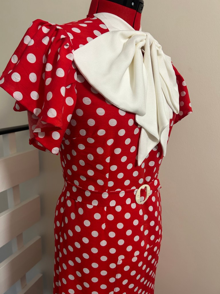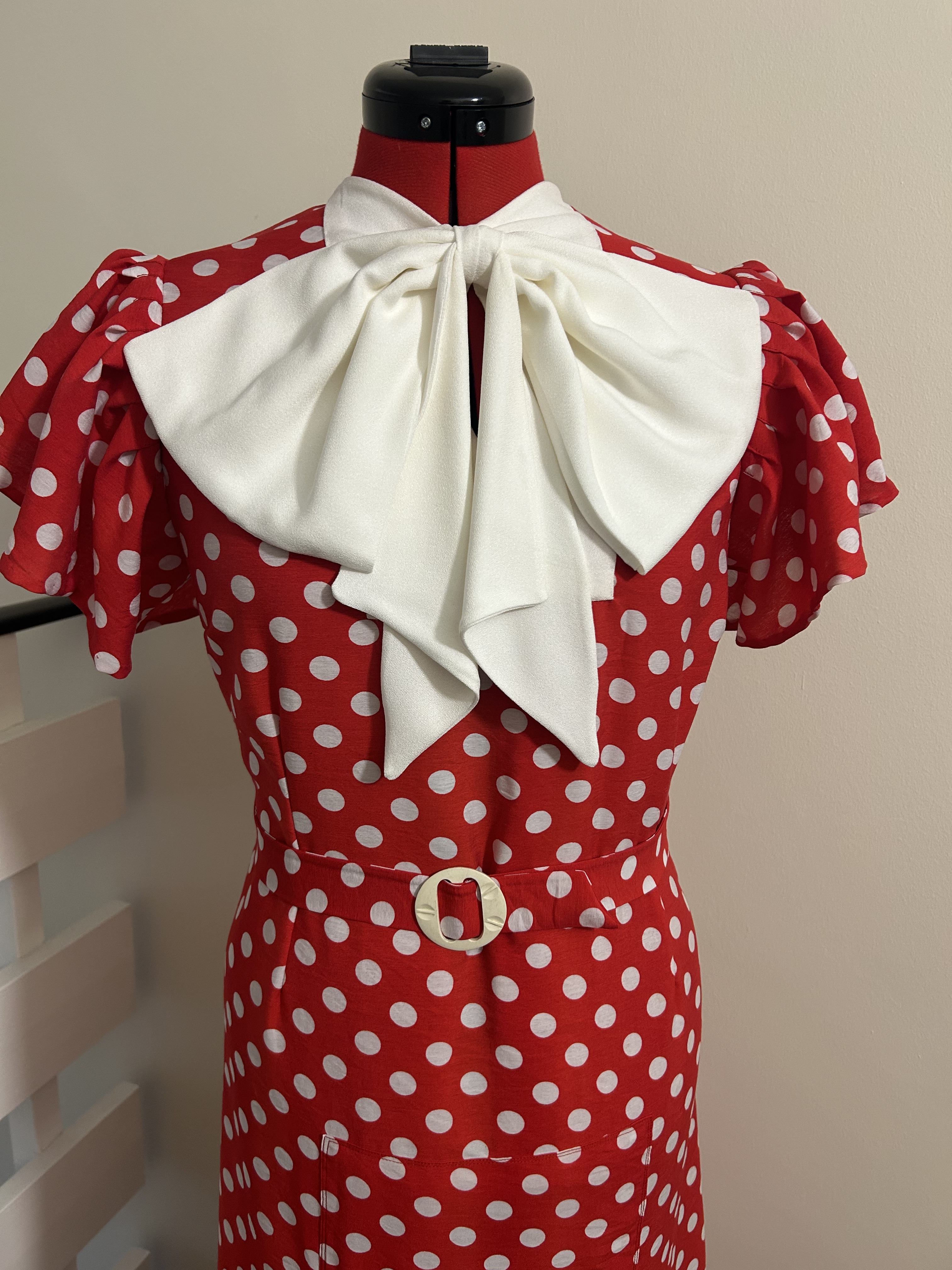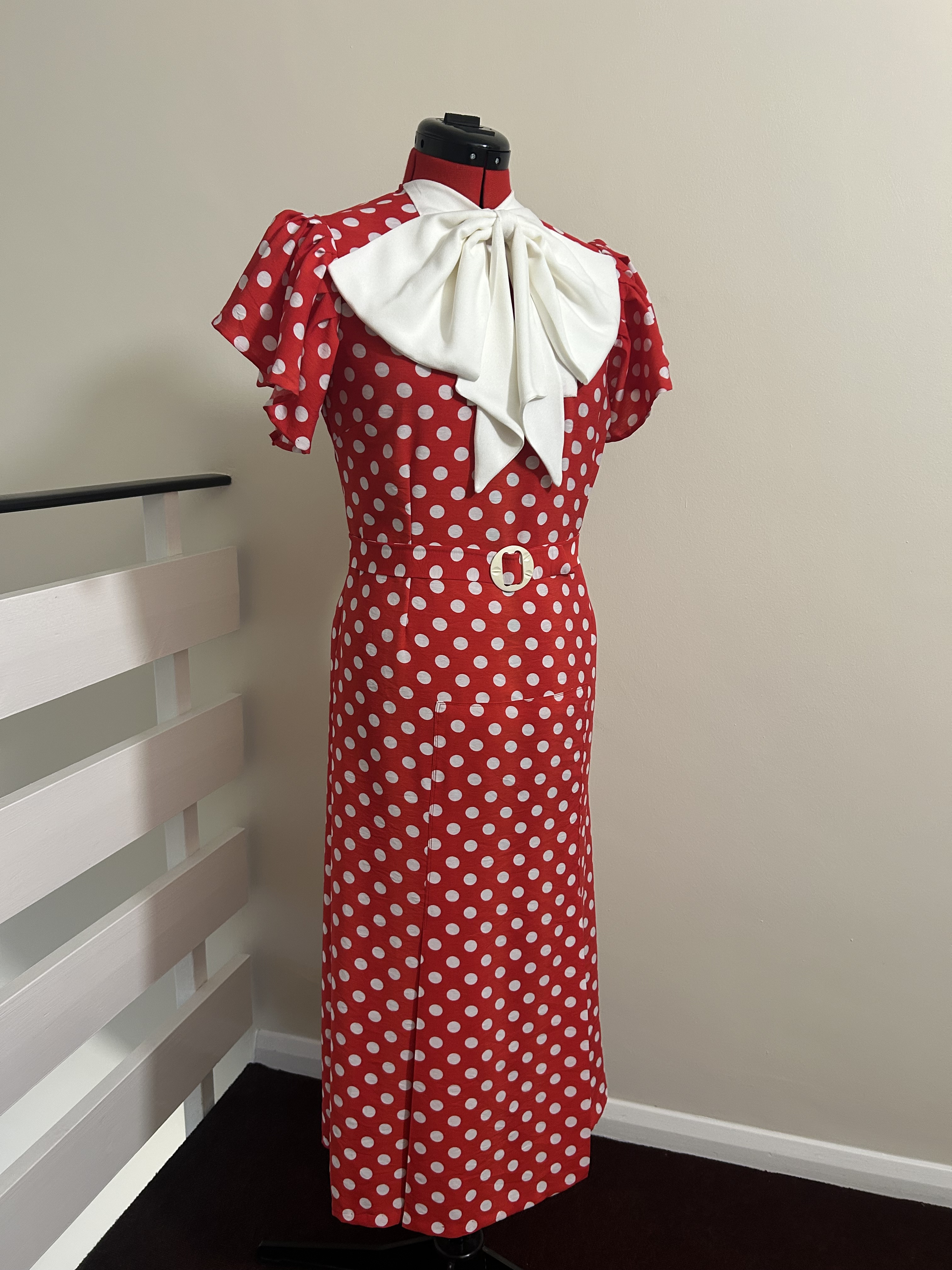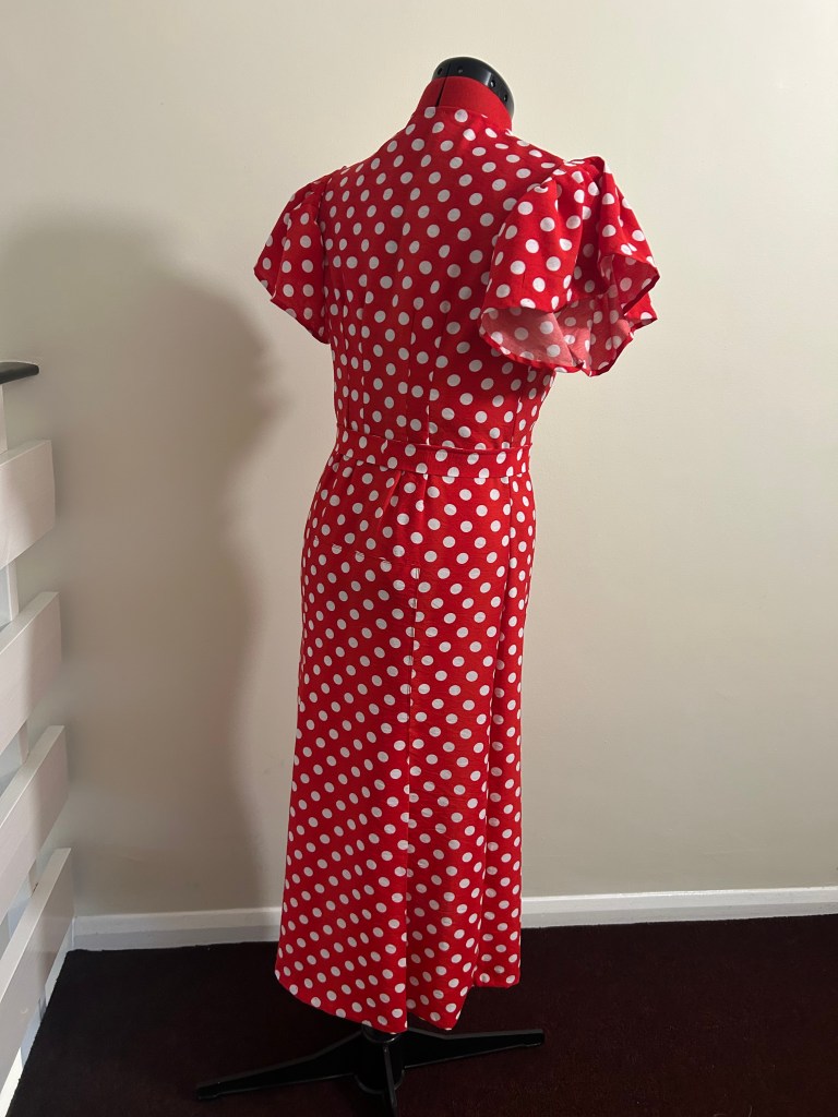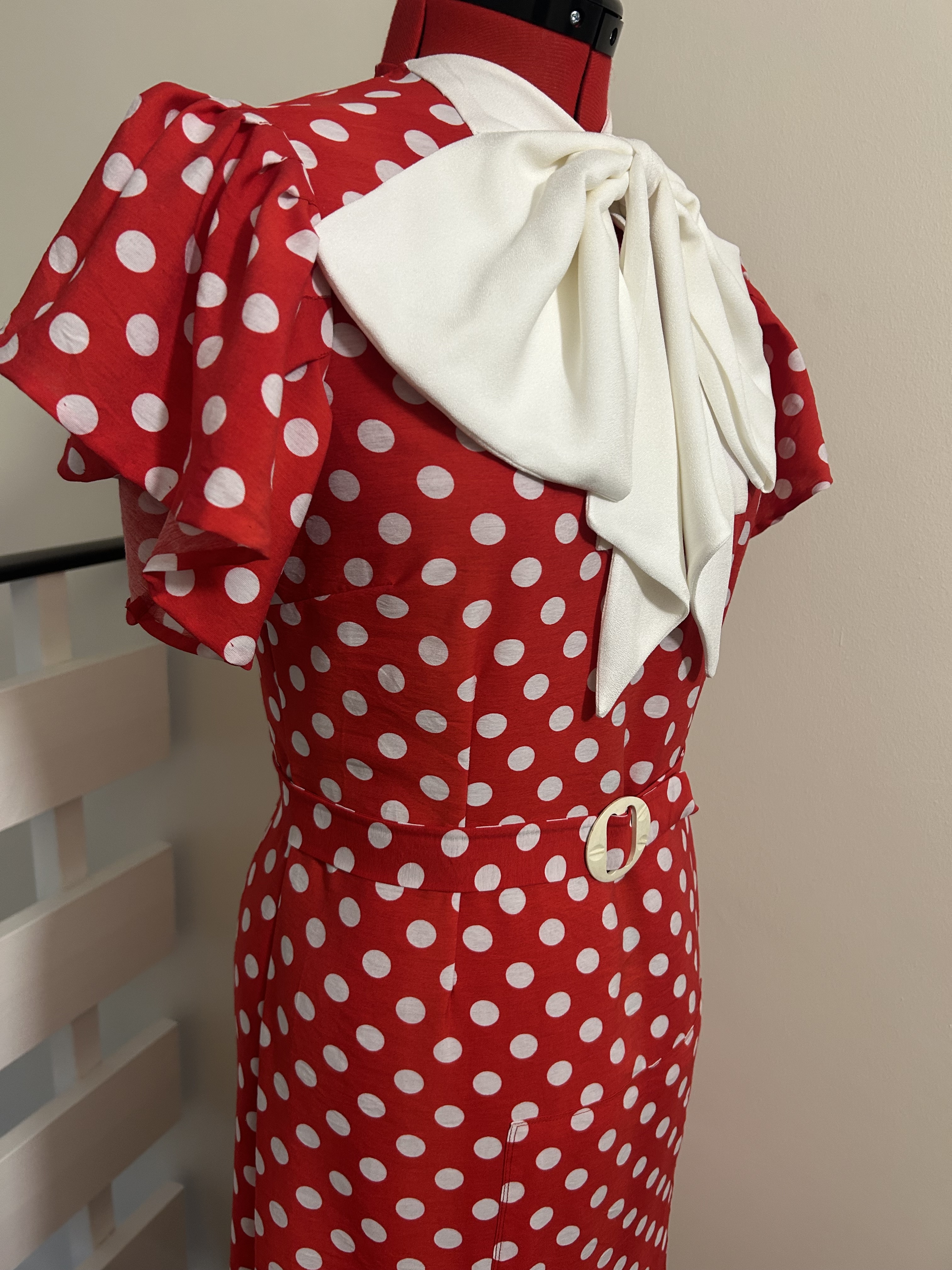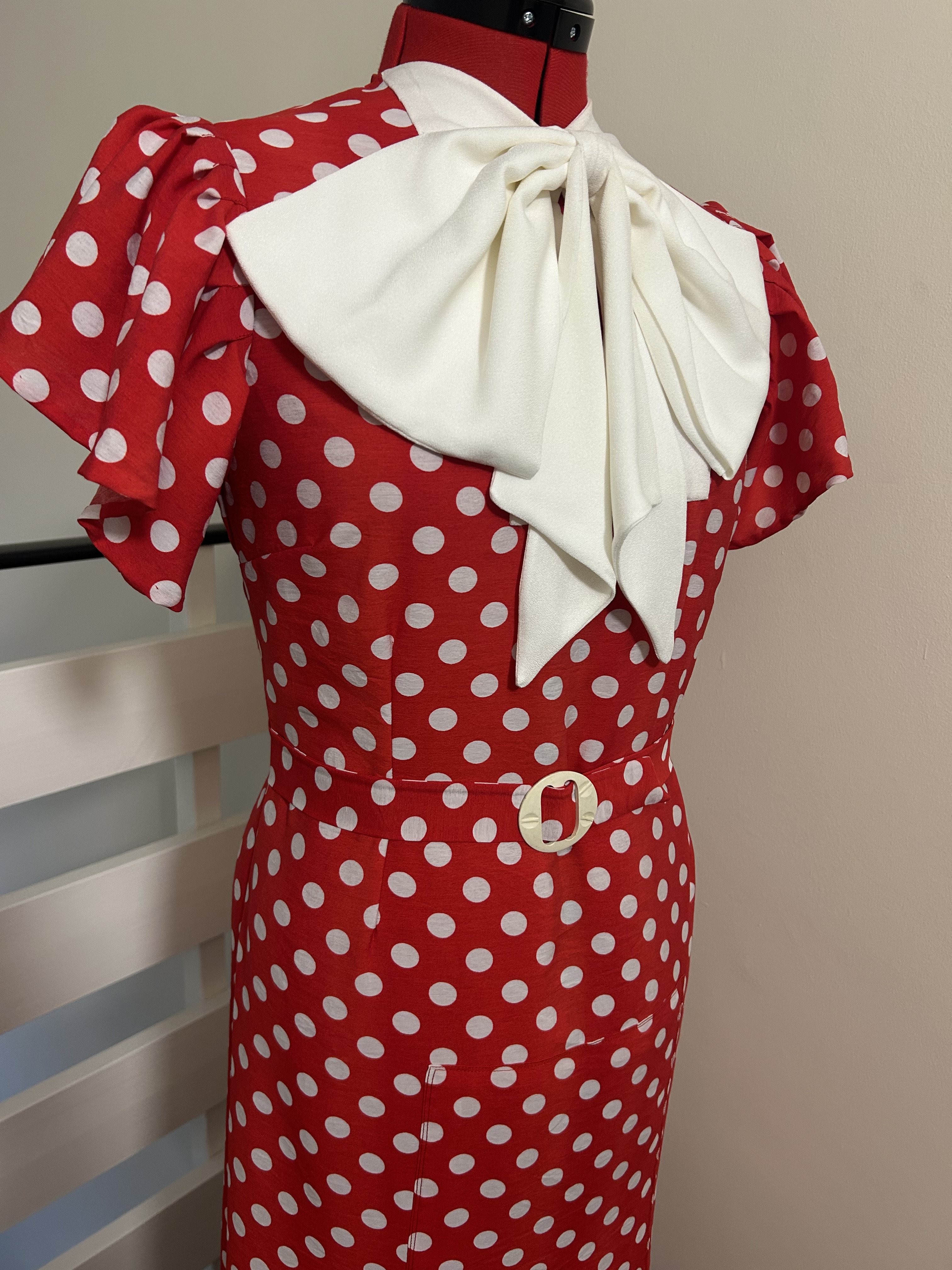 This beautiful early 1930s style dress in navy viscose rayon crepe with lovely burnt orange silk crepe back satin shawl scarf style collar and wing details in sleeves scream all things 1930s in their art deco glory. The light brick coloured square bakelite buttons featured down the front of the bodice , the back of the gathered collar with a flap, and the sleeves with wing detailing in burnt orange silk create a fantastic contrast to the dark navy of the mid-calf length dress with a pleat down the centre seam and narrow long sleeves, creating a typical of silhouette of the era. The belt has a small vintage bakelite buckle. Fastening at the side seam with snap fasteners.