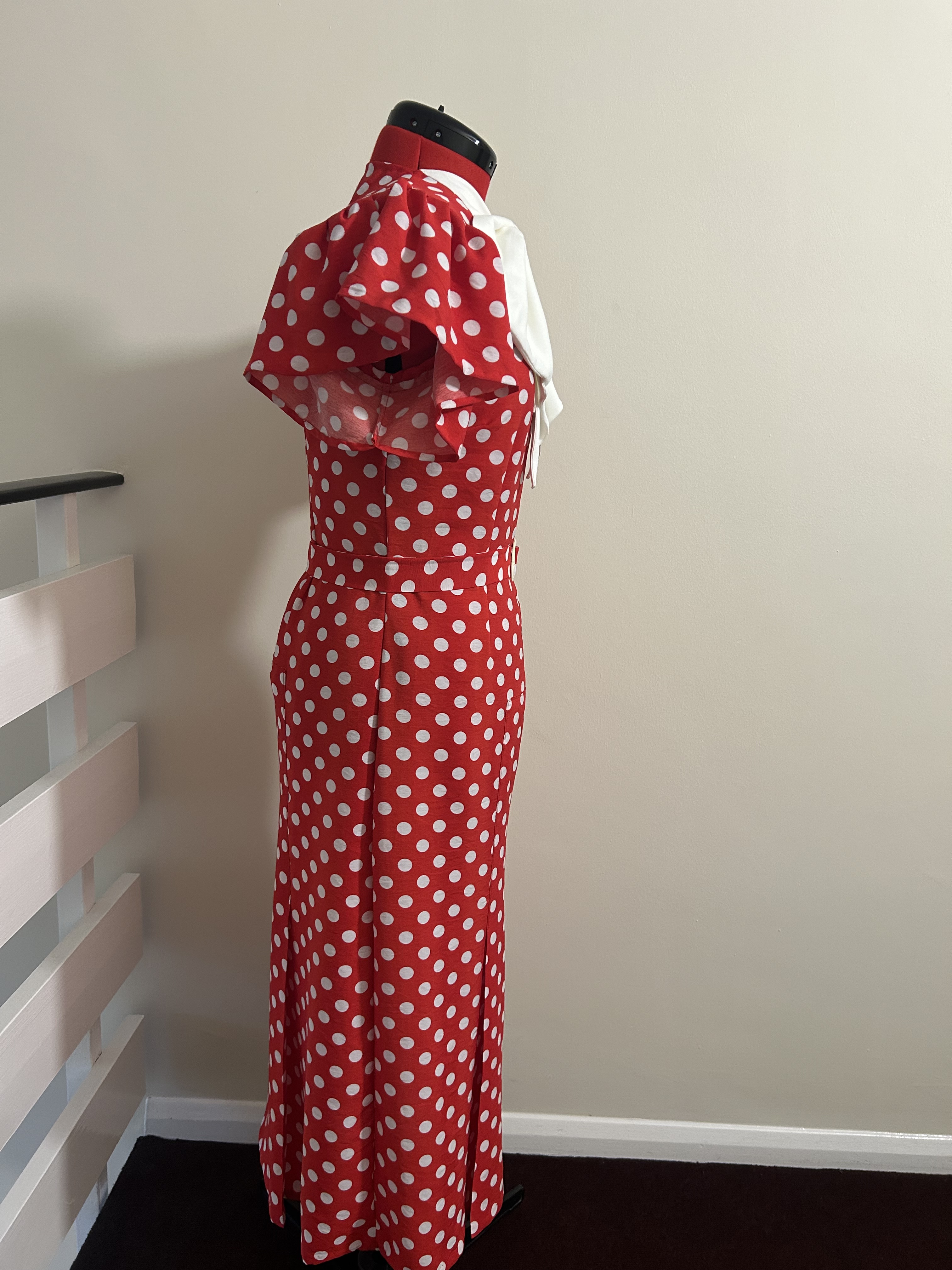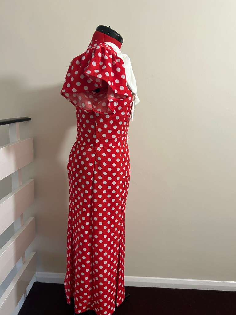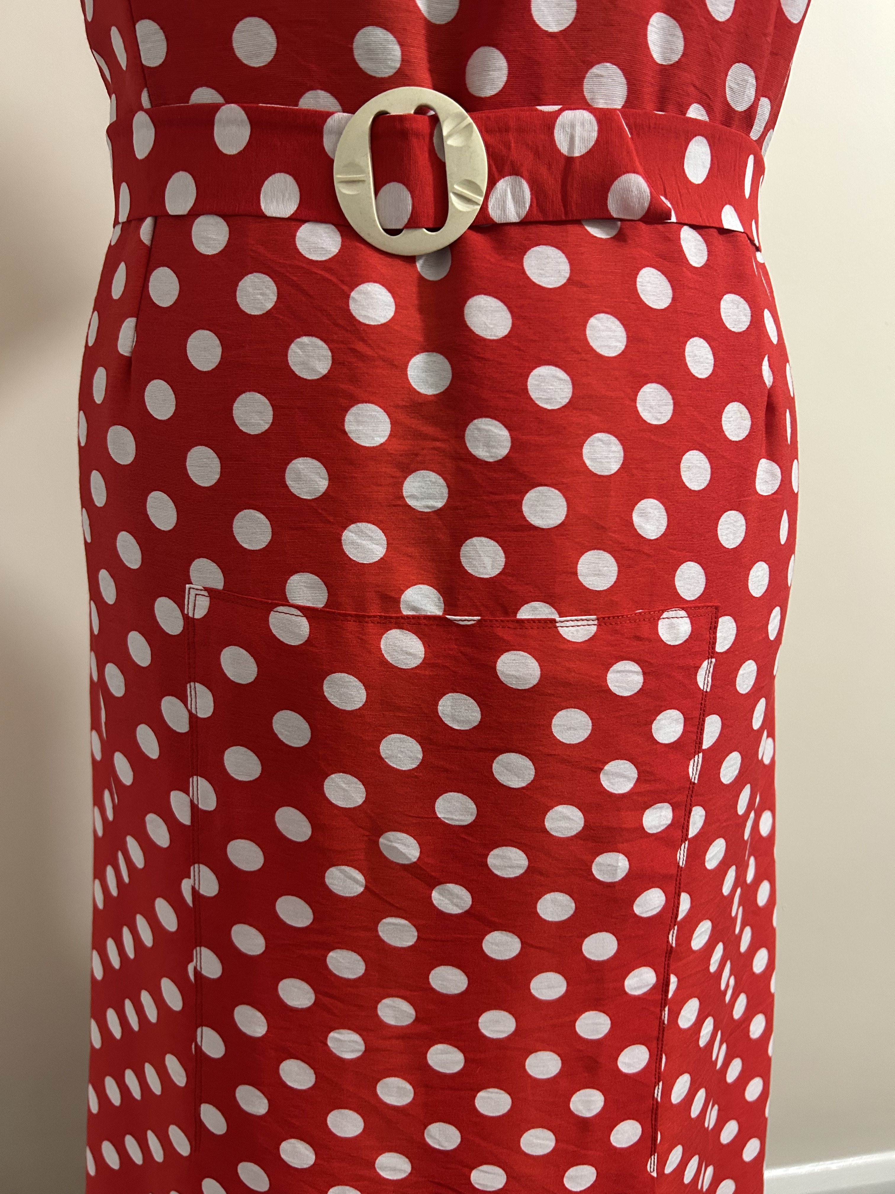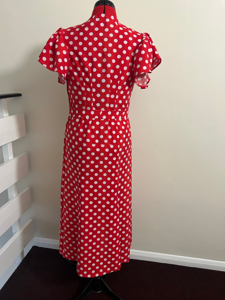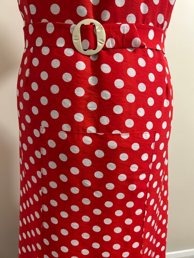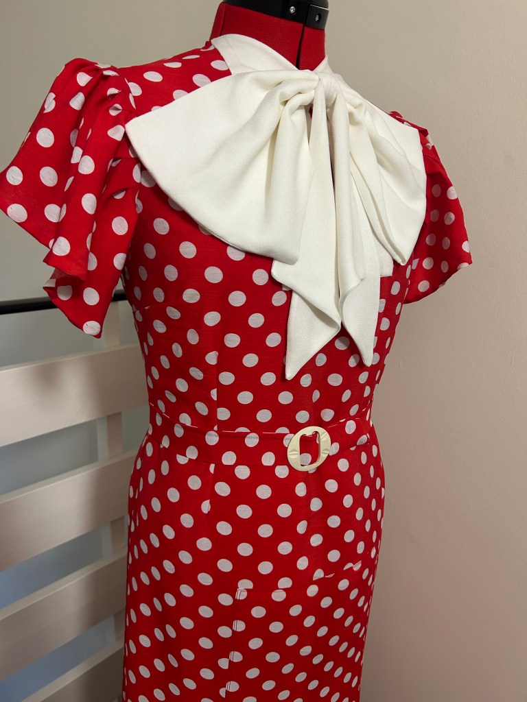 This beautiful early 1930s style dress in navy viscose rayon crepe with lovely burnt orange silk crepe back satin shawl scarf style collar and wing details in sleeves scream all things 1930s in their art deco glory. The light brick coloured square bakelite buttons featured down the front of the bodice , the back of the gathered collar with a flap, and the sleeves with wing detailing in burnt orange silk create a fantastic contrast to the dark navy of the mid-calf length dress with a pleat down the centre seam and narrow long sleeves, creating a typical of silhouette of the era. The belt has a small vintage bakelite buckle. Fastening at the side seam with snap fasteners.