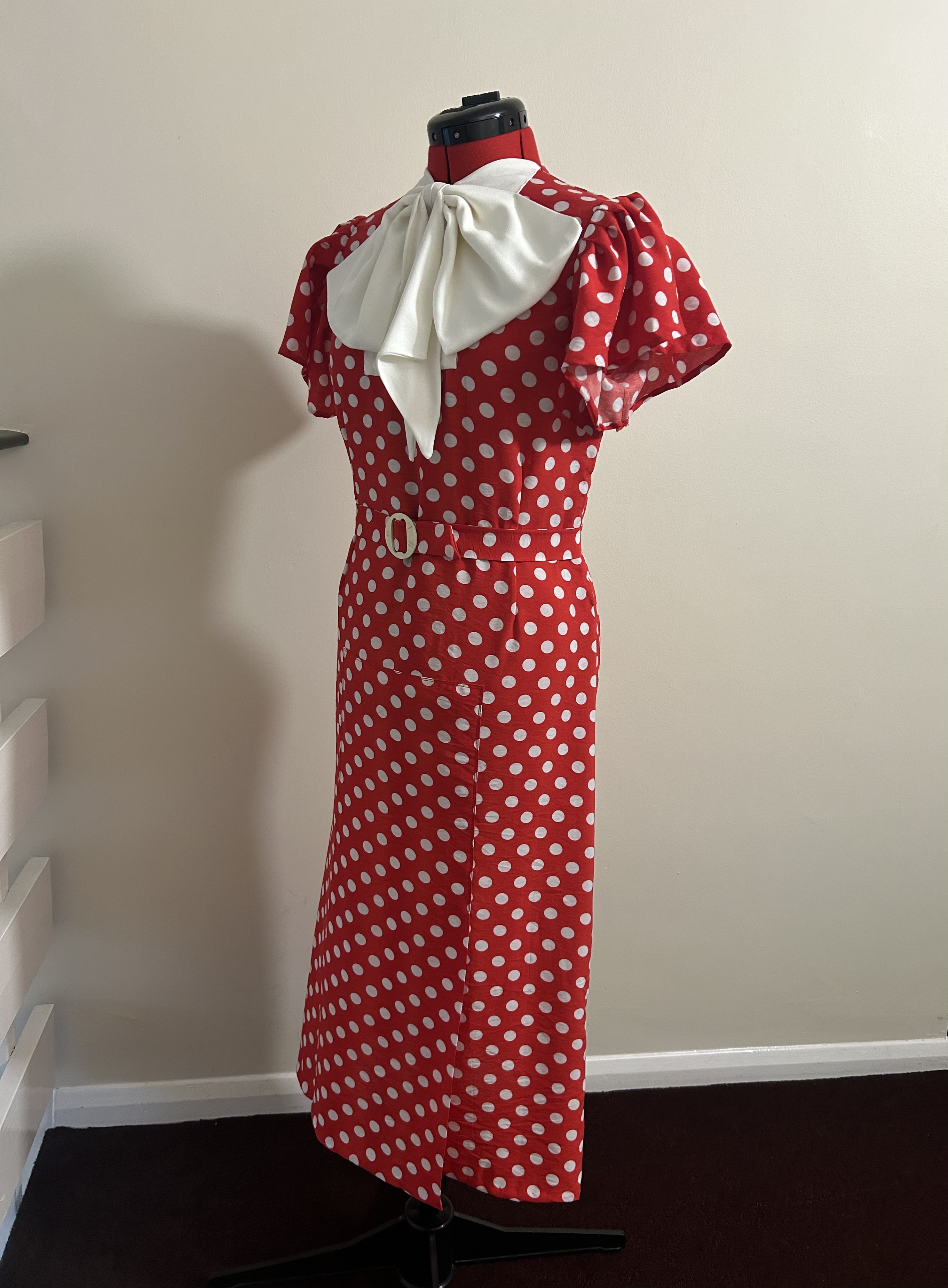 This beautiful summer dress in large polka dot viscose rayon with a statement white rayon crepe bow screams 1930s all over! It features butterfly sleeves and the very art deco style square panelling at the front and back of the skirt which also has kick pleats on both sides. Double darts at the front and back give a bit more shape to the dress. The bow fastens with a snap at the collar. Snap fastening at the side. The belt features a cream vintage bakelite buckle.