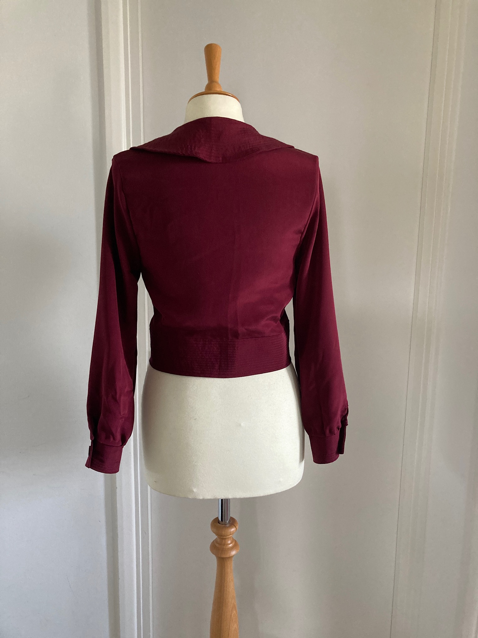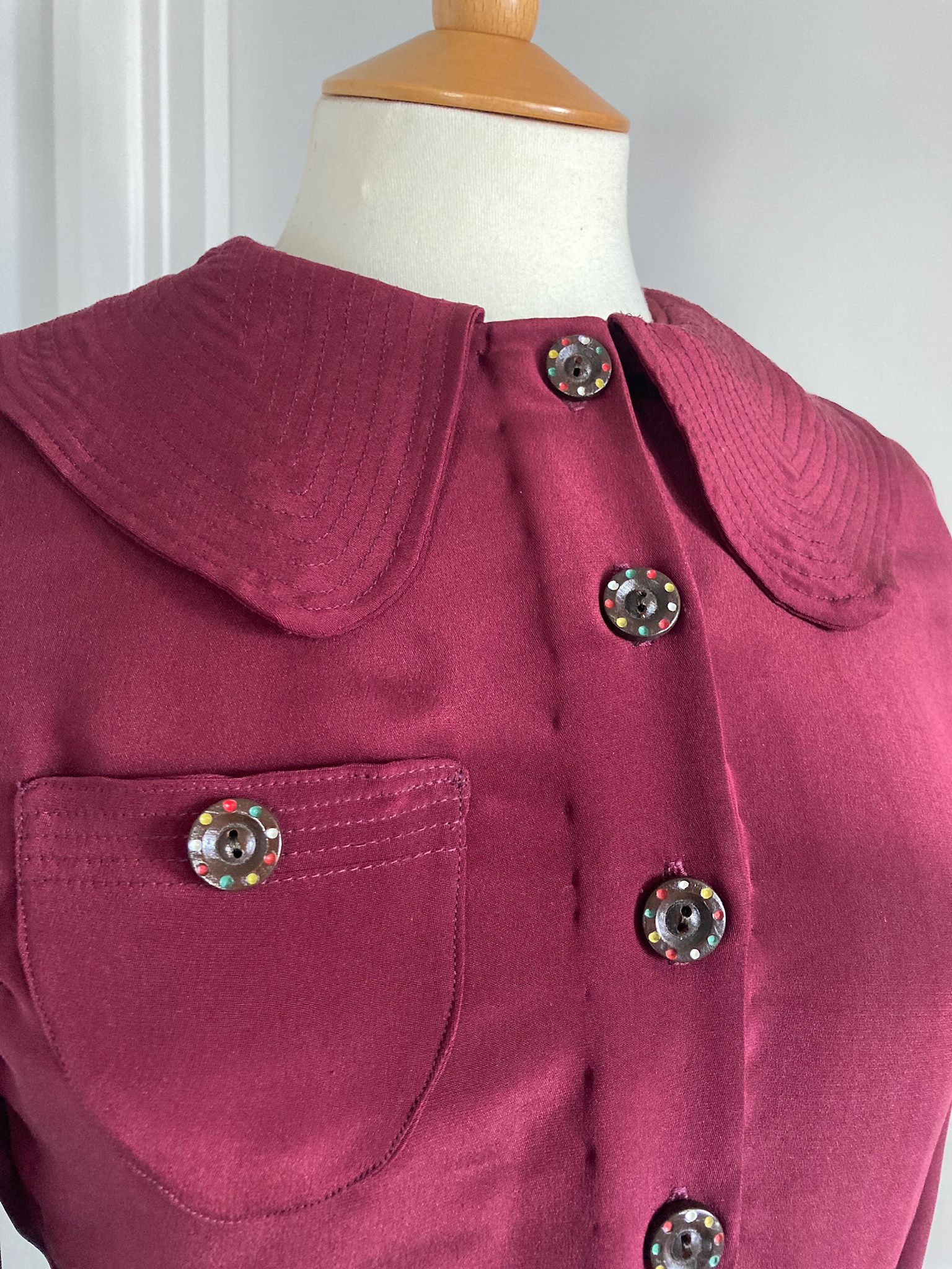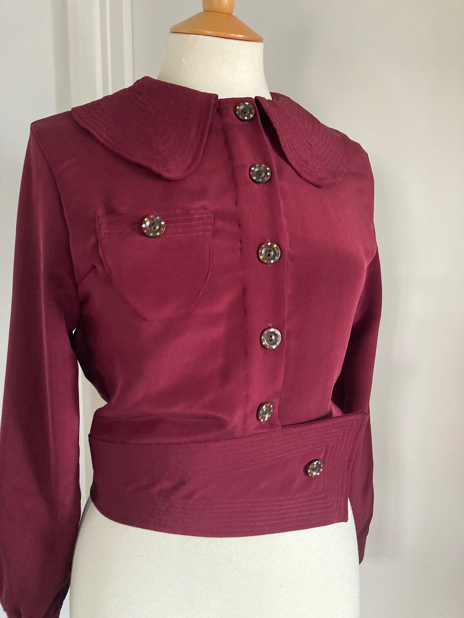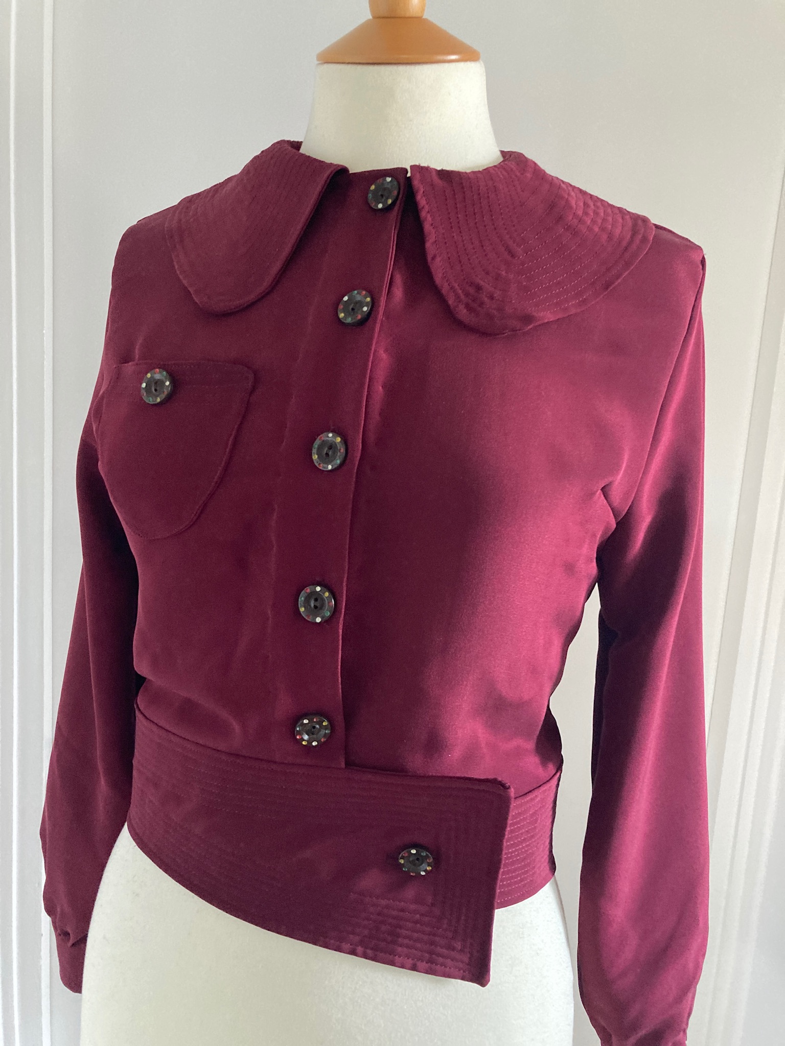 With its unusual eye catching large geometric collar embellished by contrasting 1930s bakelite buttons, puff sleeves and waist band sitting just on the upper hips, also with vintage buttons is the ultimate and perfect separate to complete your 1930s look. It has hook and eye closure at the back of neck.