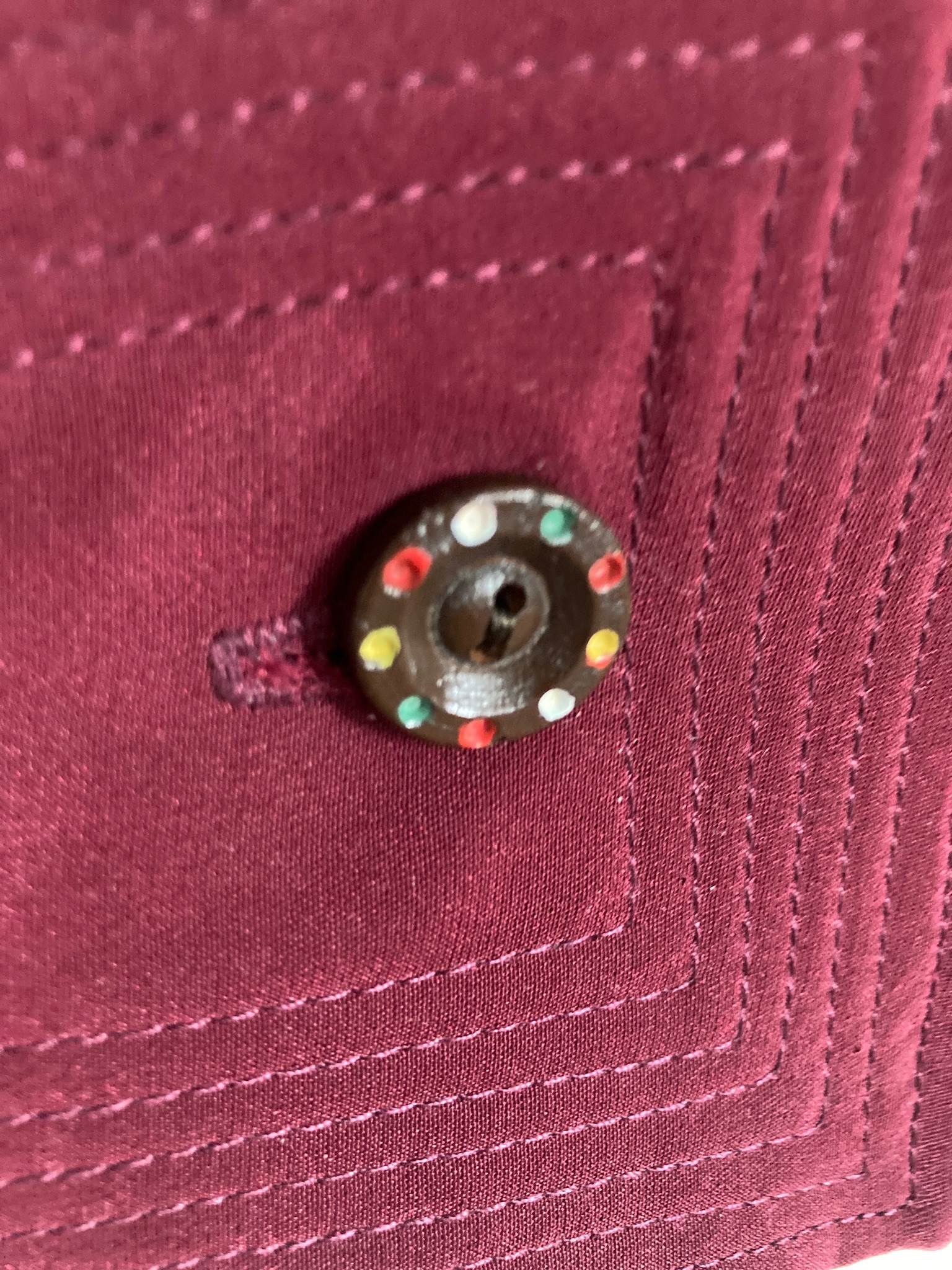 Here I present a lovely mid- 1930s inspired blouse in silk crepe de chine. It has the very popular geometric/ angular stitching of the era in the collar and waist band, with beautiful original wooden vintage buttons.