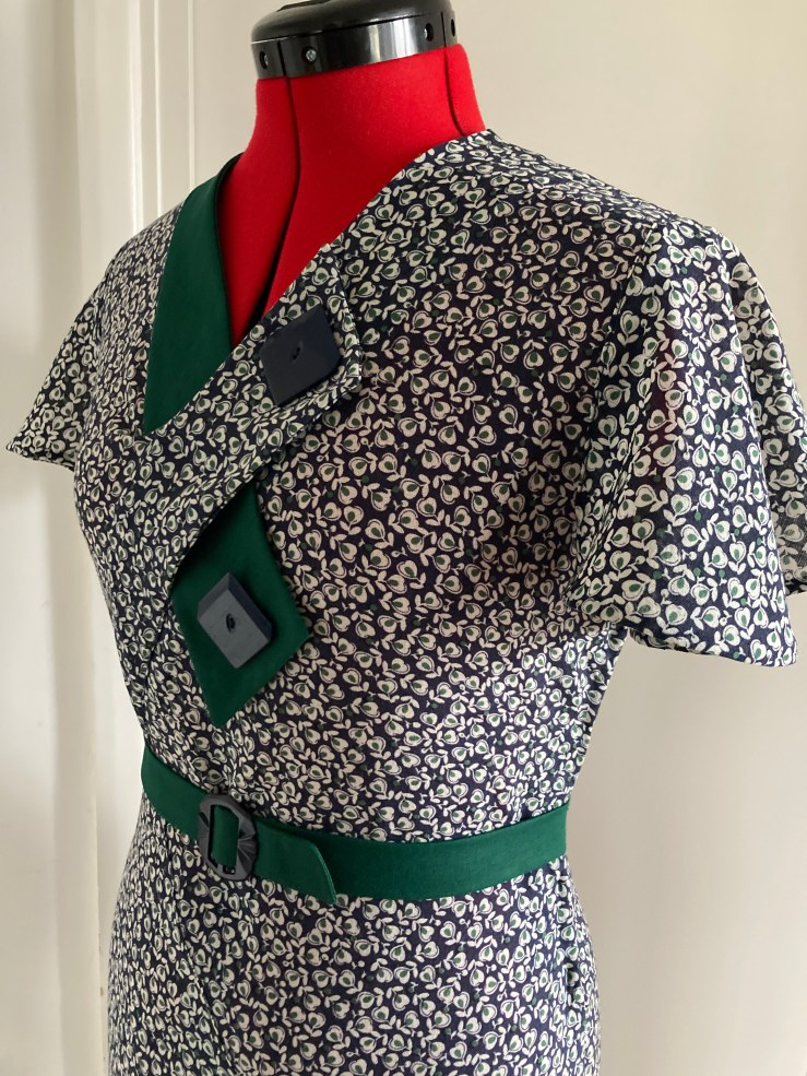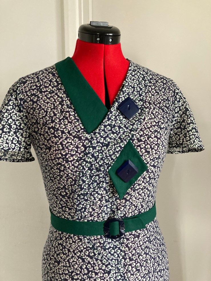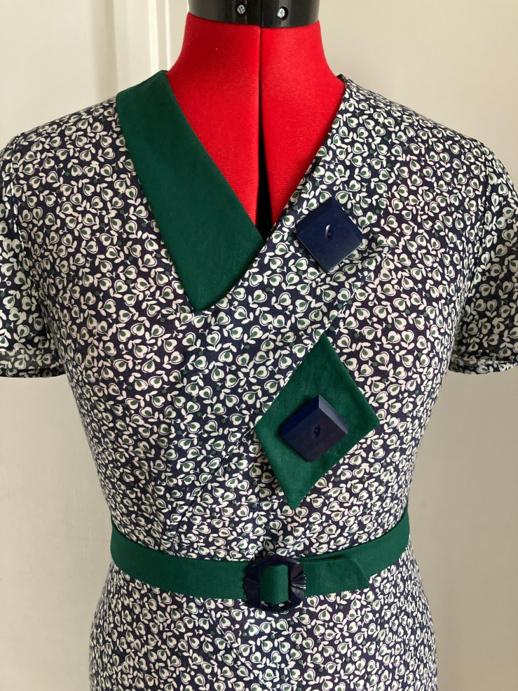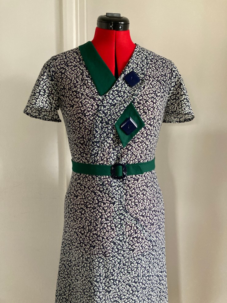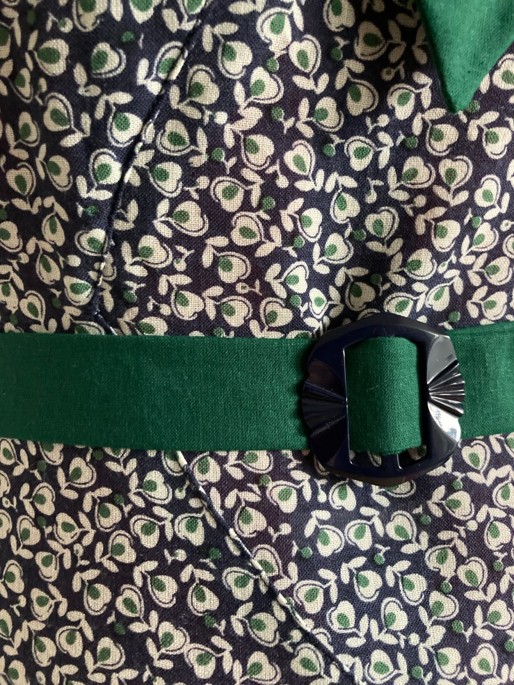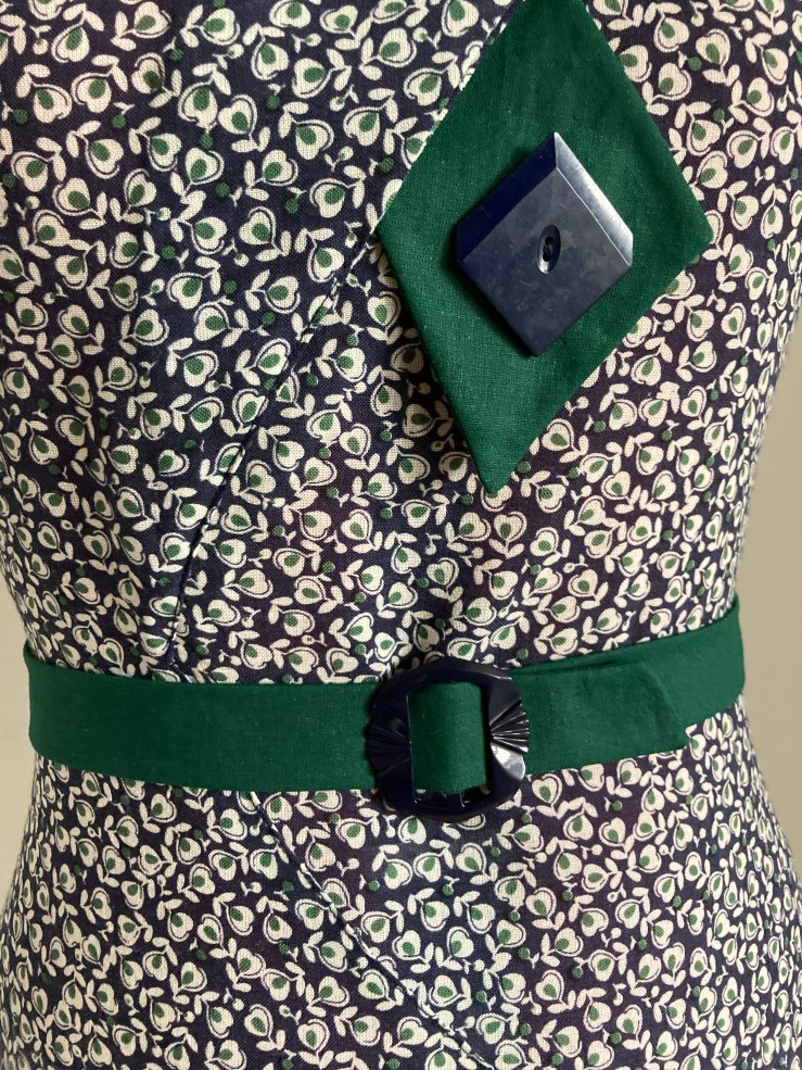 This lovely early 1930s style printed cotton dress must be the culmination of the art deco loveliness of the era. With it’s contrasting bottle green insert intersecting with the main fabric of the dress and the large navy square bakelite buttons create a beautiful effect along with the geometric cut along the bodice and the skirt. It also features bell sleeves and a contrasting belt in bottle green cotton with an original vintage bakelite belt buckle and snap fasteners at the side.