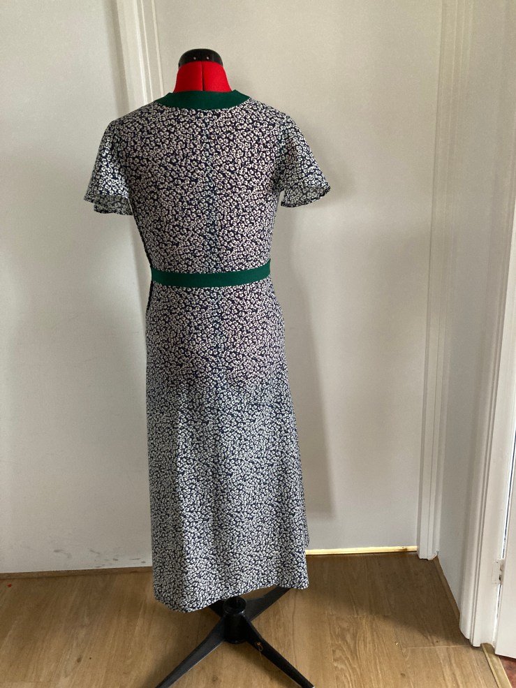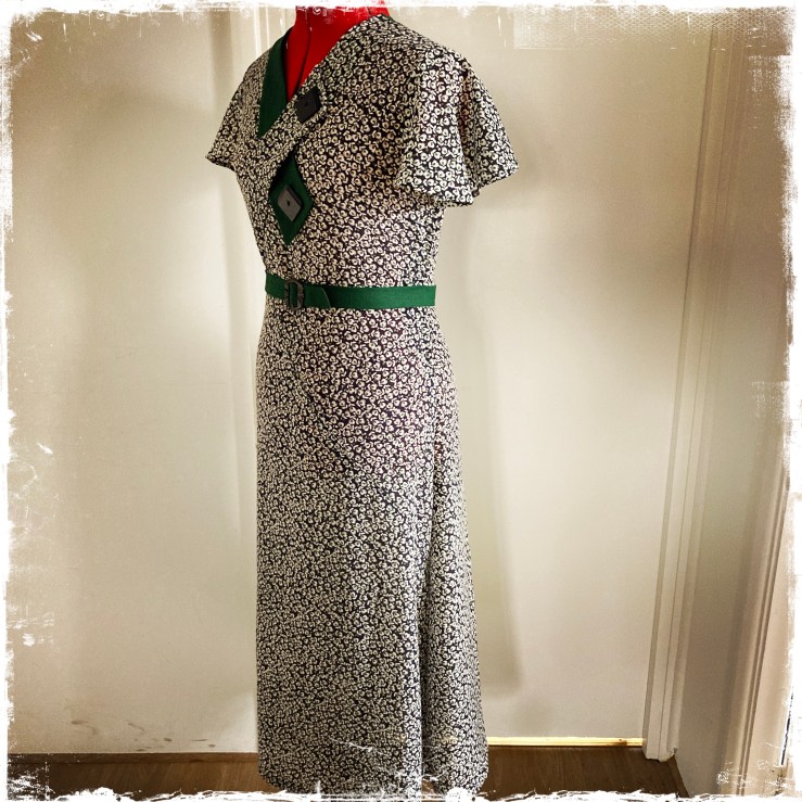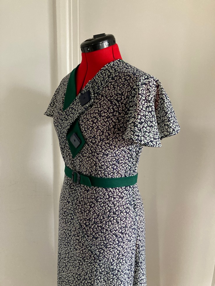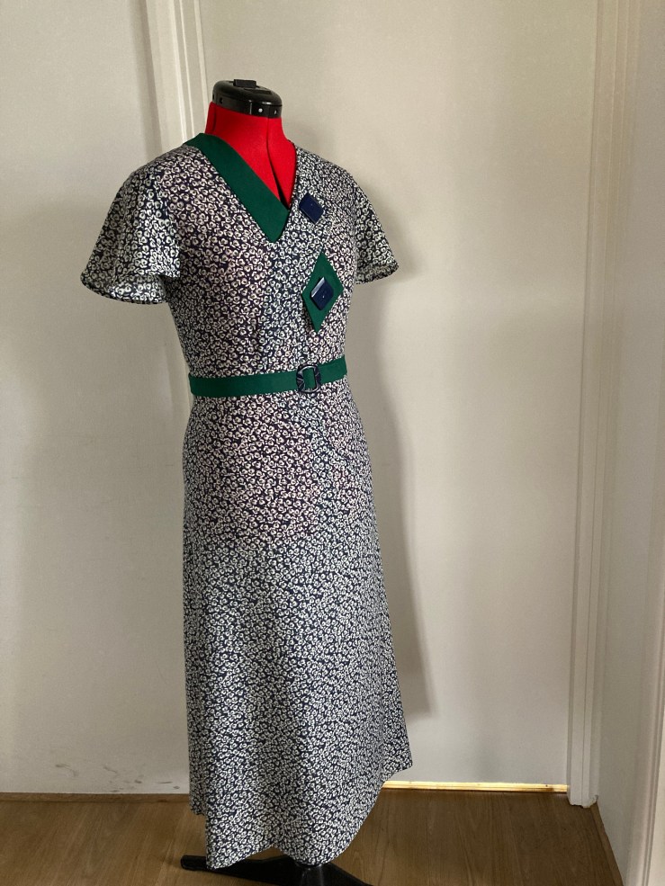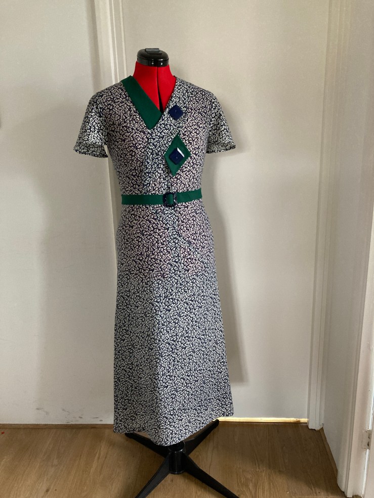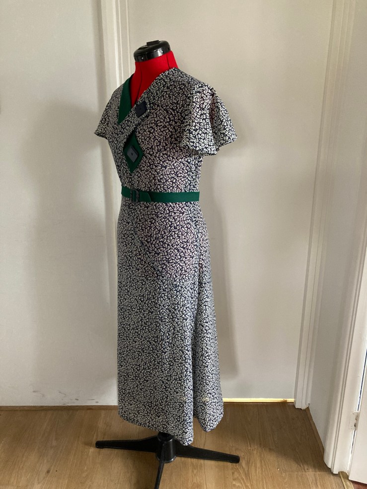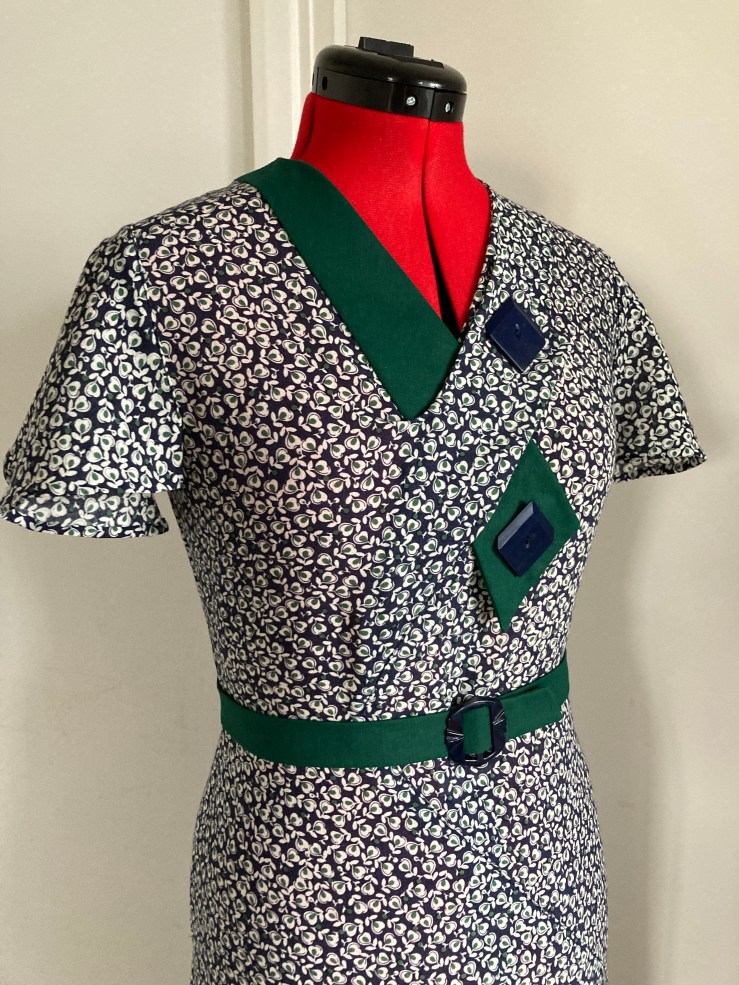 This lovely early 1930s style printed cotton dress must be the culmination of the art deco loveliness of the era. With it’s contrasting bottle green insert intersecting with the main fabric of the dress and the large navy square bakelite buttons create a beautiful effect along with the geometric cut along the bodice and the skirt. It also features bell sleeves and a contrasting belt in bottle green cotton with an original vintage bakelite belt buckle and snap fasteners at the side.