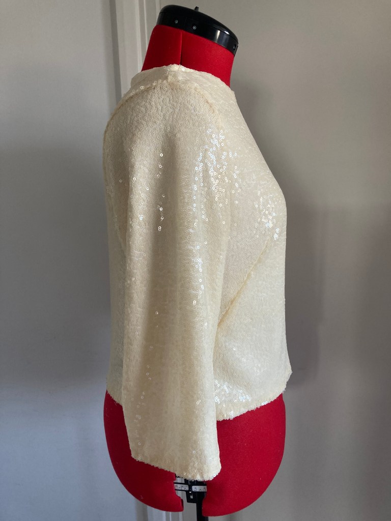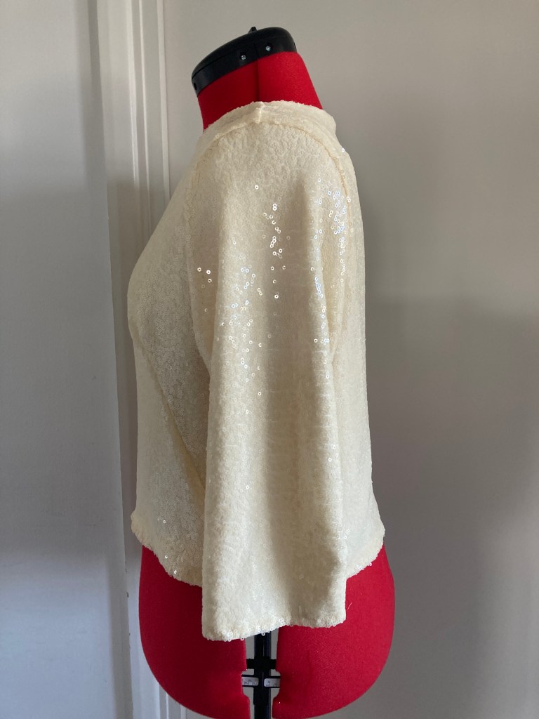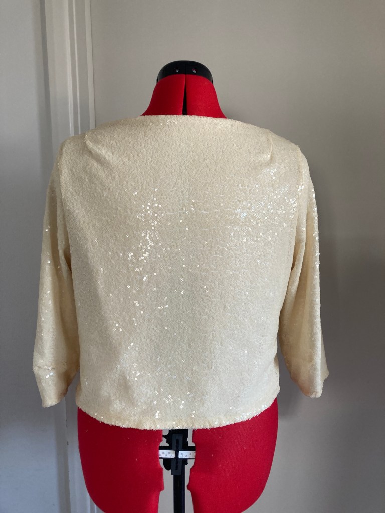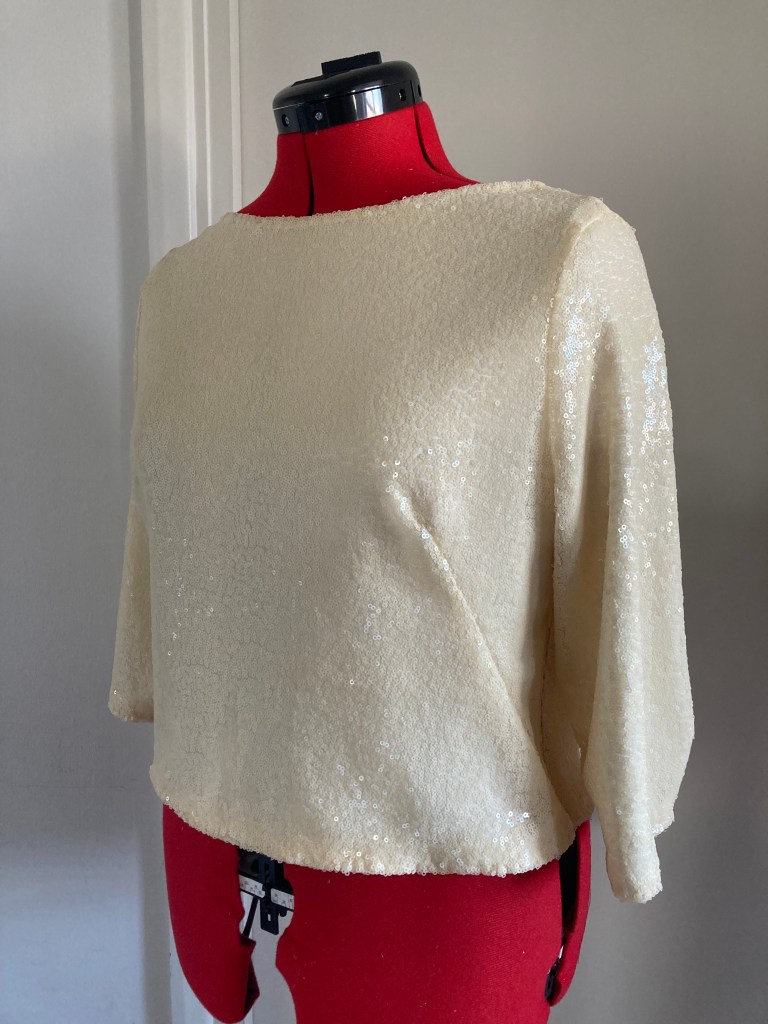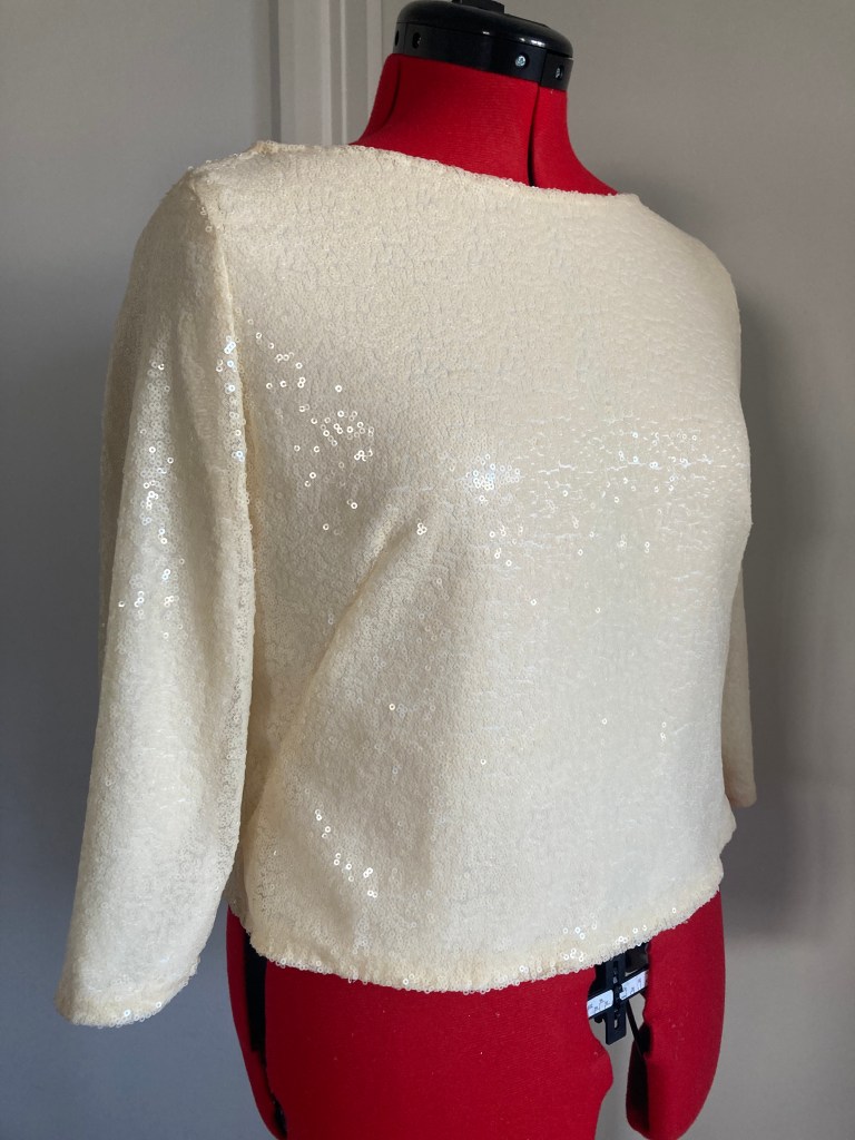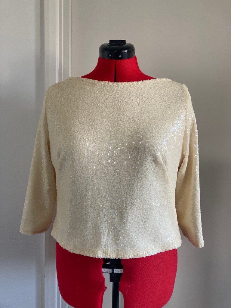 Here I present a mid- 1960s inspired sequin blouse in cream with silk lining. It has the fashionable 3/4 length sleeves, boat neck and slightly boxy cropped shape. Fastens with zipper at side seam.