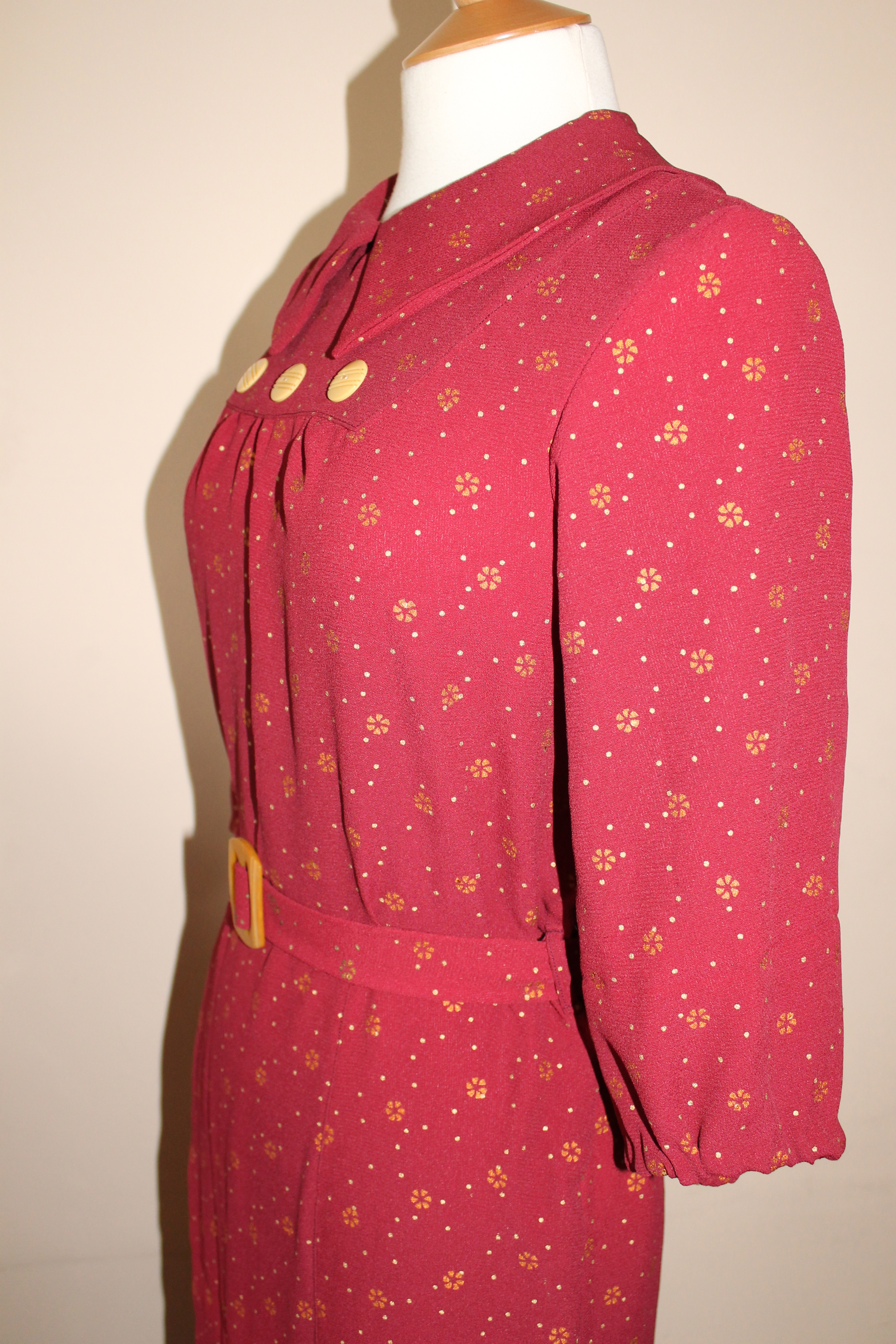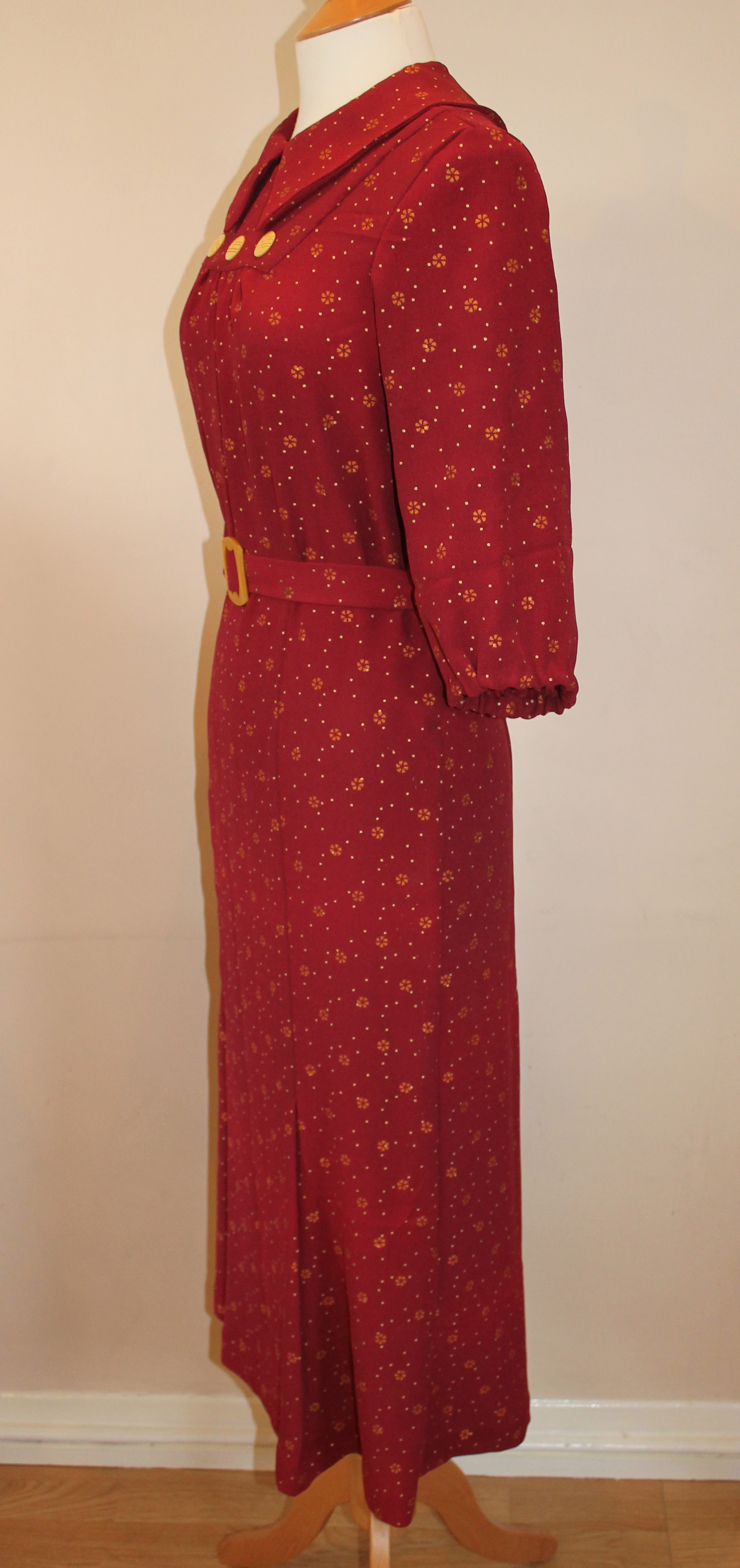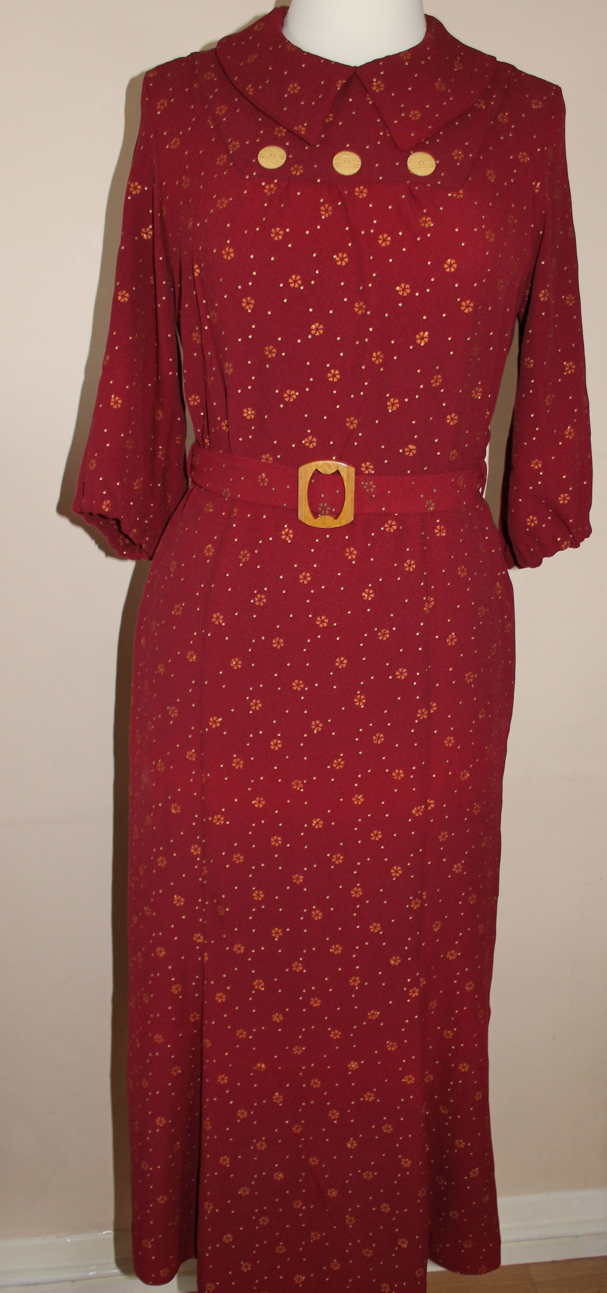 Here’s a golden oldie from my 1930s bow dress collection from a few years back, the “Vivian”, an early 1930s style dress in burgundy silk crepe de chine with its dramatic large bow in original vintage rayon bringing interesting contrast to it, typical to the era. It also features the unusual detail in the shoulders of the half moon shaped “wings”, that were also a popular style detail in the 1930s. The long sleeves have small cuffs in the same fabric as the bow. The belt features an early vintage plastic buckle. Closure at the side with snap fasteners.