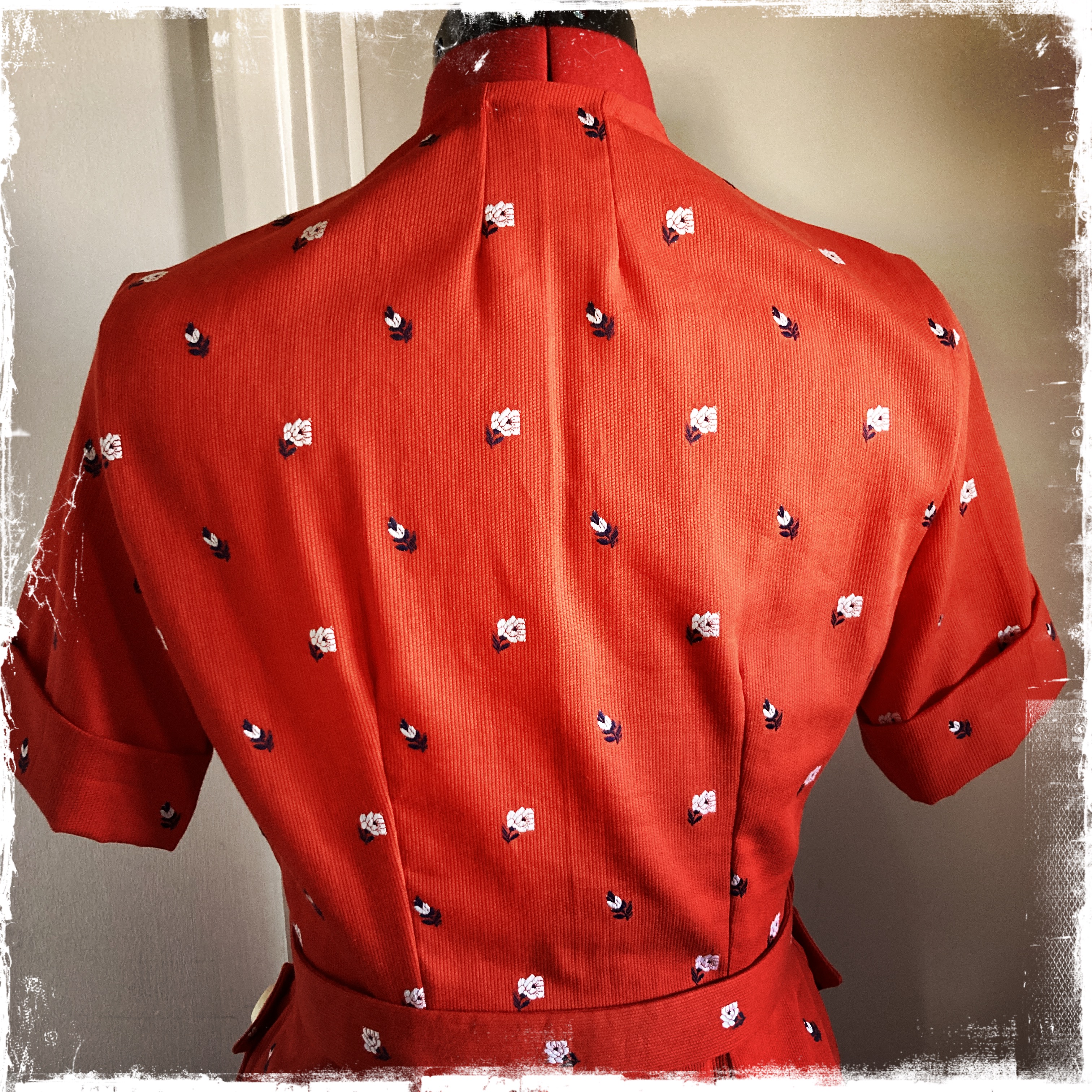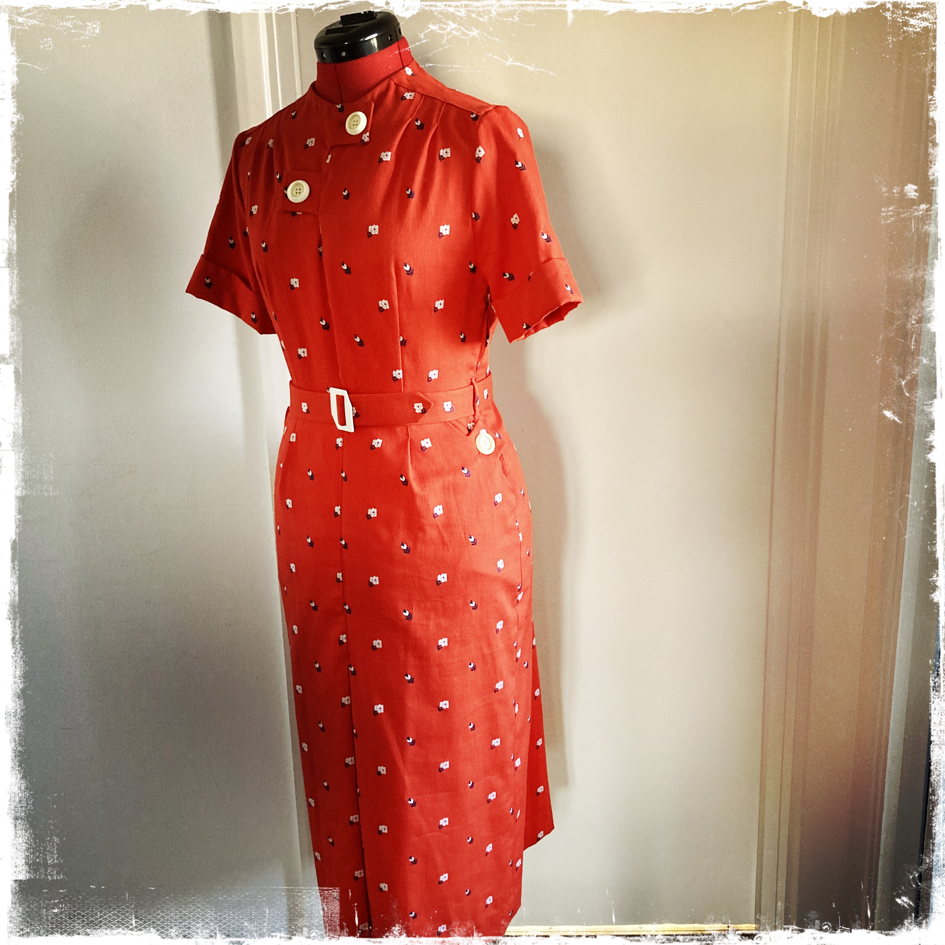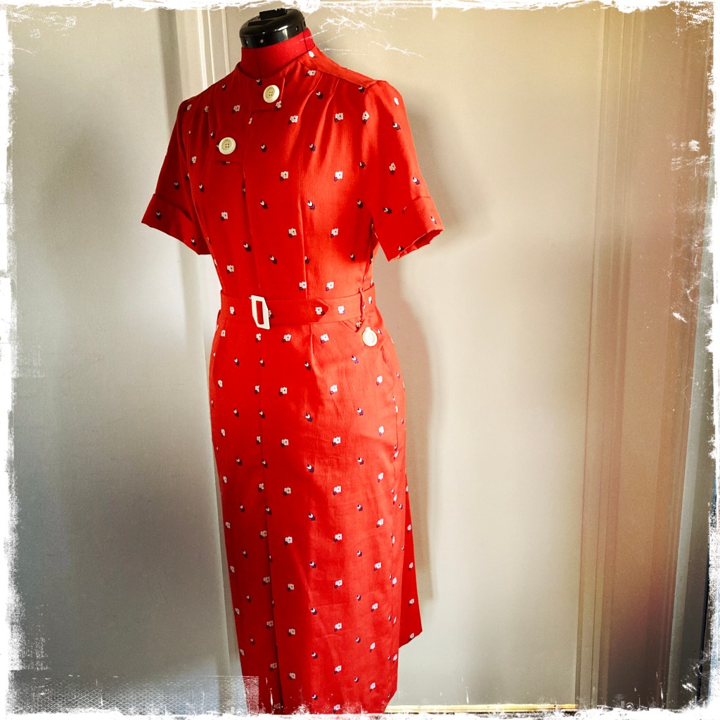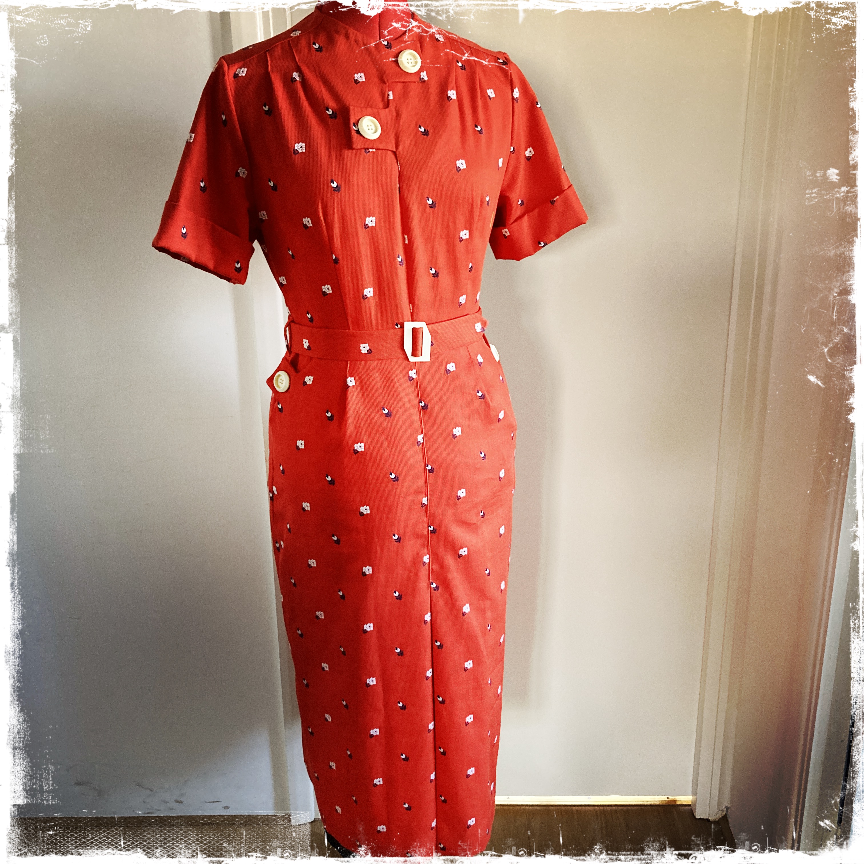 This beautiful early 1950s inspired dress in original 1950s embroidered cotton is a great example of the more streamlined silhouette of the era. It features an interesting zigzag style panelling with a gathered yoke on the bodice and kick pleat down centre of the skirt. Short upturned sleeves, pockets with button closure. With vintage buttons and buckle. Fastens with a zip at side seam.