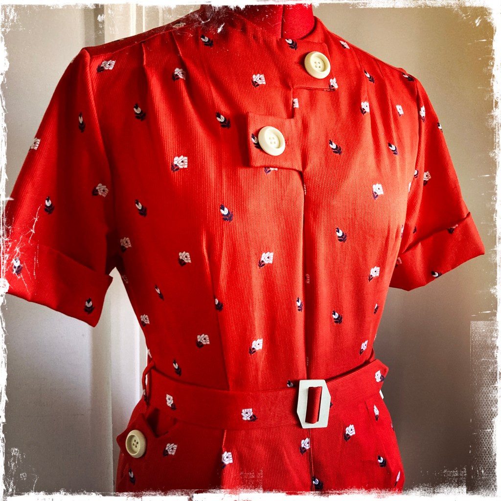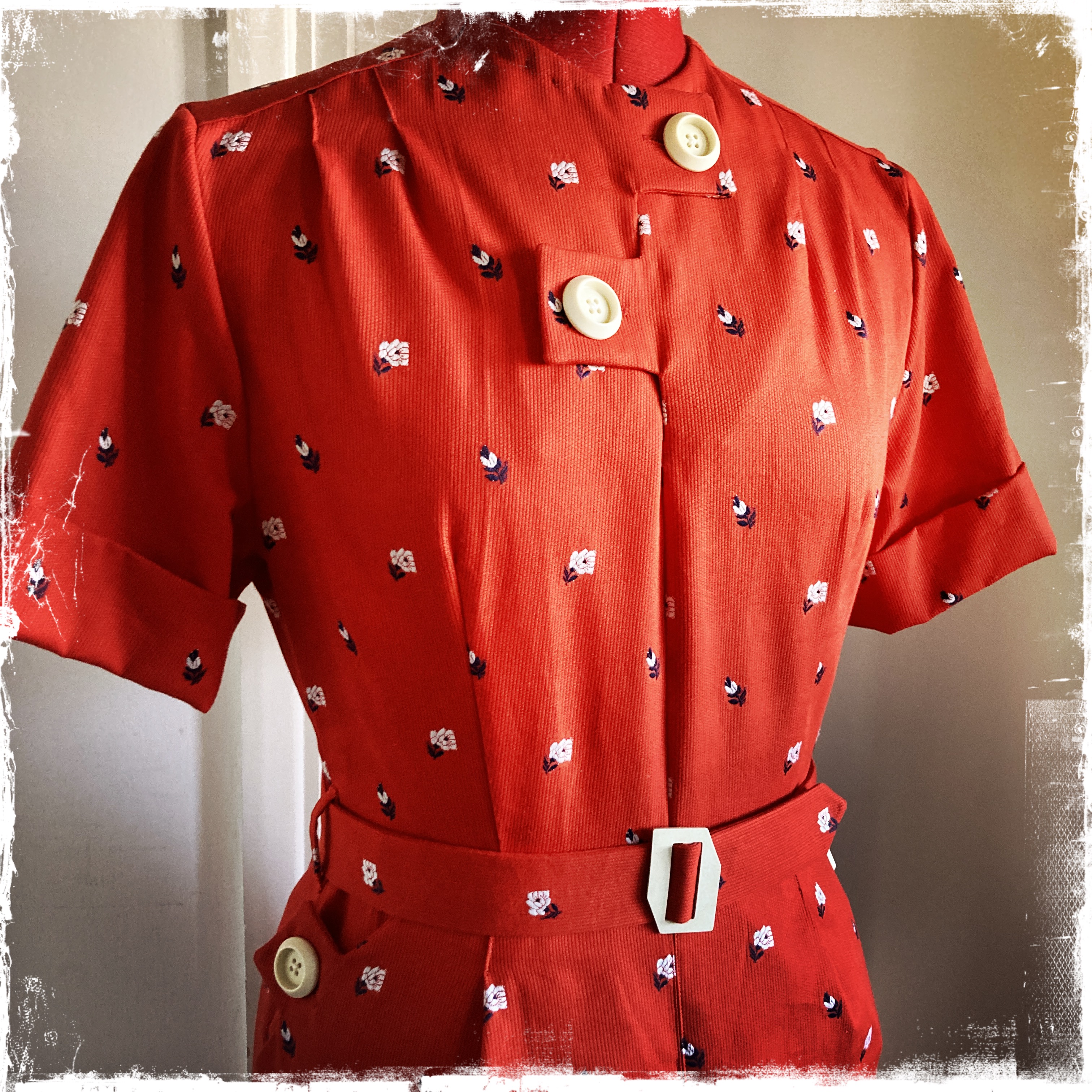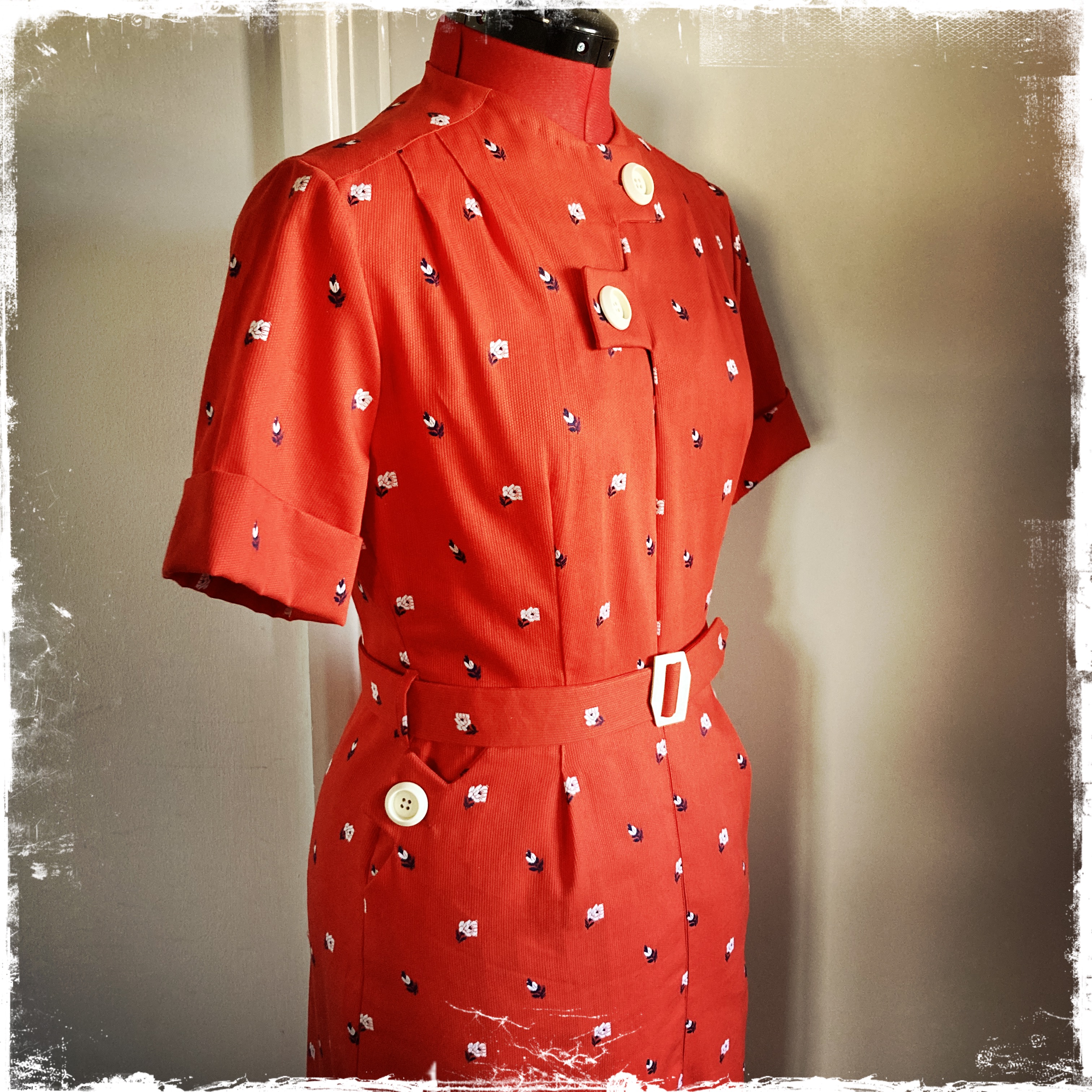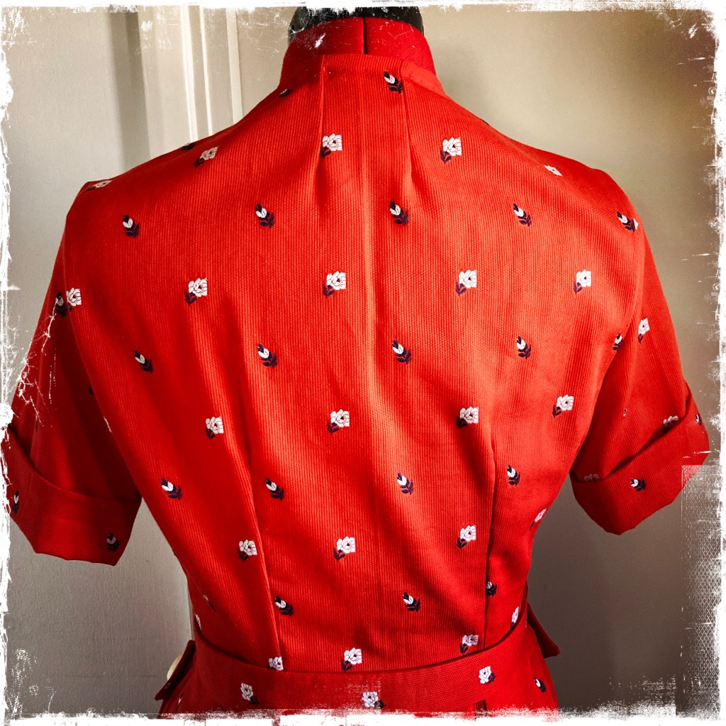 This beautiful early 1950s inspired dress in original 1950s embroidered cotton is a great example of the more streamlined silhouette of the era. It features an interesting zigzag style panelling with a gathered yoke on the bodice and kick pleat down centre of the skirt. Short upturned sleeves, pockets with button closure. With vintage buttons and buckle. Fastens with a zip at side seam.