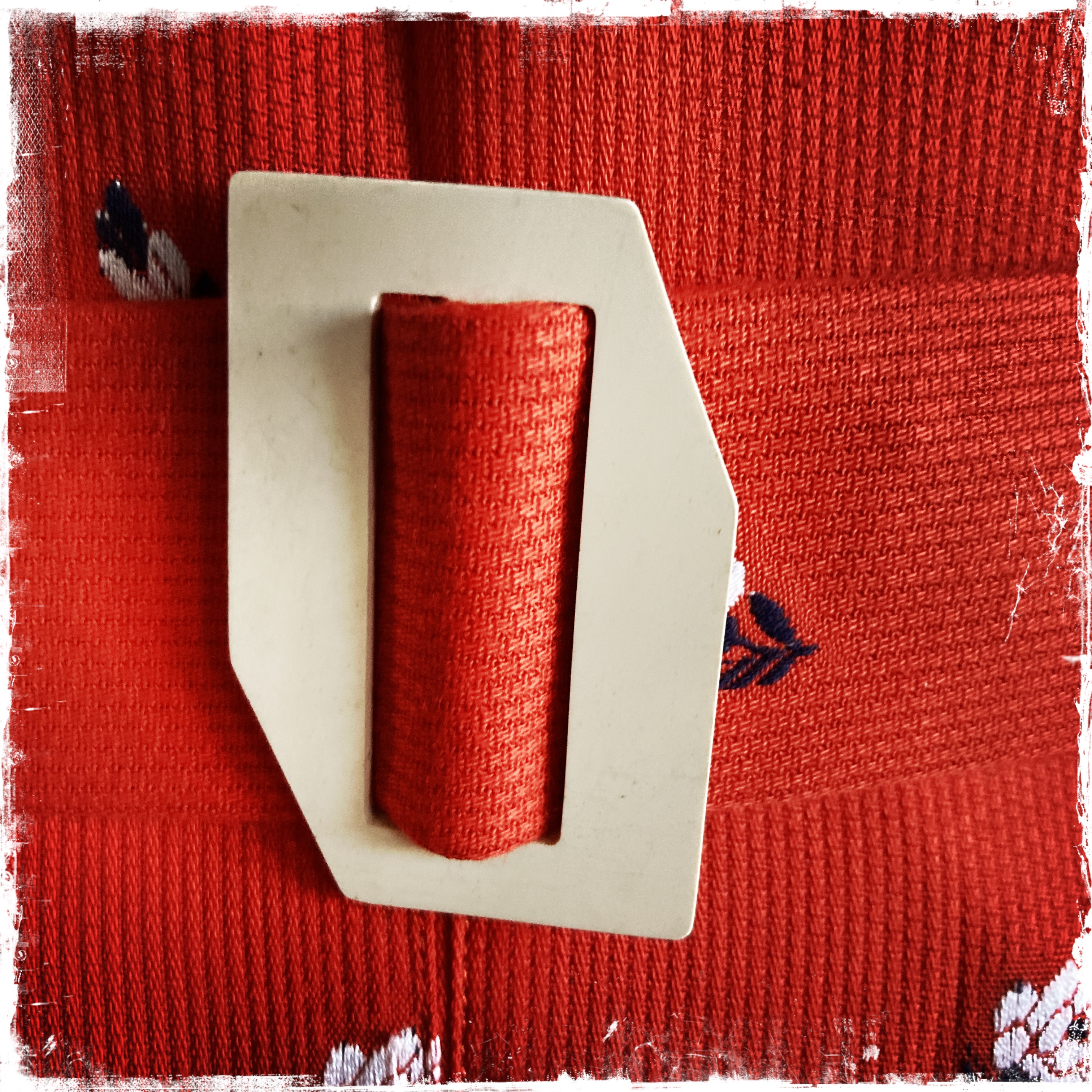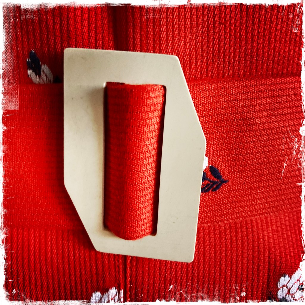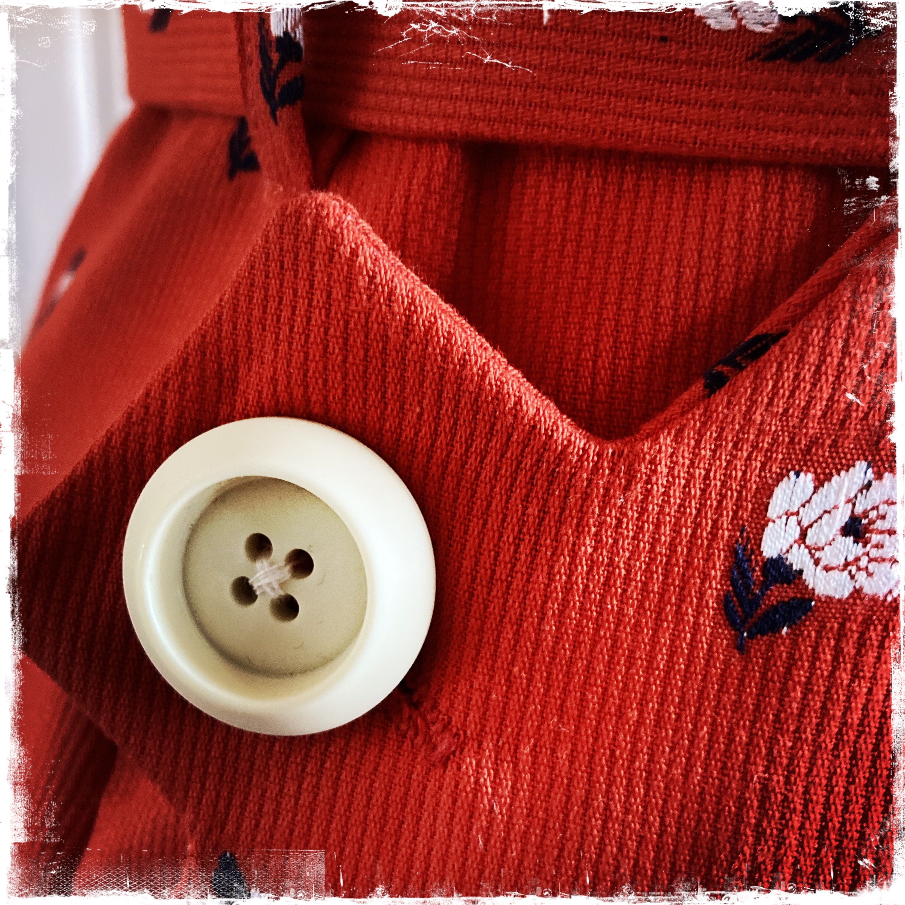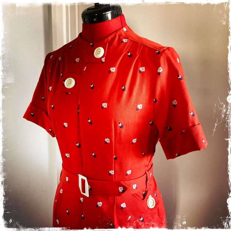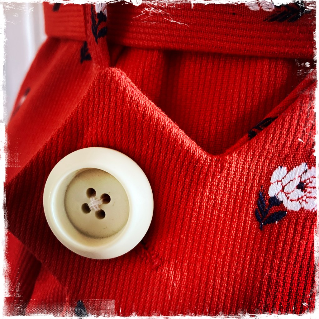 This beautiful early 1950s inspired dress in original 1950s embroidered cotton is a great example of the more streamlined silhouette of the era. It features an interesting zigzag style panelling with a gathered yoke on the bodice and kick pleat down centre of the skirt. Short upturned sleeves, pockets with button closure. With vintage buttons and buckle. Fastens with a zip at side seam.