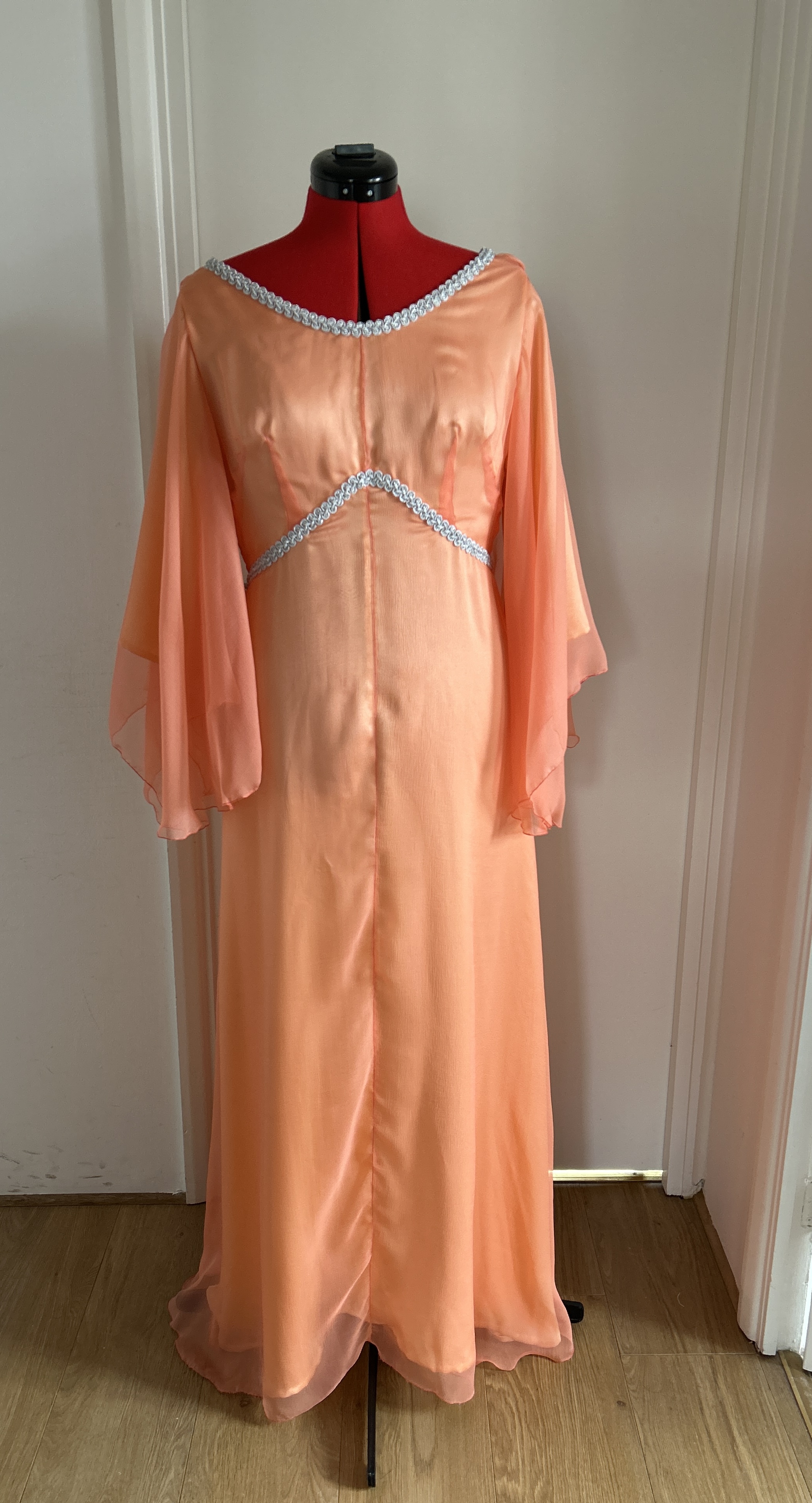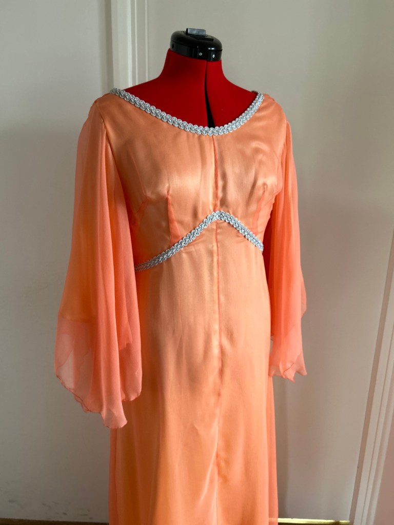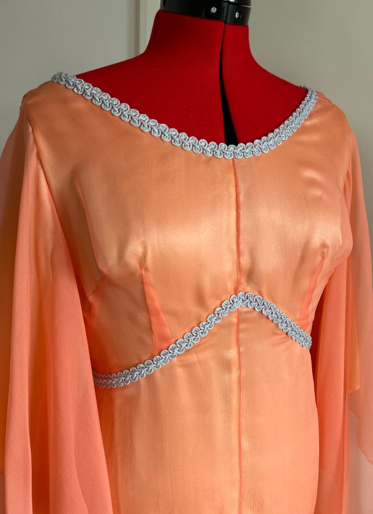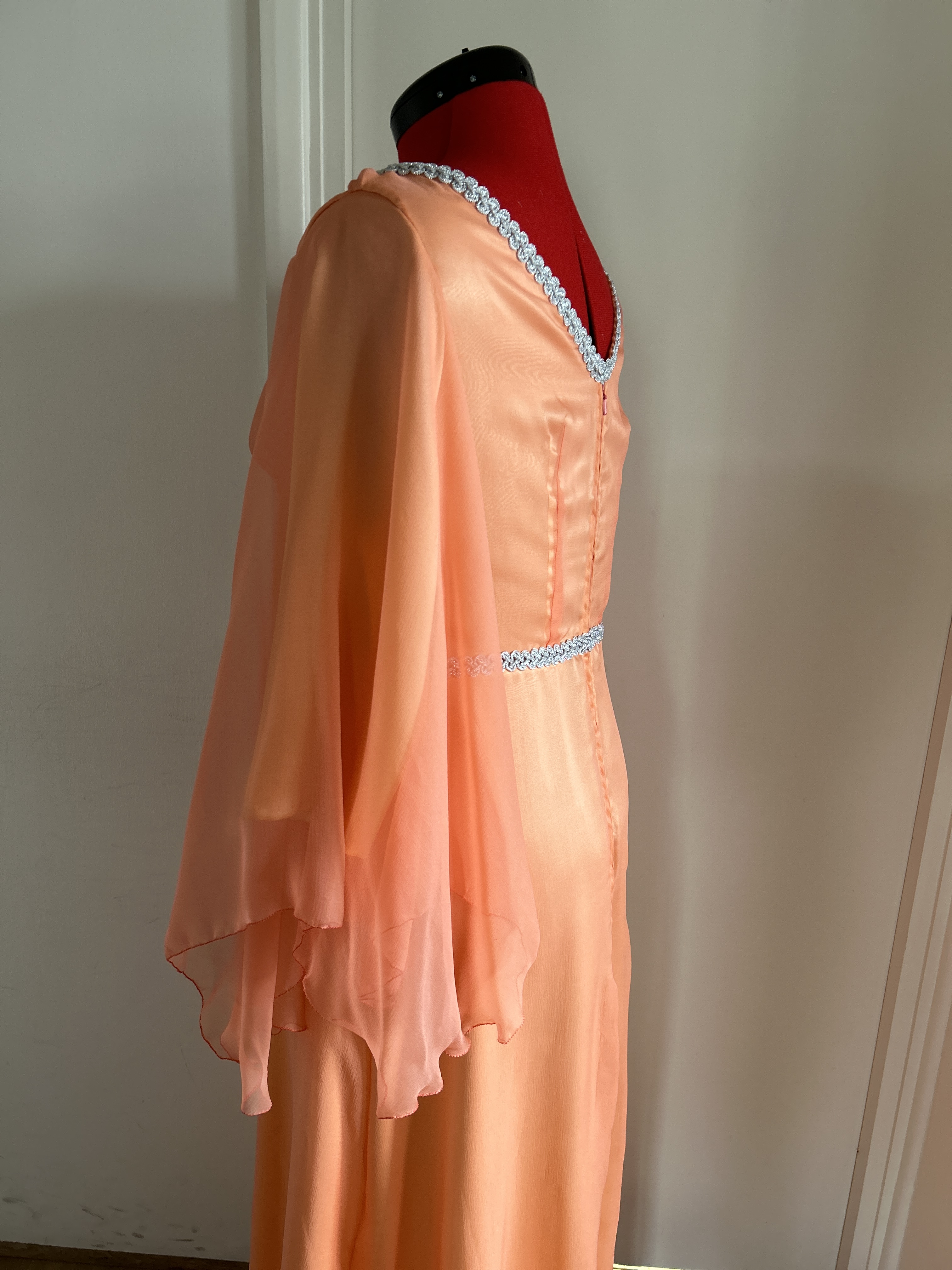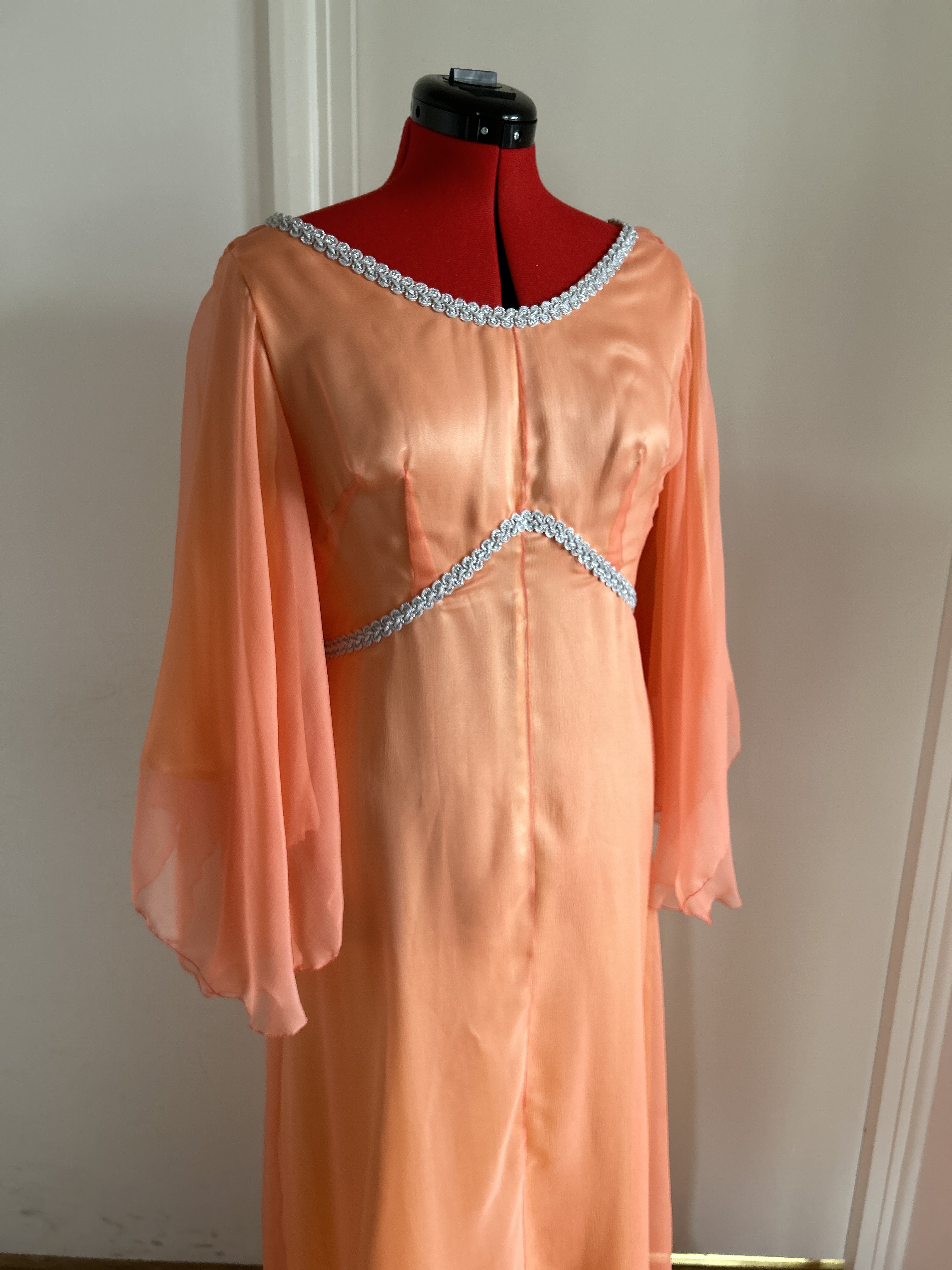 There is a slight Ancient Grecian feel to it, favoured by the designers in the 1930s, combined with the art deco style of the period, here the bias cut gown with the asymmetric diagonally cut neckline and the diagonally cut panels in bodice and skirt forming a peak at the left side of the waistline, a feature very typical of the era. With two deep long darts along the sides of the bodice and low cut back.