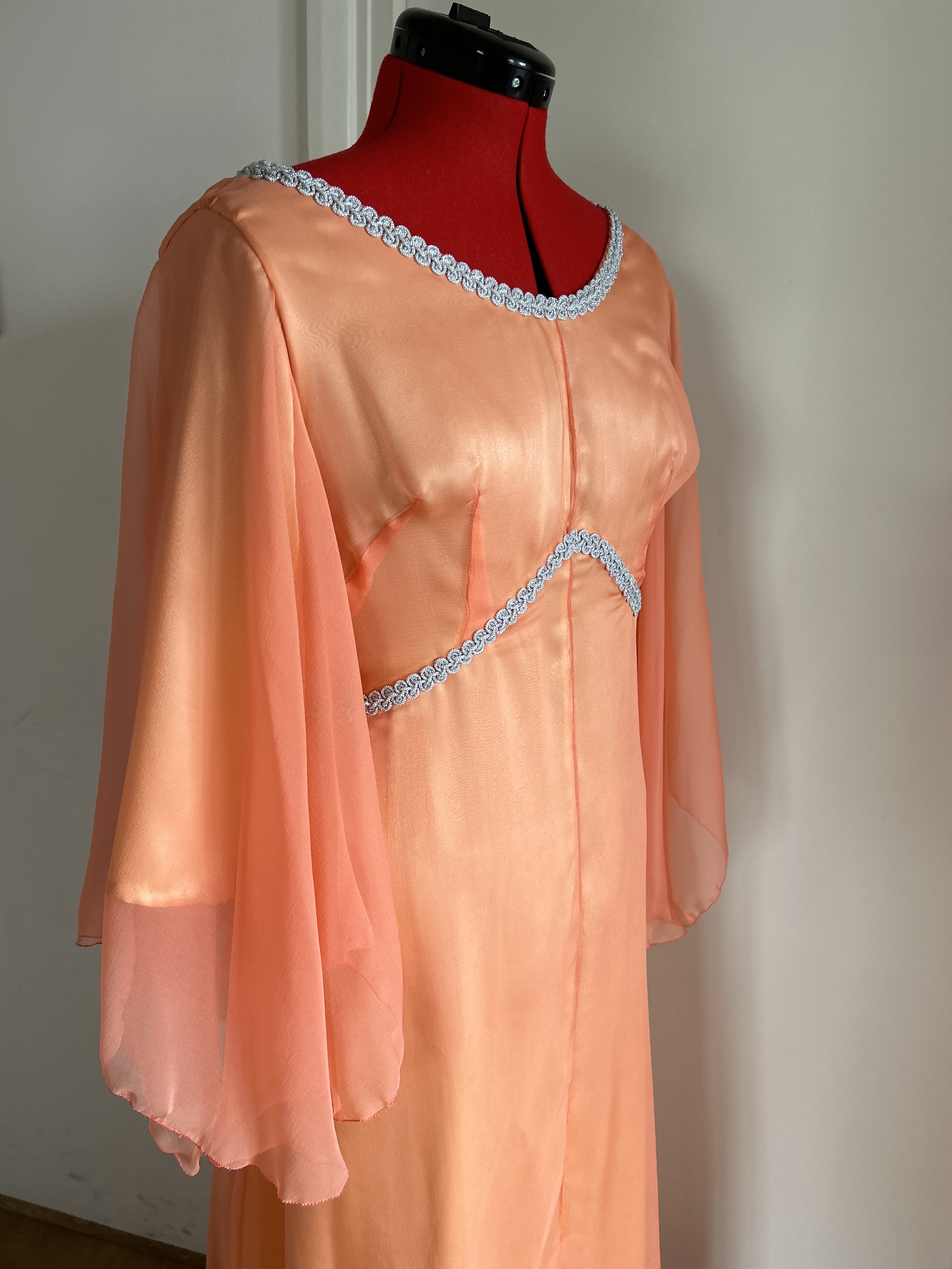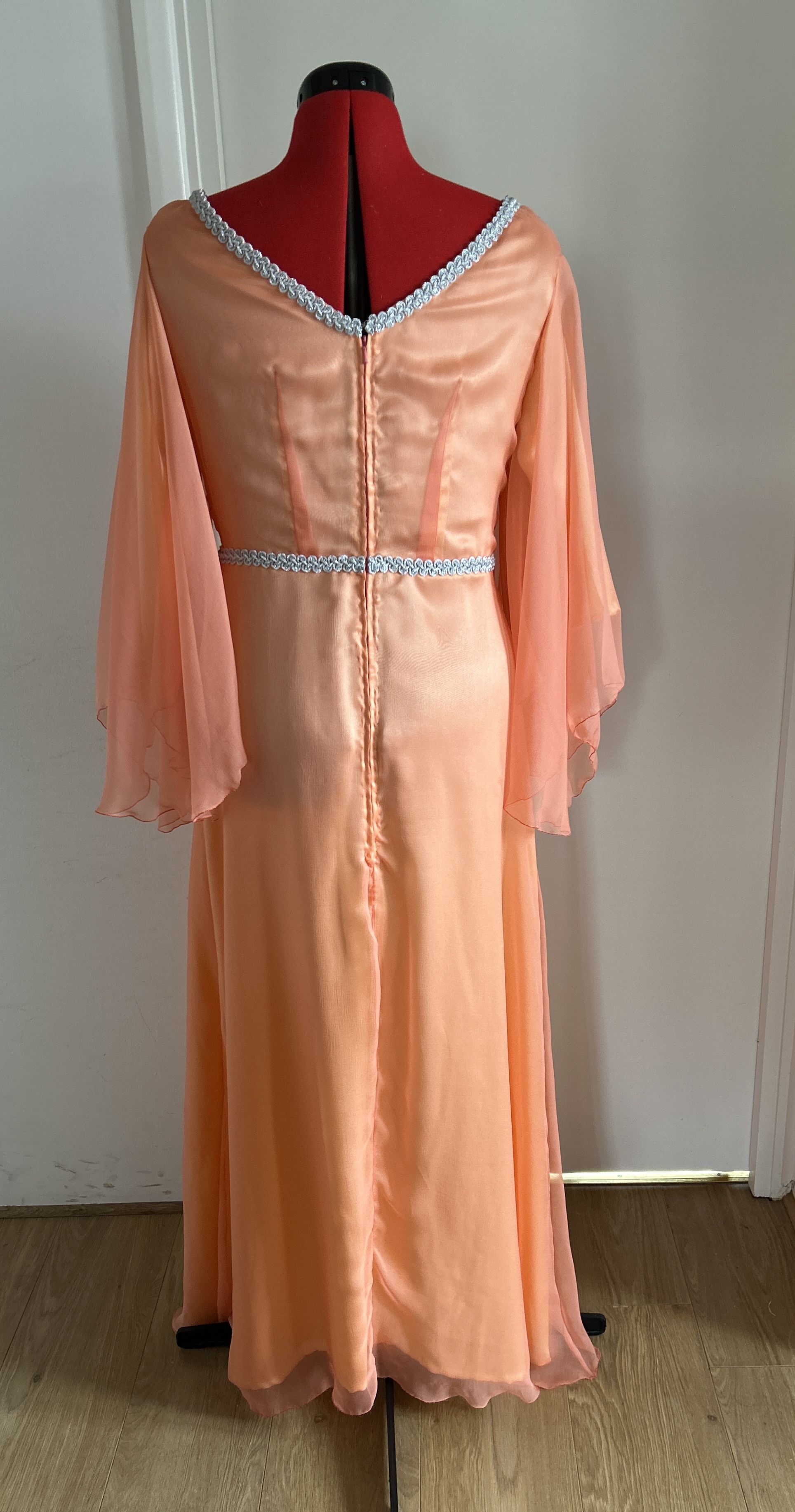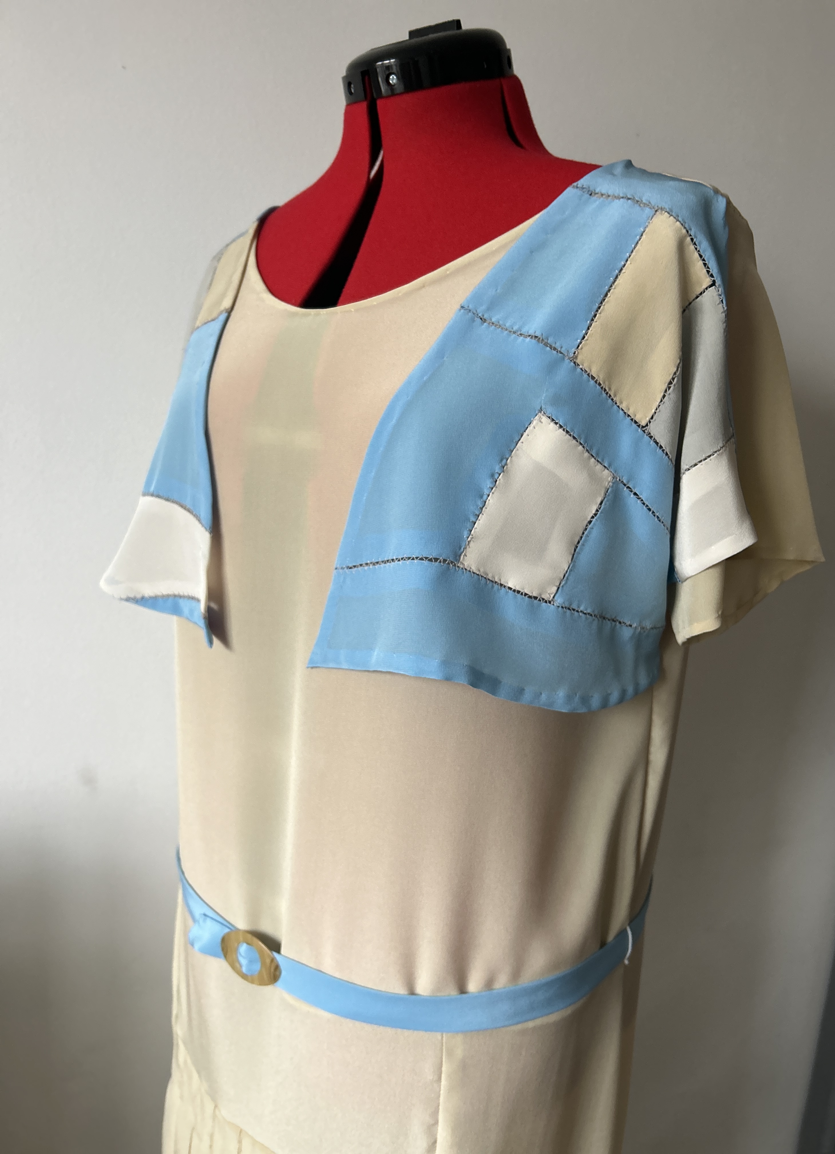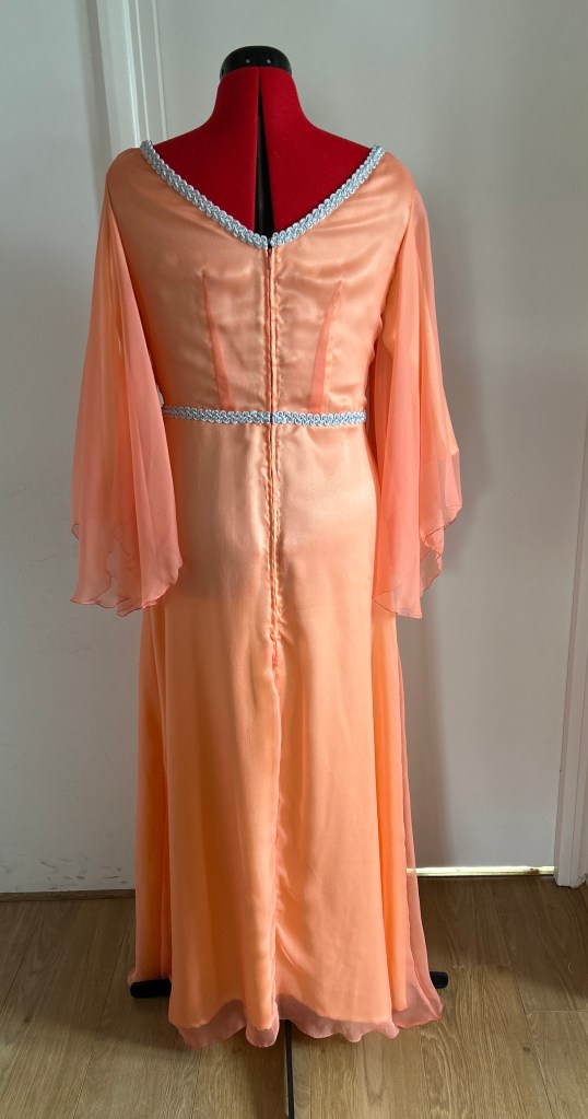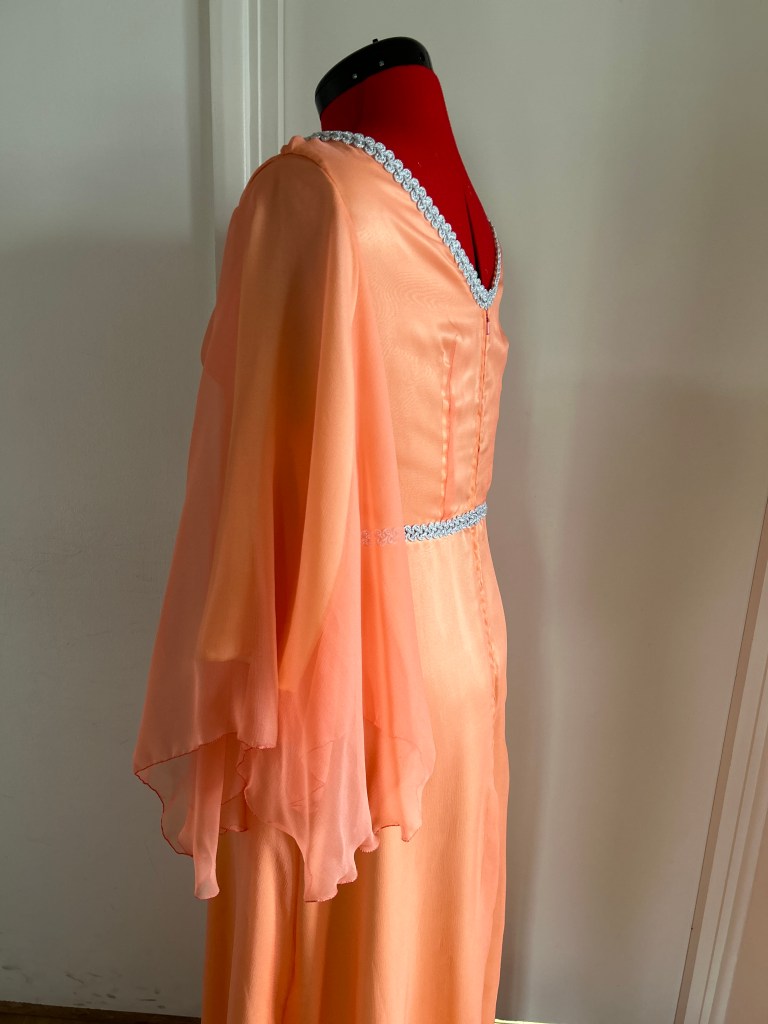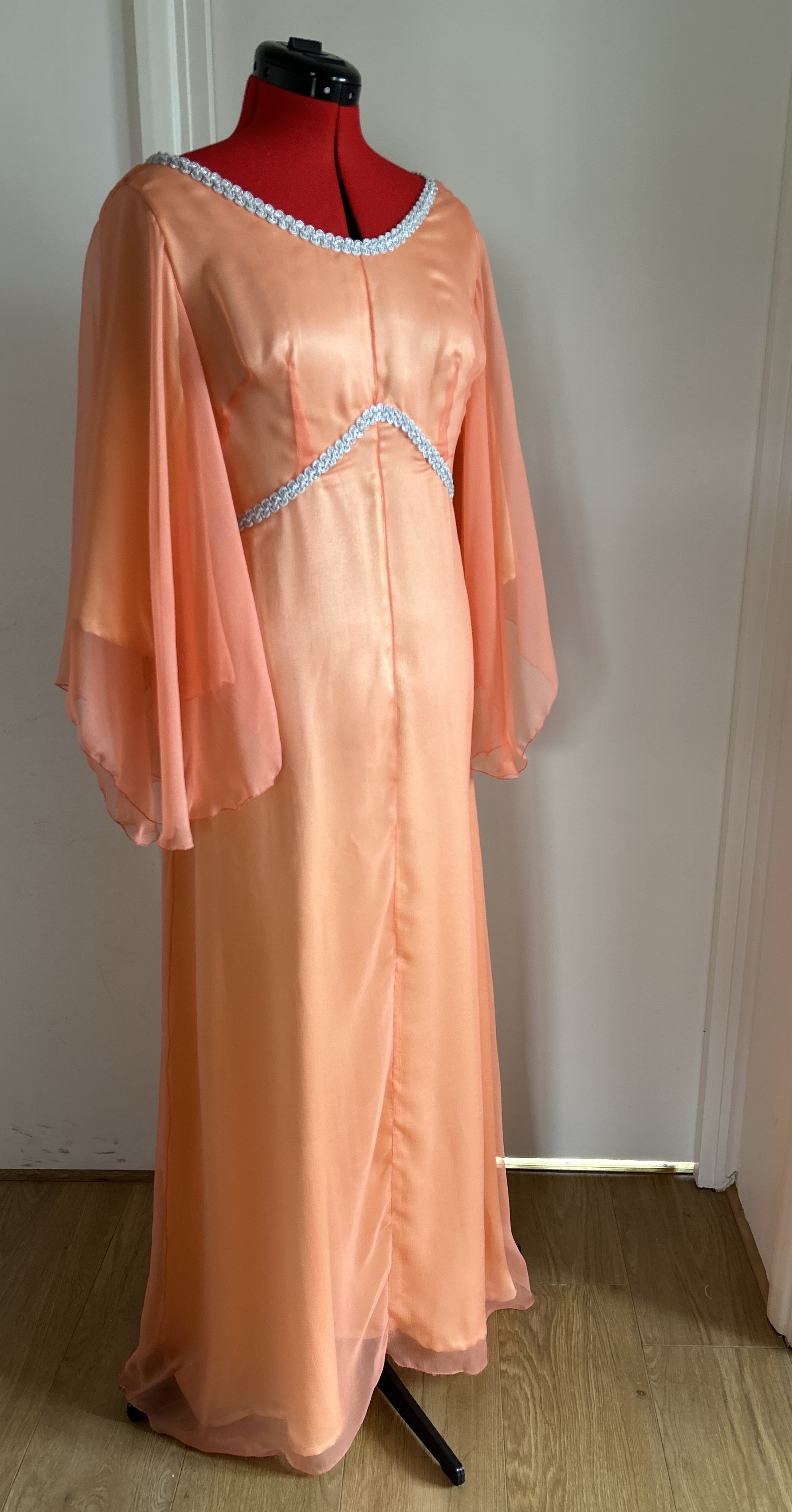 There is a slight Ancient Grecian feel to it, favoured by the designers in the 1930s, combined with the art deco style of the period, here the bias cut gown with the asymmetric diagonally cut neckline and the diagonally cut panels in bodice and skirt forming a peak at the left side of the waistline, a feature very typical of the era. With two deep long darts along the sides of the bodice and low cut back.