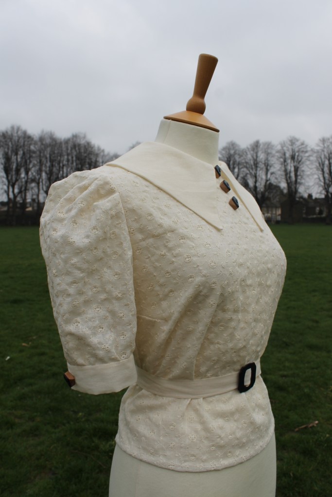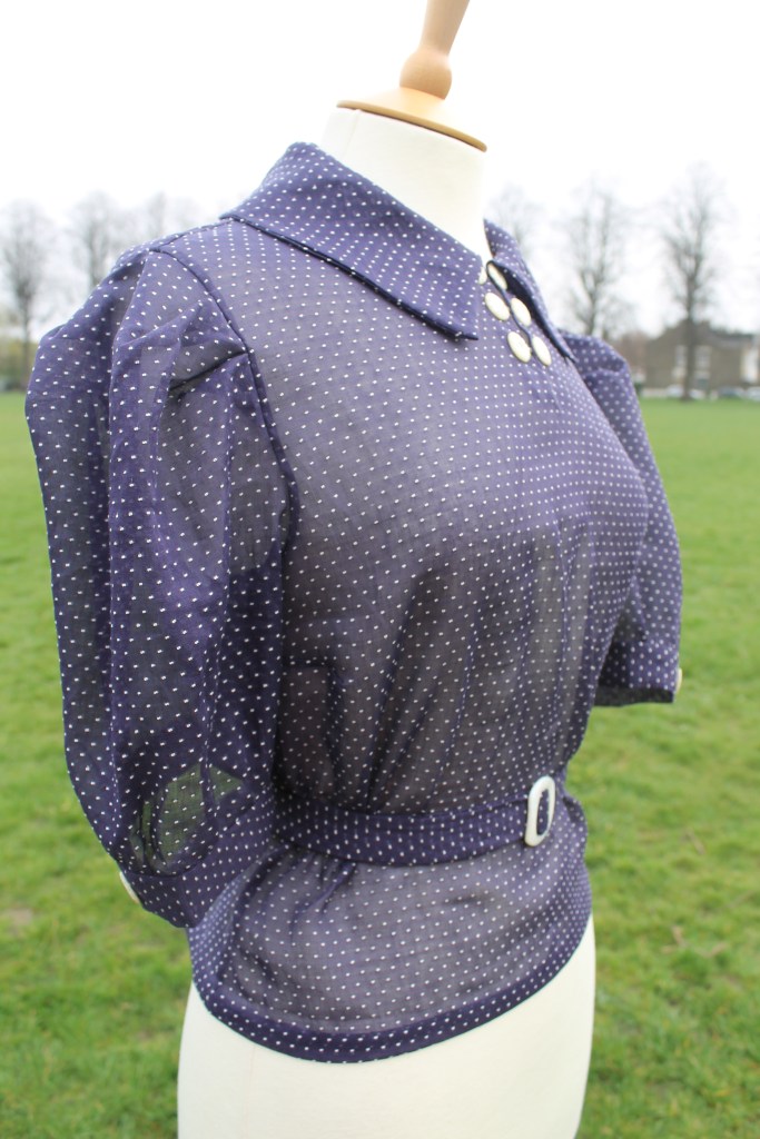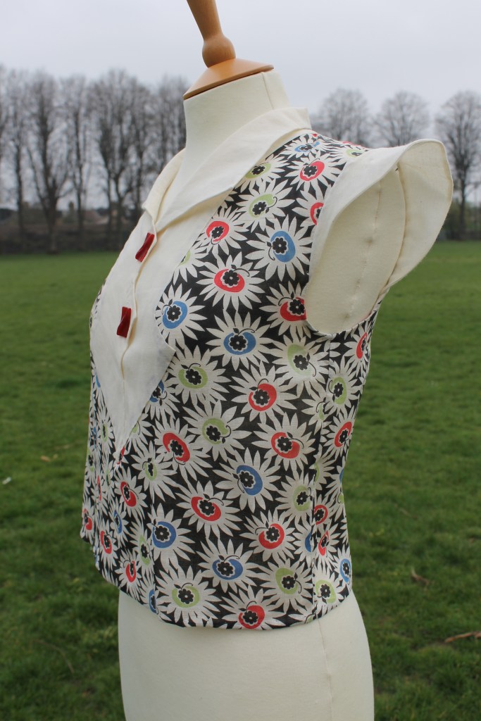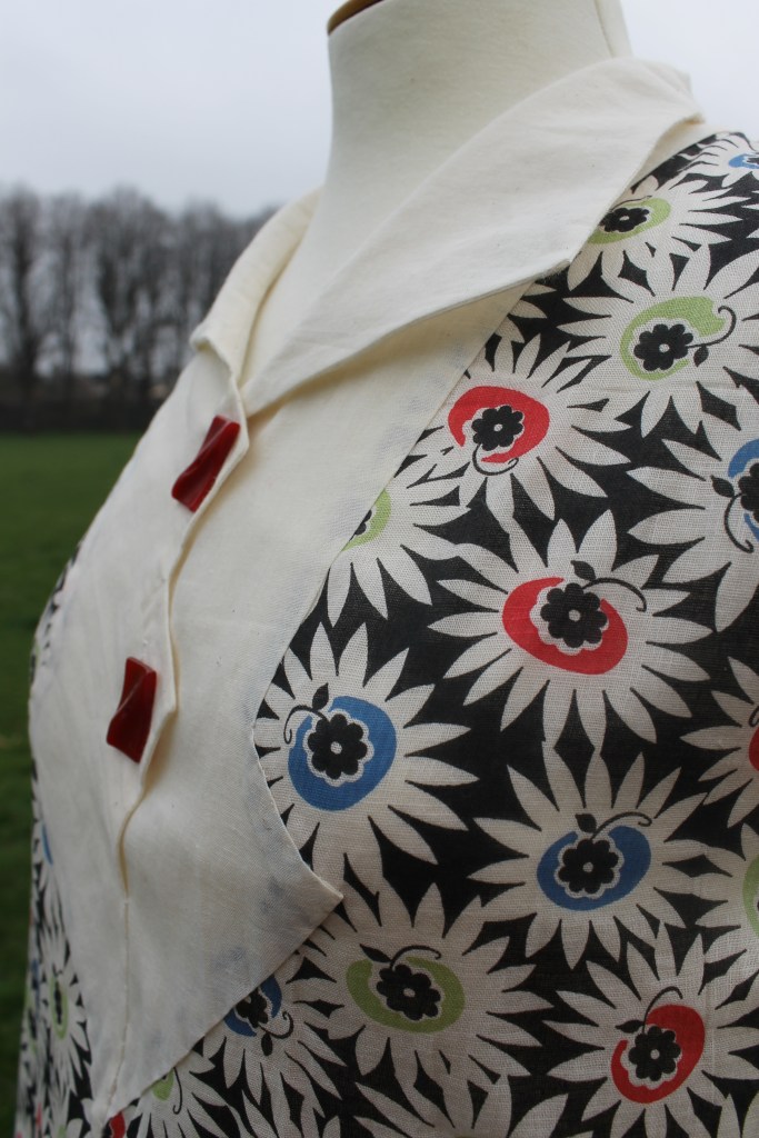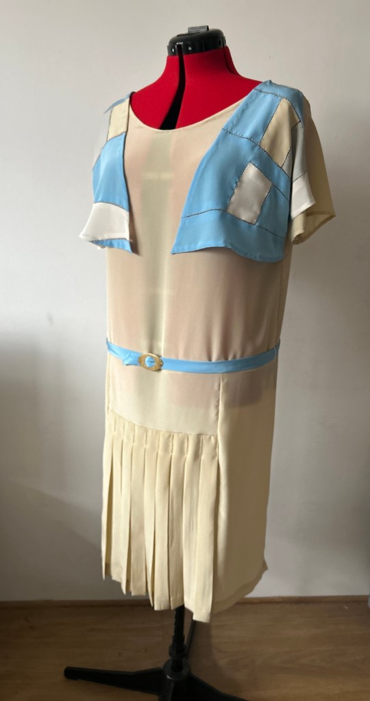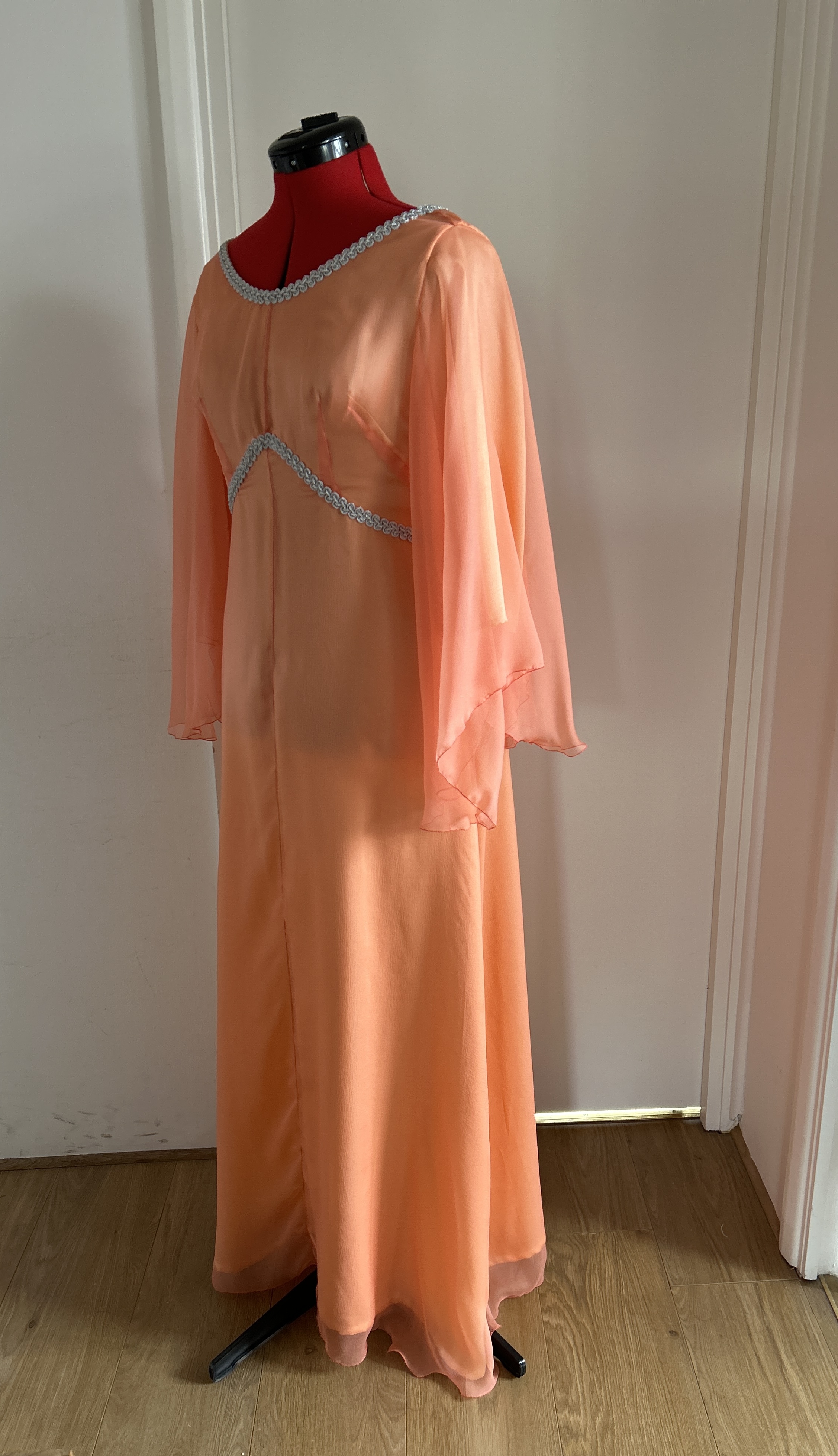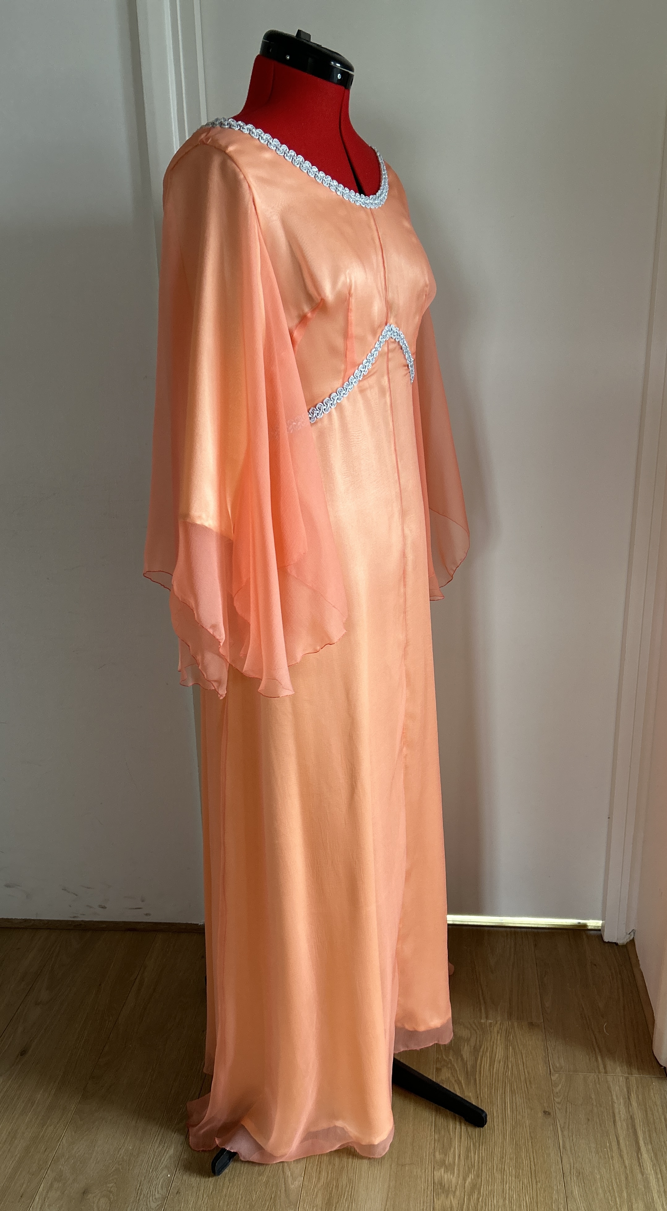 There is a slight Ancient Grecian feel to it, favoured by the designers in the 1930s, combined with the art deco style of the period, here the bias cut gown with the asymmetric diagonally cut neckline and the diagonally cut panels in bodice and skirt forming a peak at the left side of the waistline, a feature very typical of the era. With two deep long darts along the sides of the bodice and low cut back.