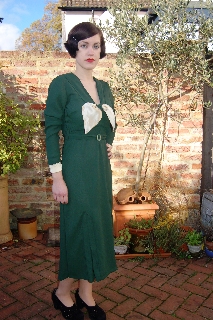 Today, to coincide with the 87th anniversary of the wedding, here I present my version of the famous dress that was featured at the “Guts for Garters- the Royal We” exhibition in 2011 at the Cob Gallery in London. Made in light coloured cornflower blue viscose rayon crepe, it features a gathered and tailored bodice with a high neckline, long sleeves and fabric covered buttons closure down the front. The floor length skirt with a centre seam is fashionably cut on the bias. Side snap closure on the side.