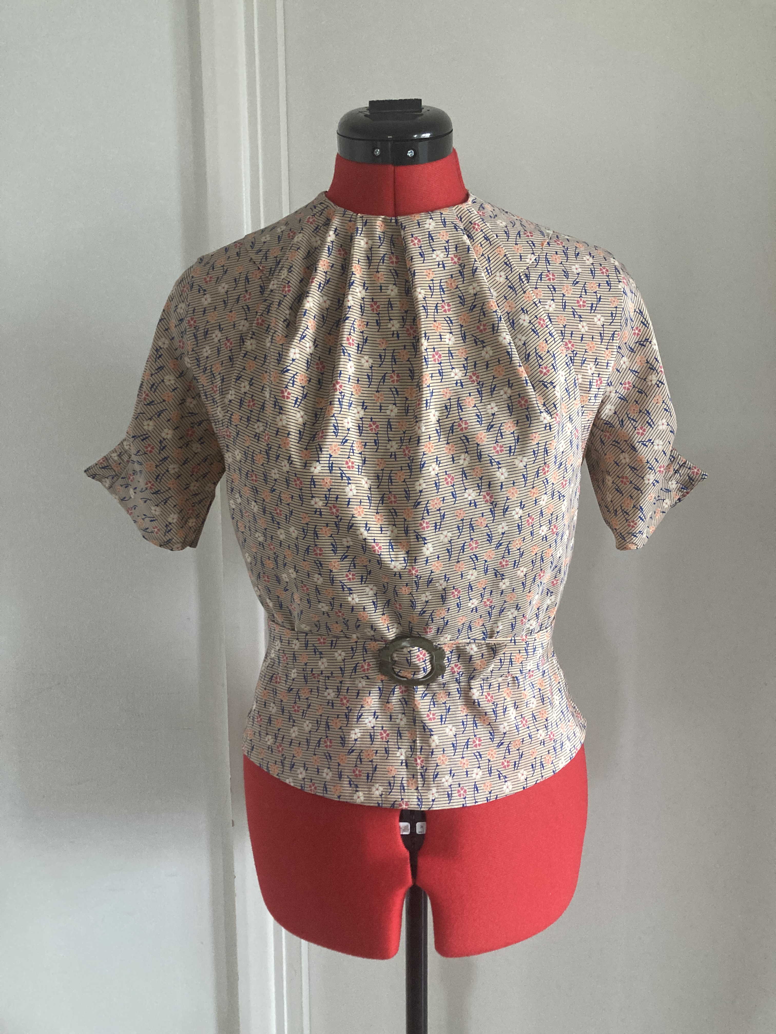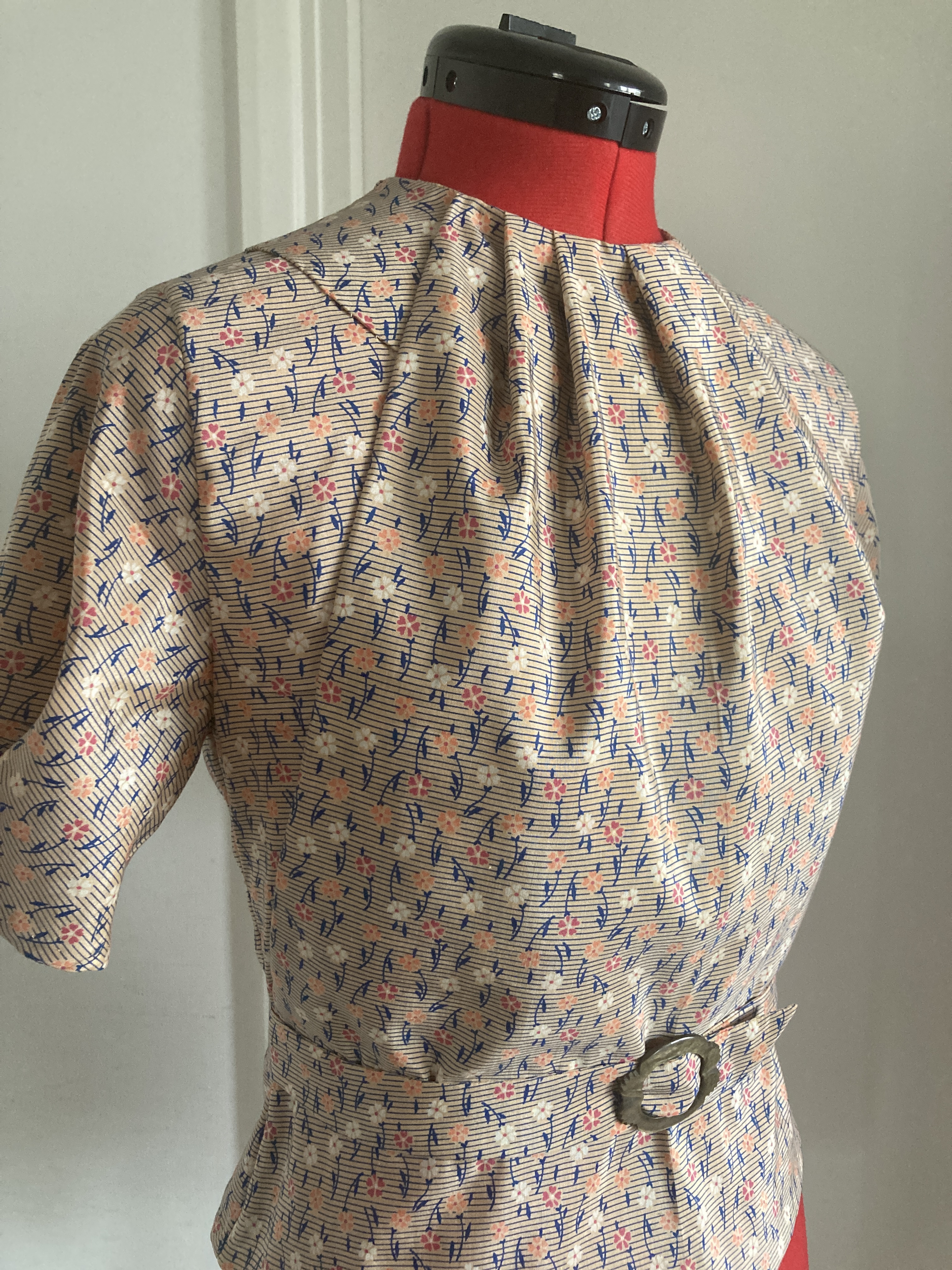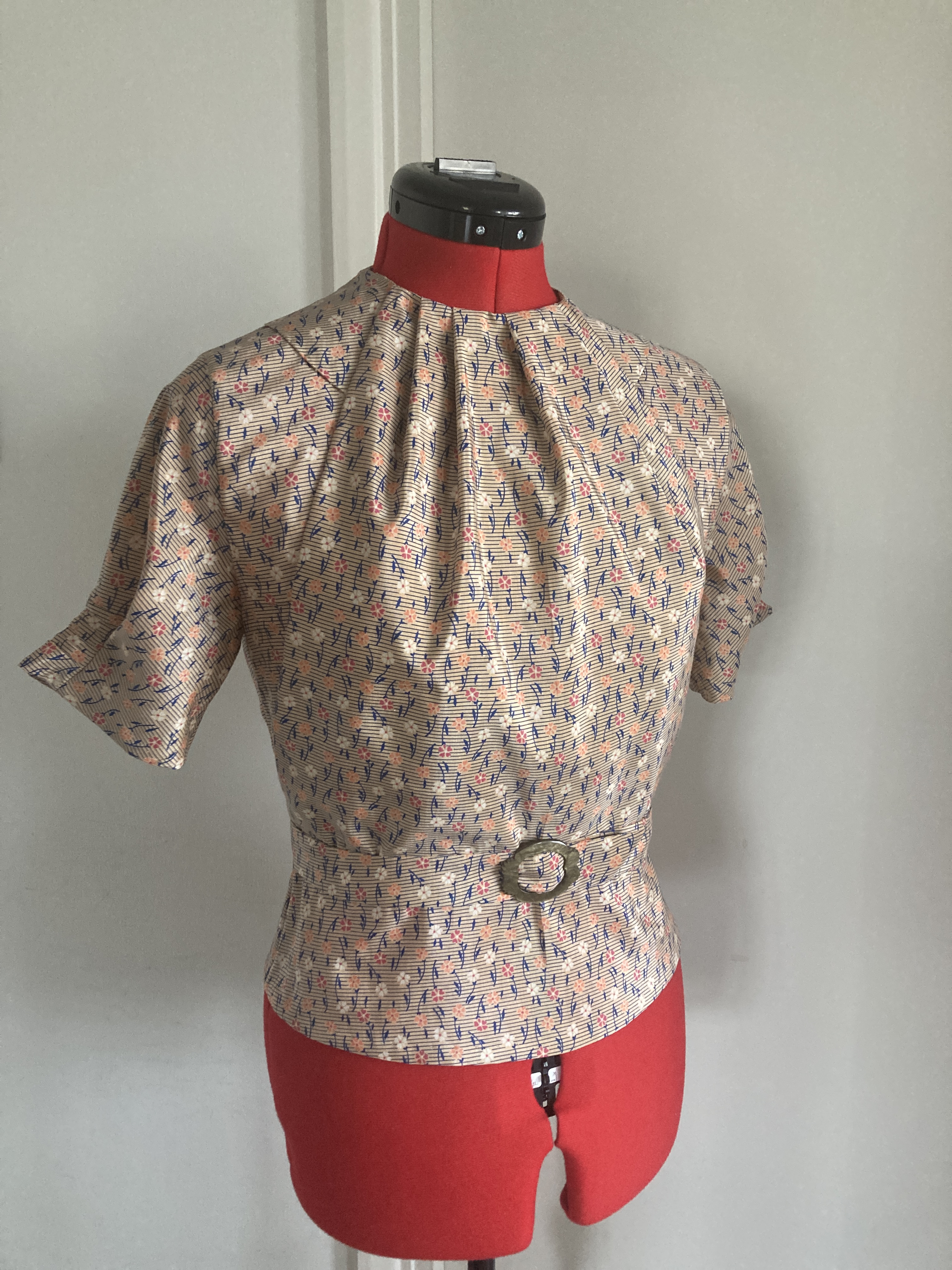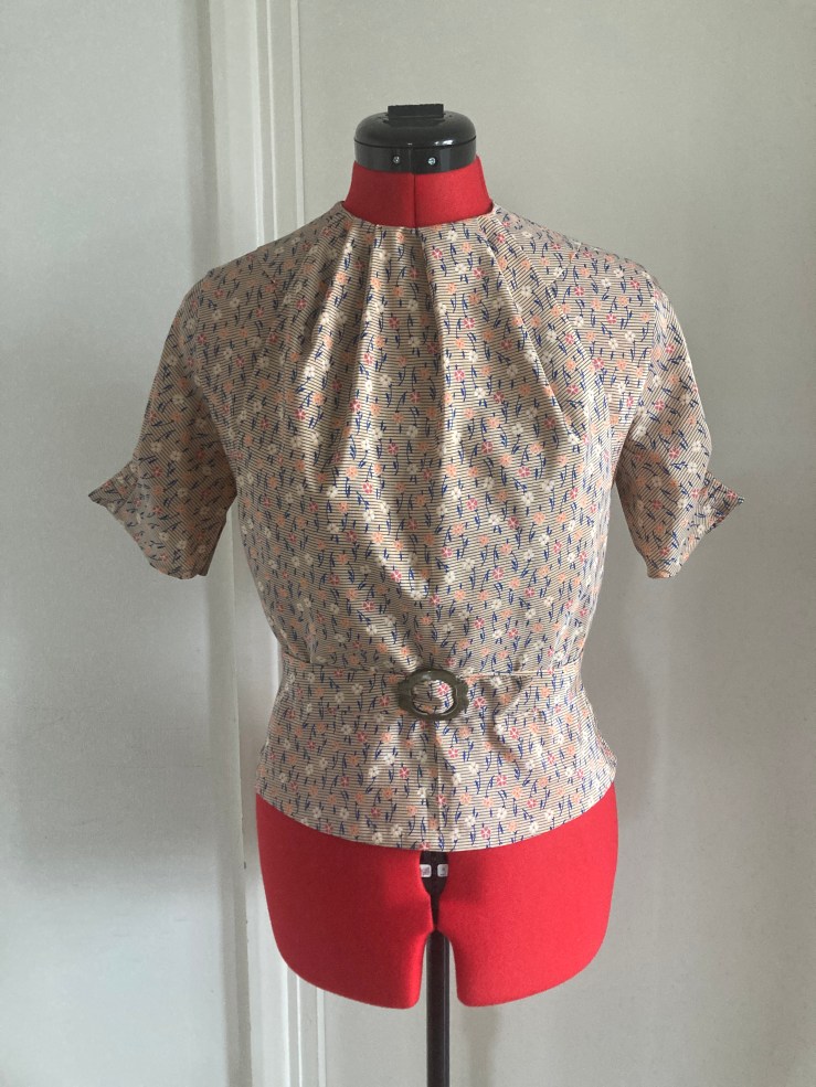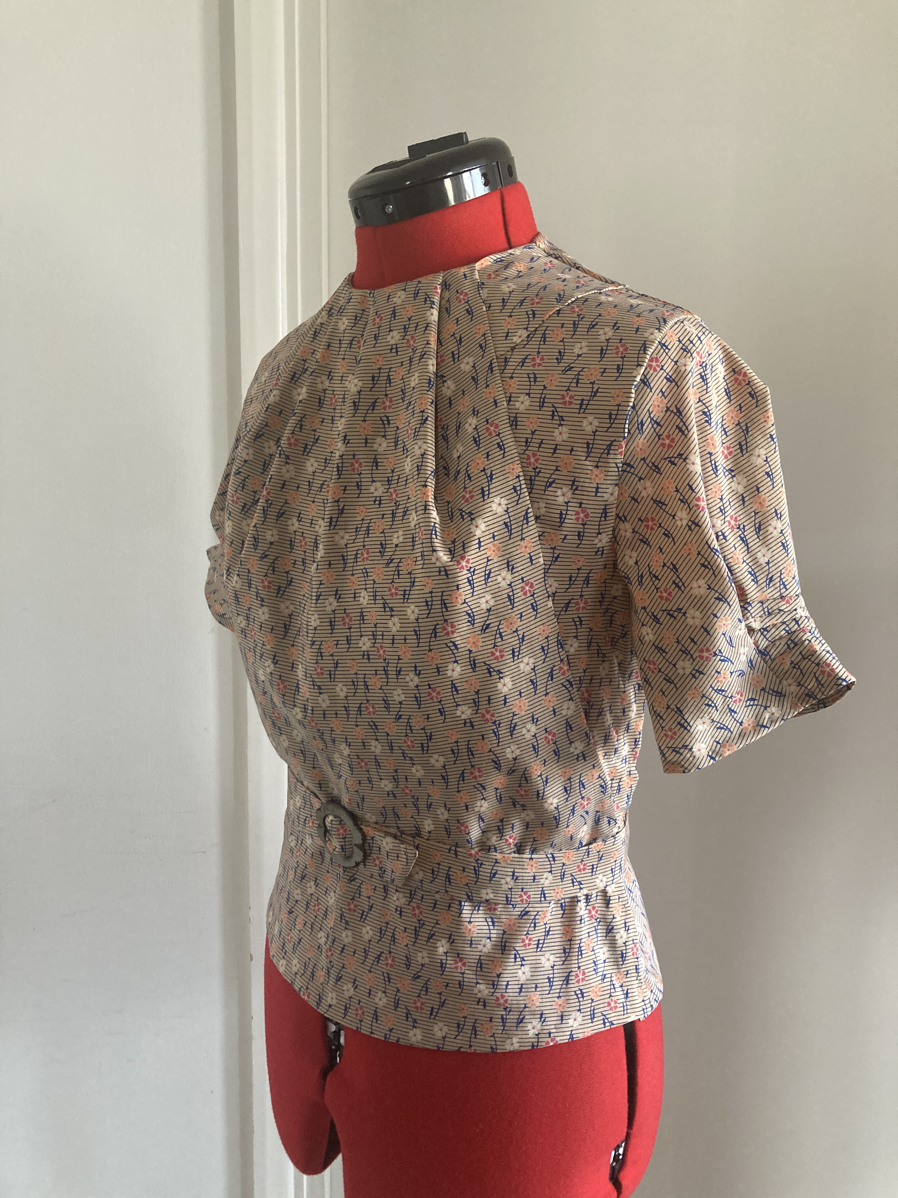 “Alma” and “Edna” are bias cut cotton blouses, very popular in the 1930s, with short sleeves featuring geometric cuffs and a pair of vintage buttons. The collar has a central flap, secured by a vintage button, and the belt has a vintage bakelite buckle. Hook and eye closure at the back of the round collar. They also have a little side pocket with a button and darts down the front of the blouse.