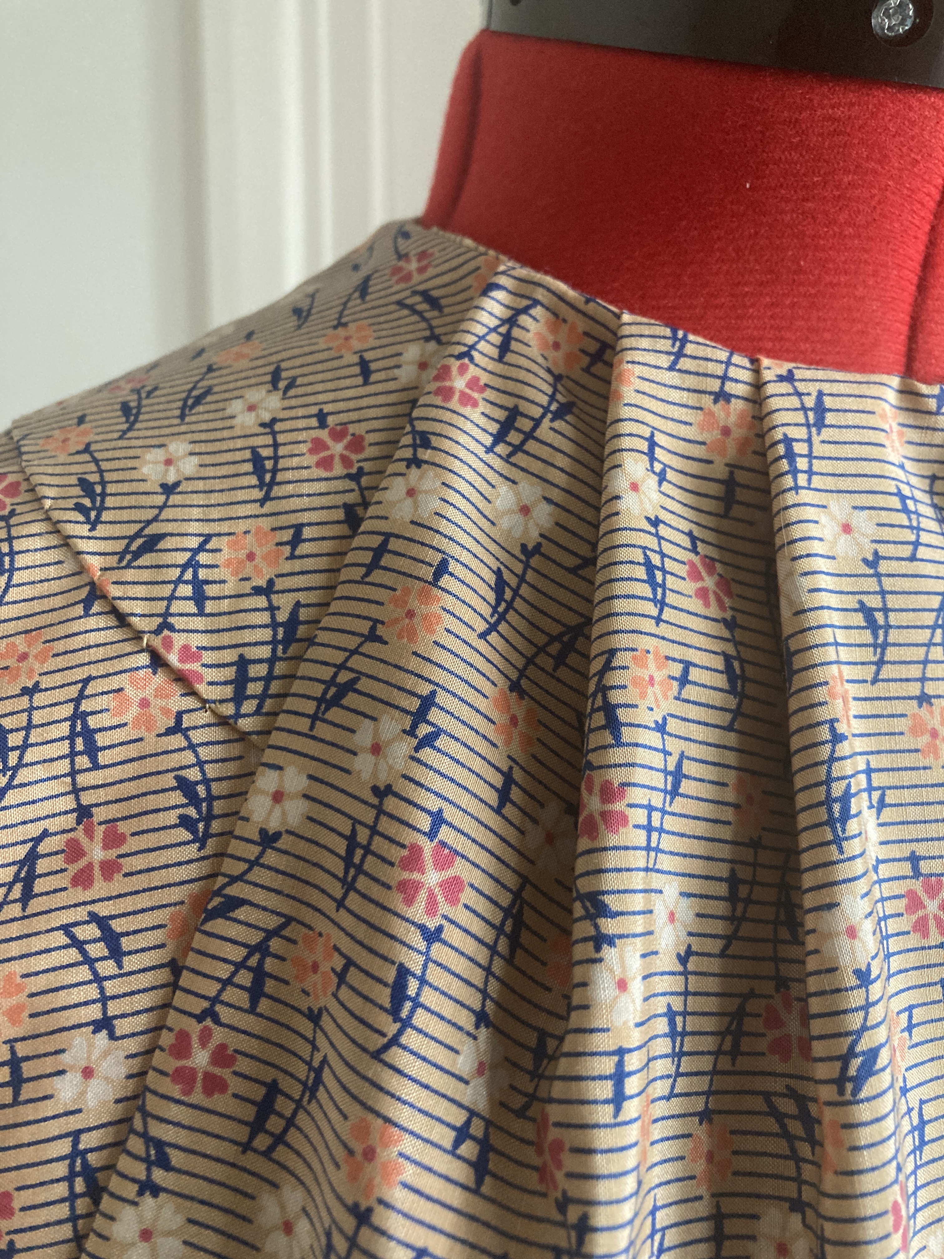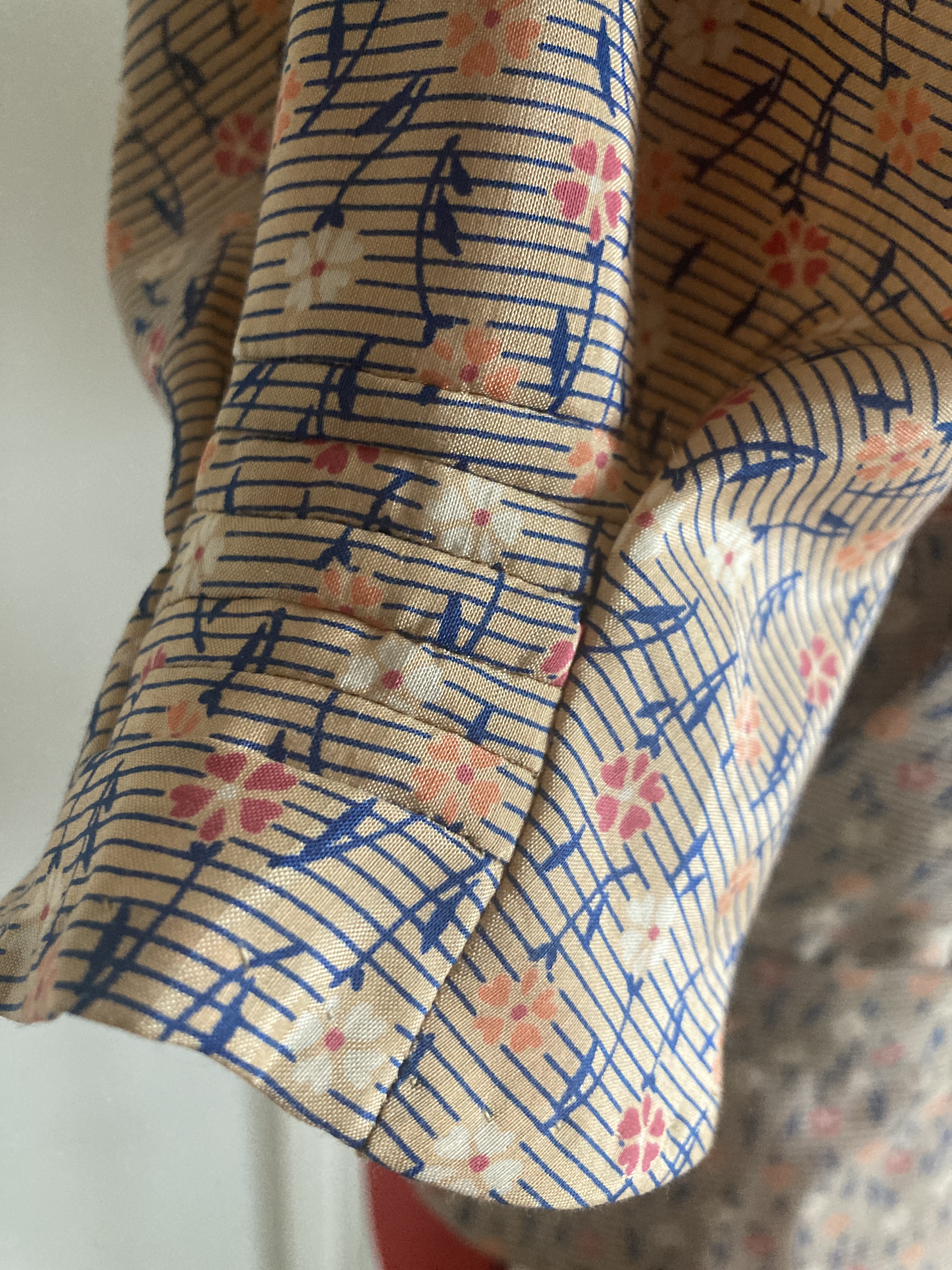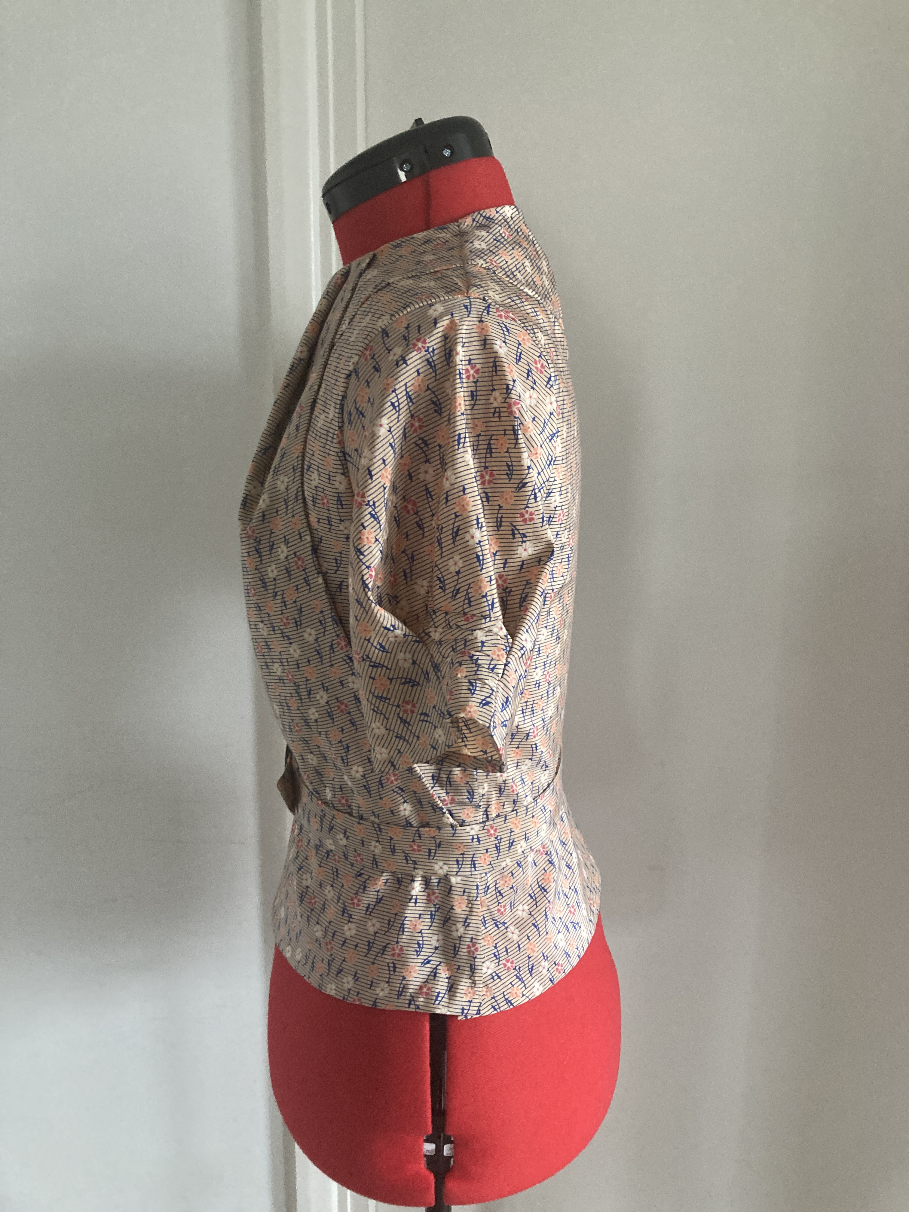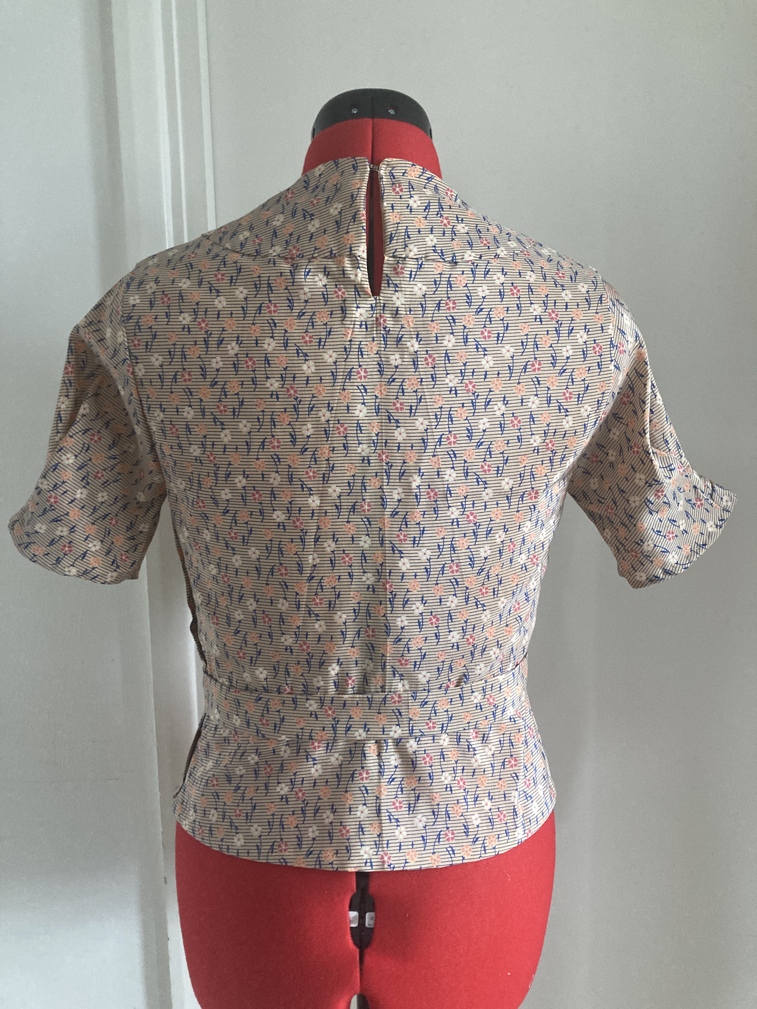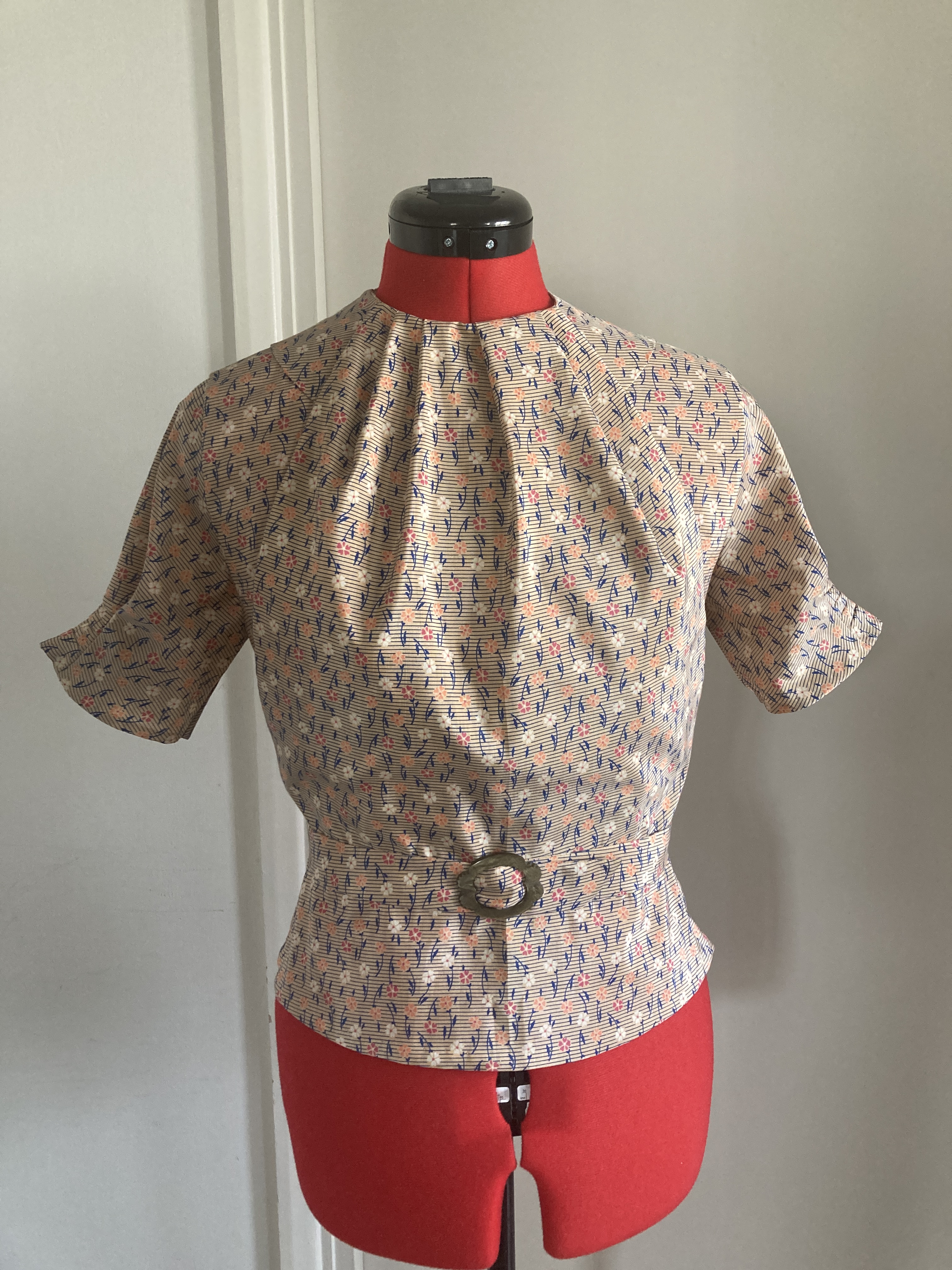 “Alma” and “Edna” are bias cut cotton blouses, very popular in the 1930s, with short sleeves featuring geometric cuffs and a pair of vintage buttons. The collar has a central flap, secured by a vintage button, and the belt has a vintage bakelite buckle. Hook and eye closure at the back of the round collar. They also have a little side pocket with a button and darts down the front of the blouse.