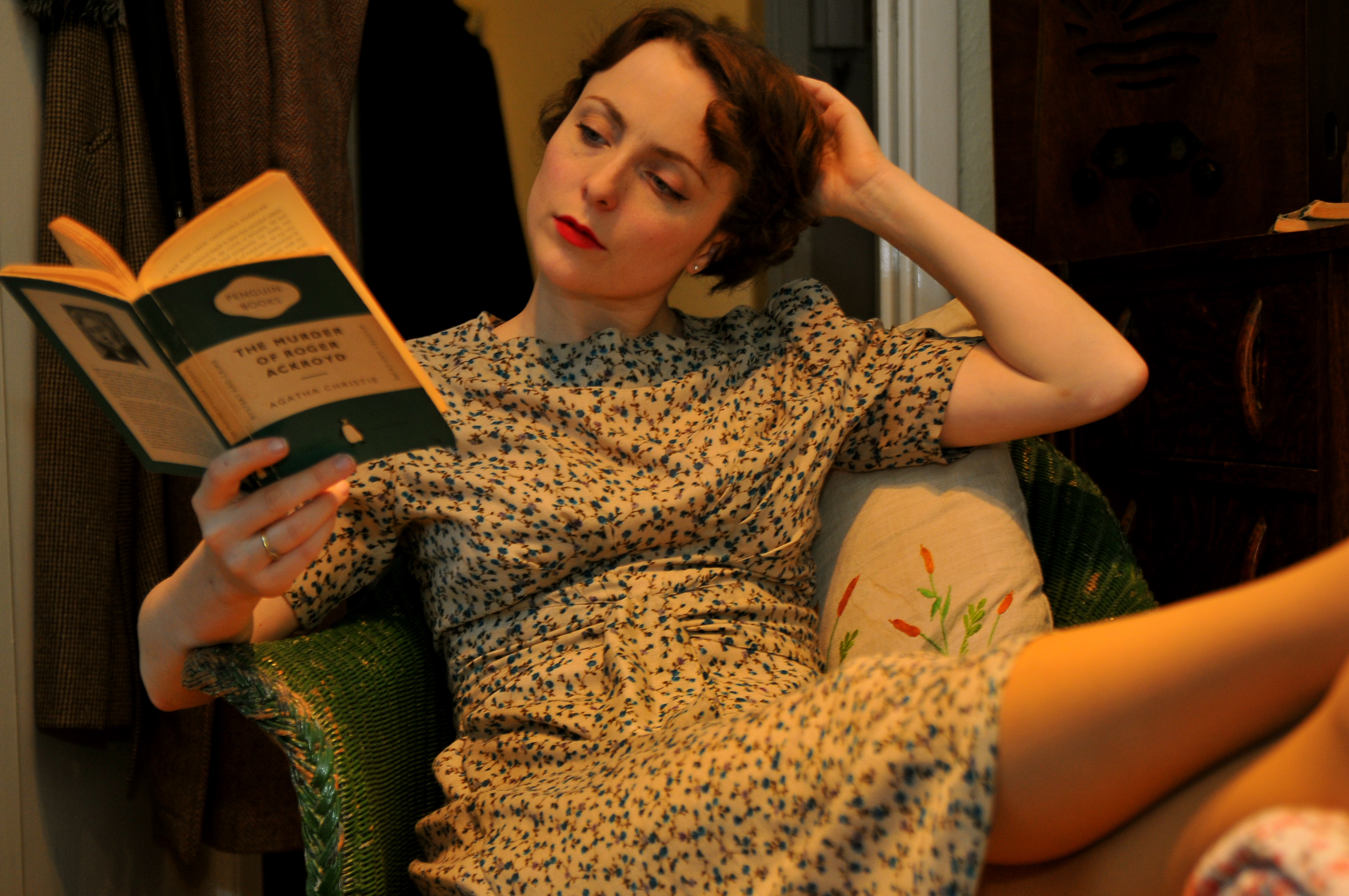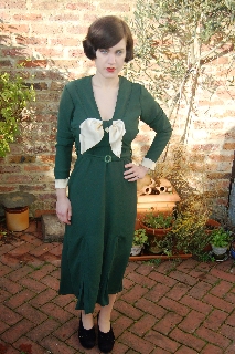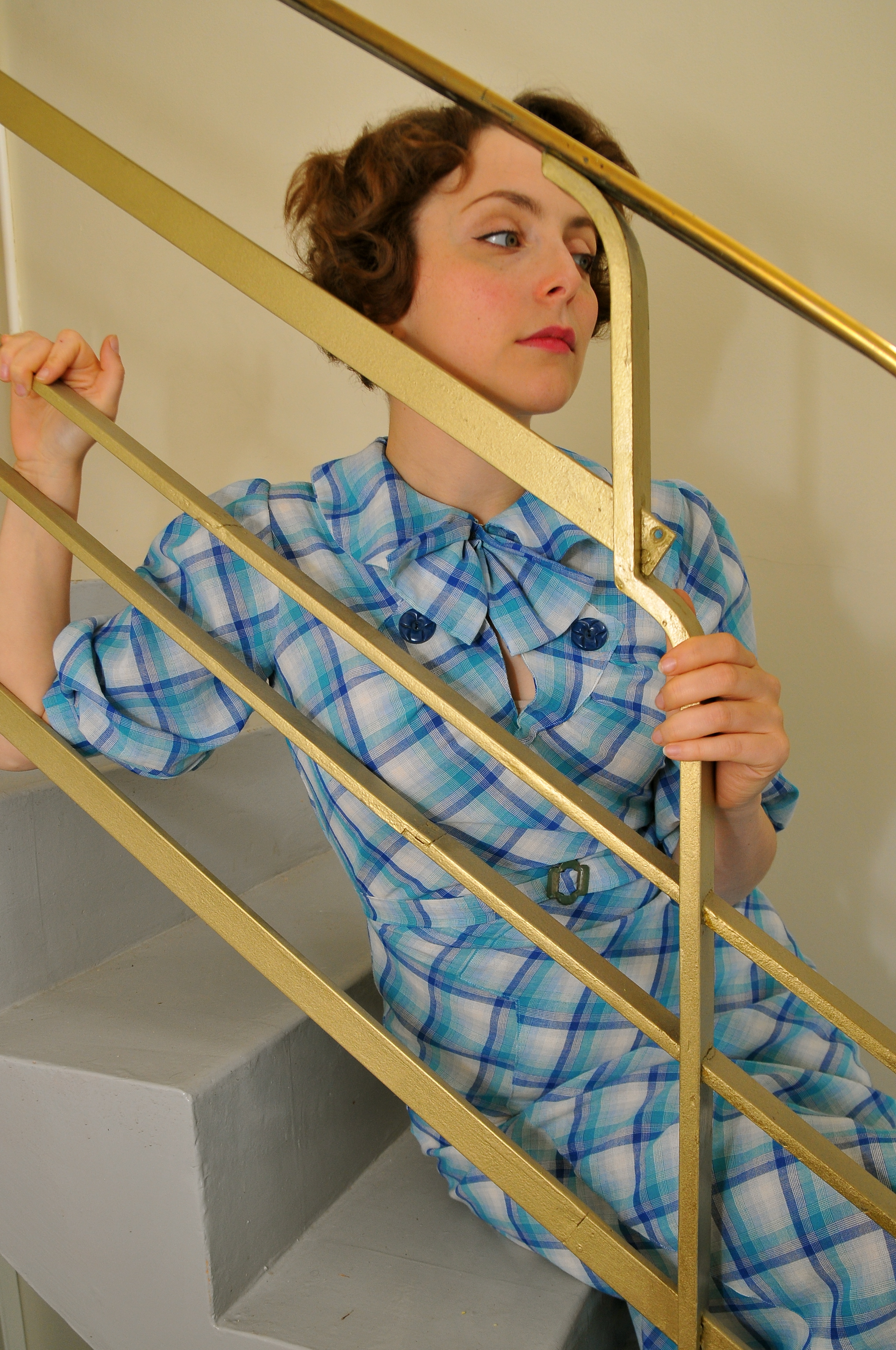 Stripes, stripes, stripes. The contrasting geometric Art Deco style yokes and pocket in this lovely mid-1930s style blouse in sheer navy and cream striped rayon, lowered bell sleeves and the front row of original black vintage glass buttons create the perfect match to wear with your 1930s half calf length skirt.