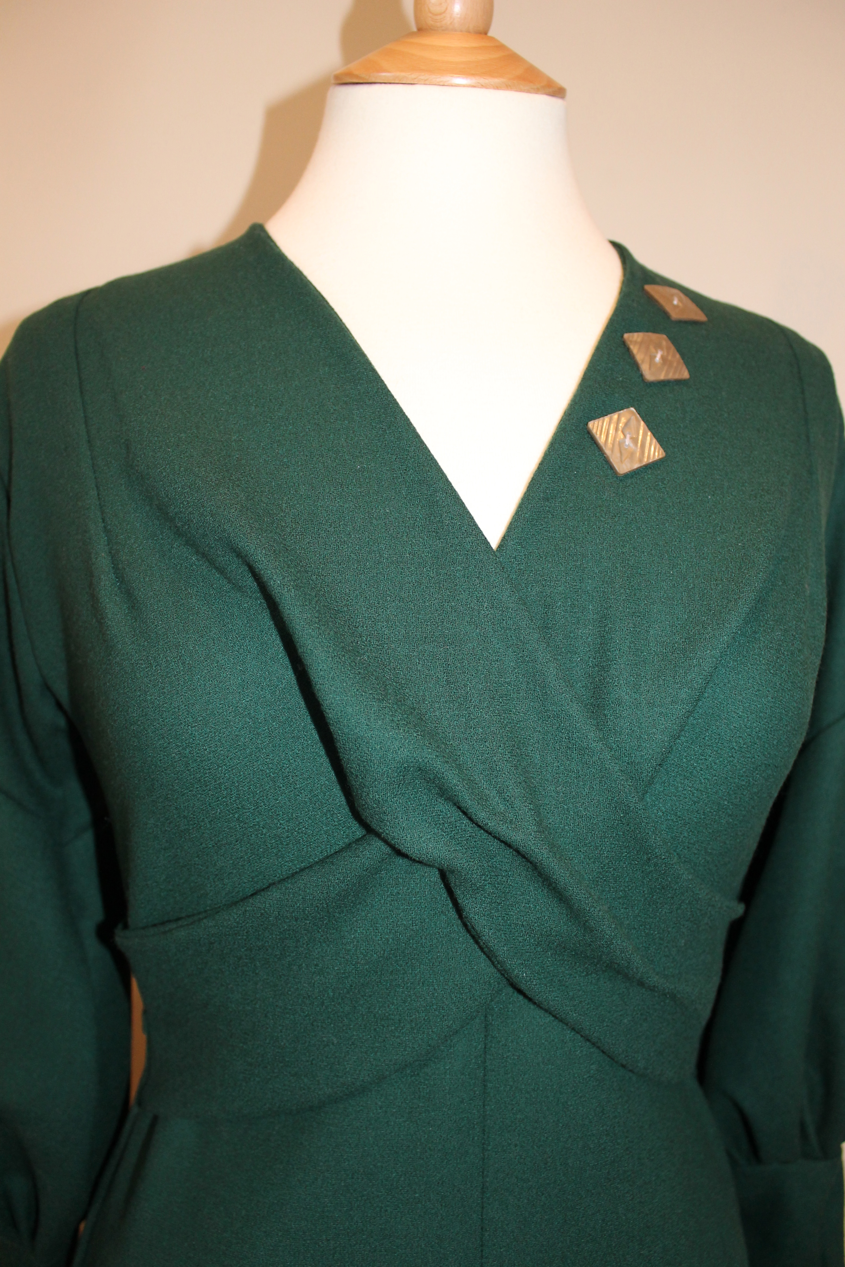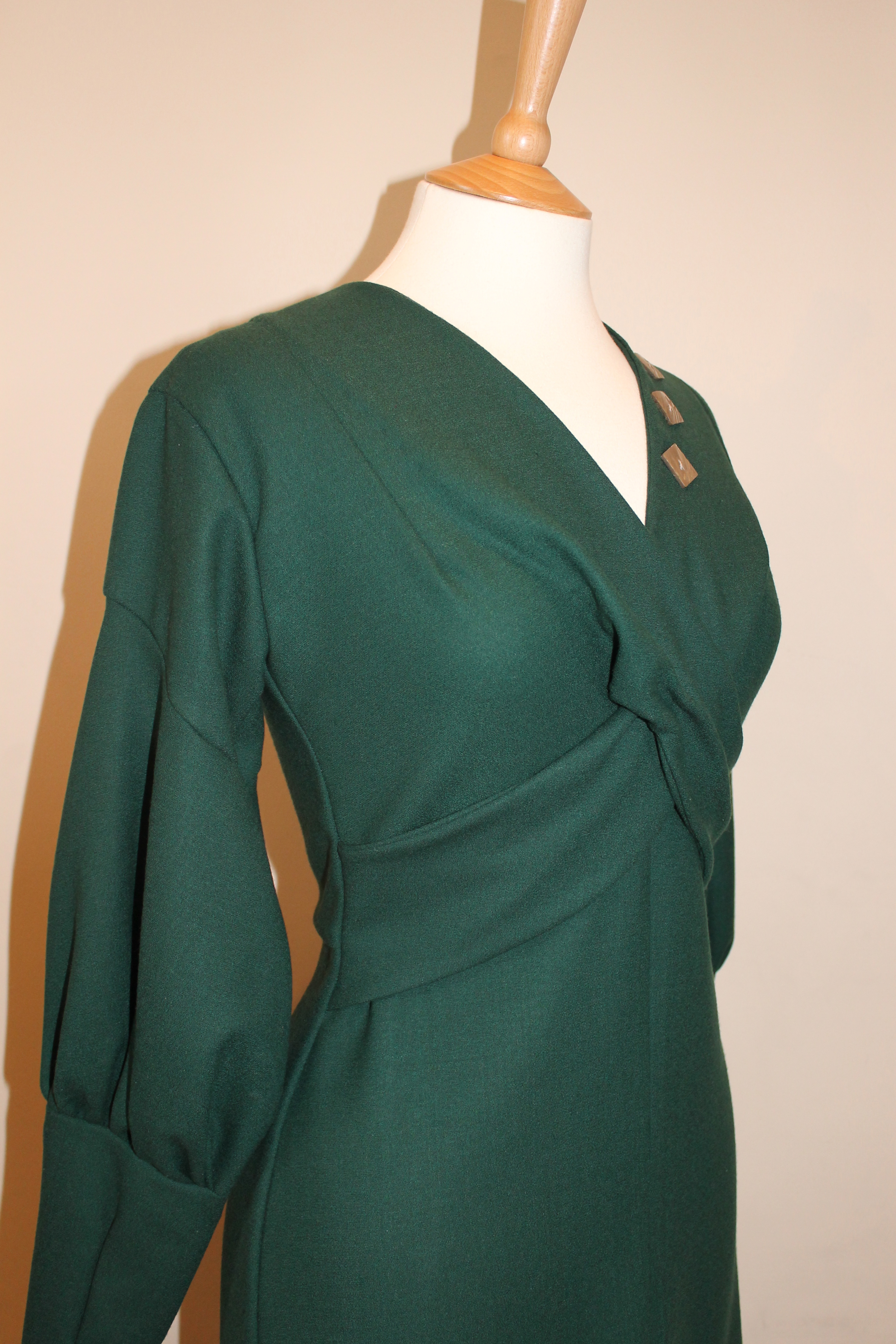 This lovely bottle green wool crepe mid- 1930s inspired dress is an adaptation from an earlier design of mine from 2009, here presented with long raglan cut bishop sleeves and contrasting cream silk cuffs.