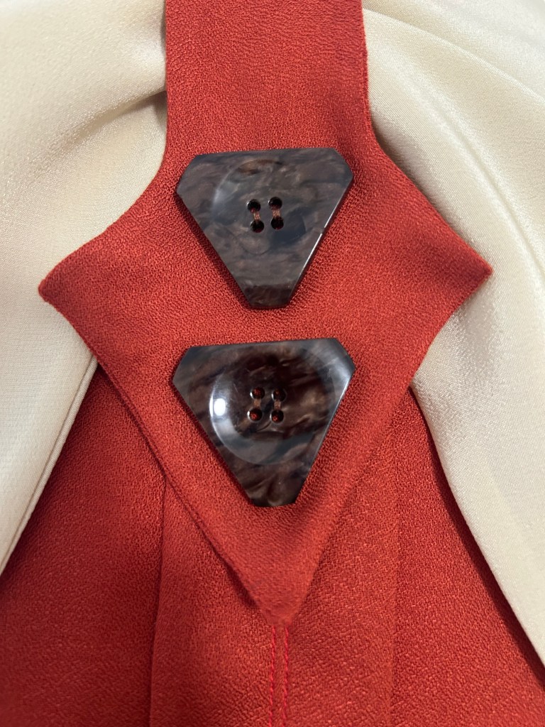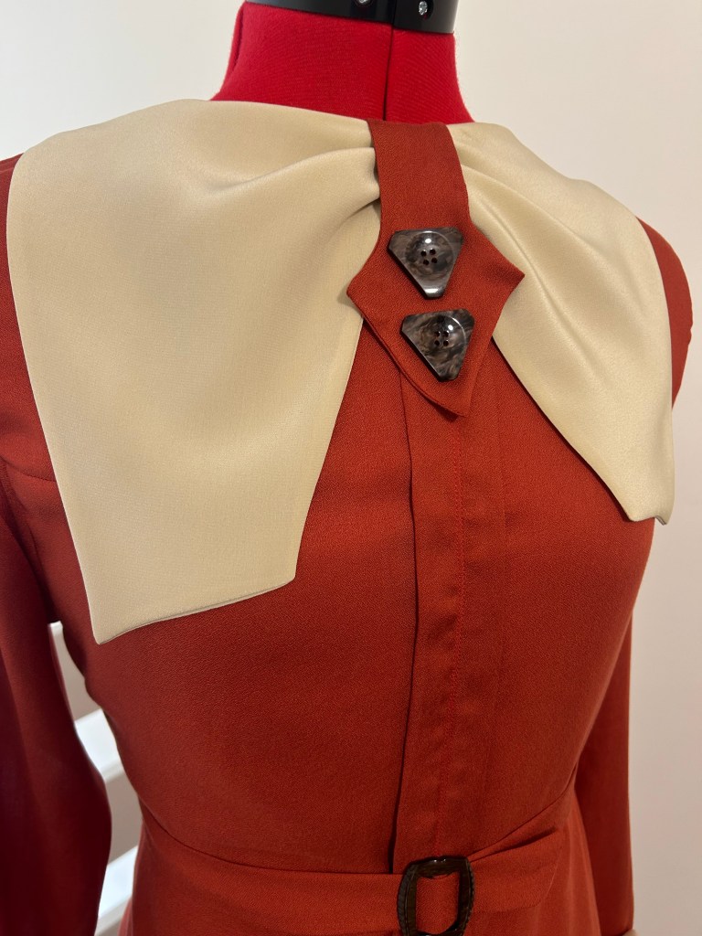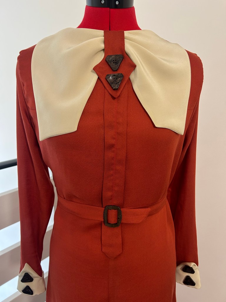 This early 1930s inspired burnt orange viscose rayon crepe beauty has all the elements of a dress of the era, with its long narrow sleeves that feature cream silk crepe de chine cuffs adorned with two triangle vintage bakelite buttons, also emphasising the triangle shape of the cuffs. Another set of buttons can be seen on the triangle shape flap on top of the collar holding together an impressive crepe de chine large bow which is attached to the shoulder seams of the bodice. Another noteworthy detail is the tie sewn on the central seam. The skirt features a long kick pleat. The collar fastens with hook and eye at the back. The belt features a bakelite buckle. The dress fastens with snap fasterners at the side seam.